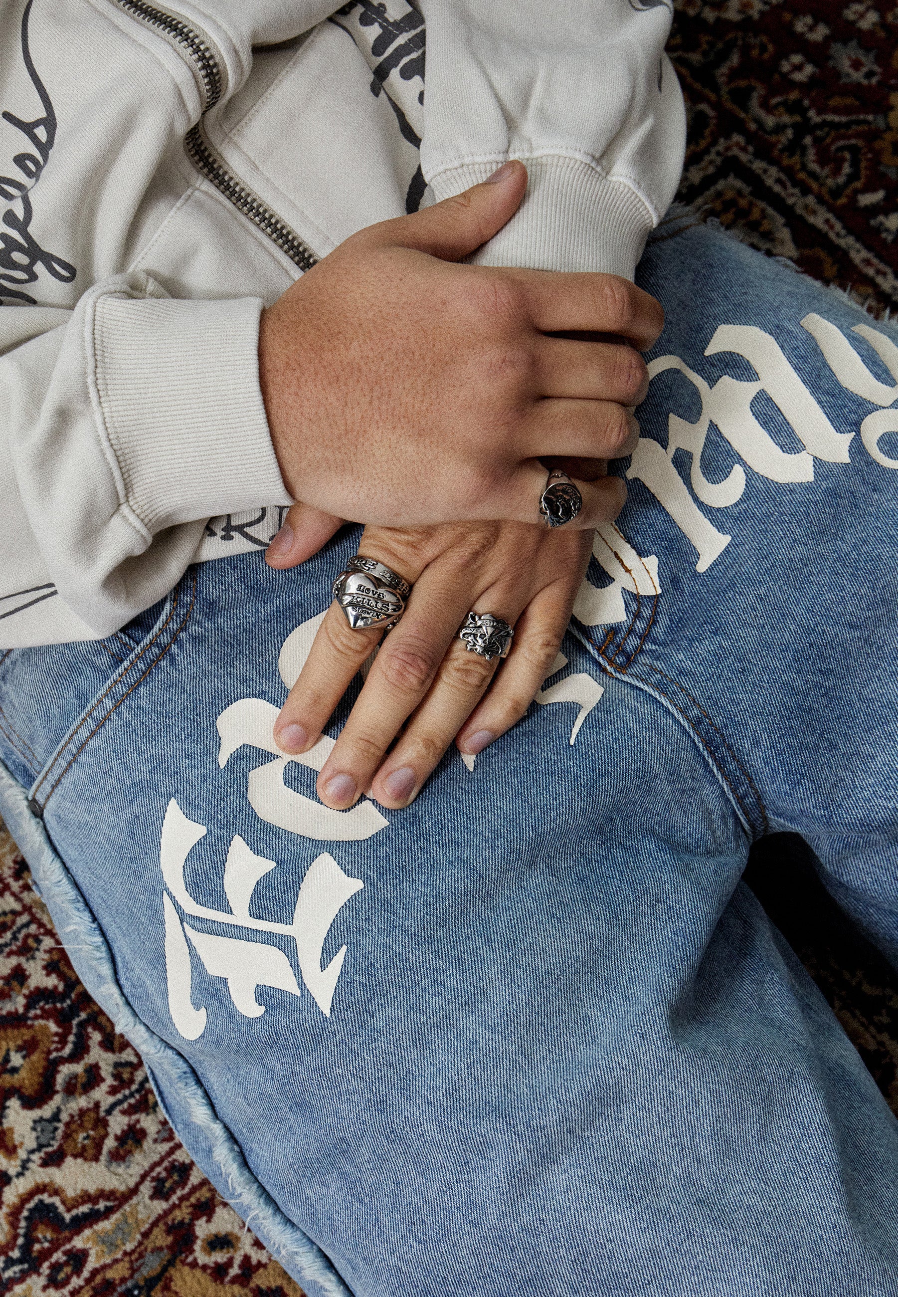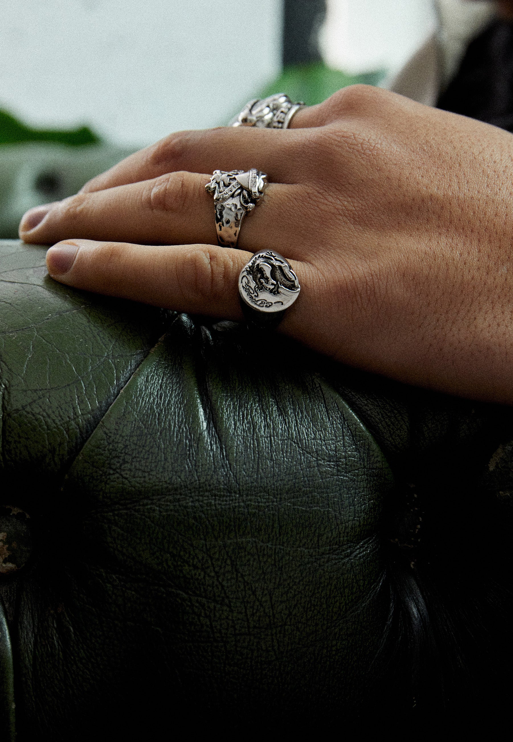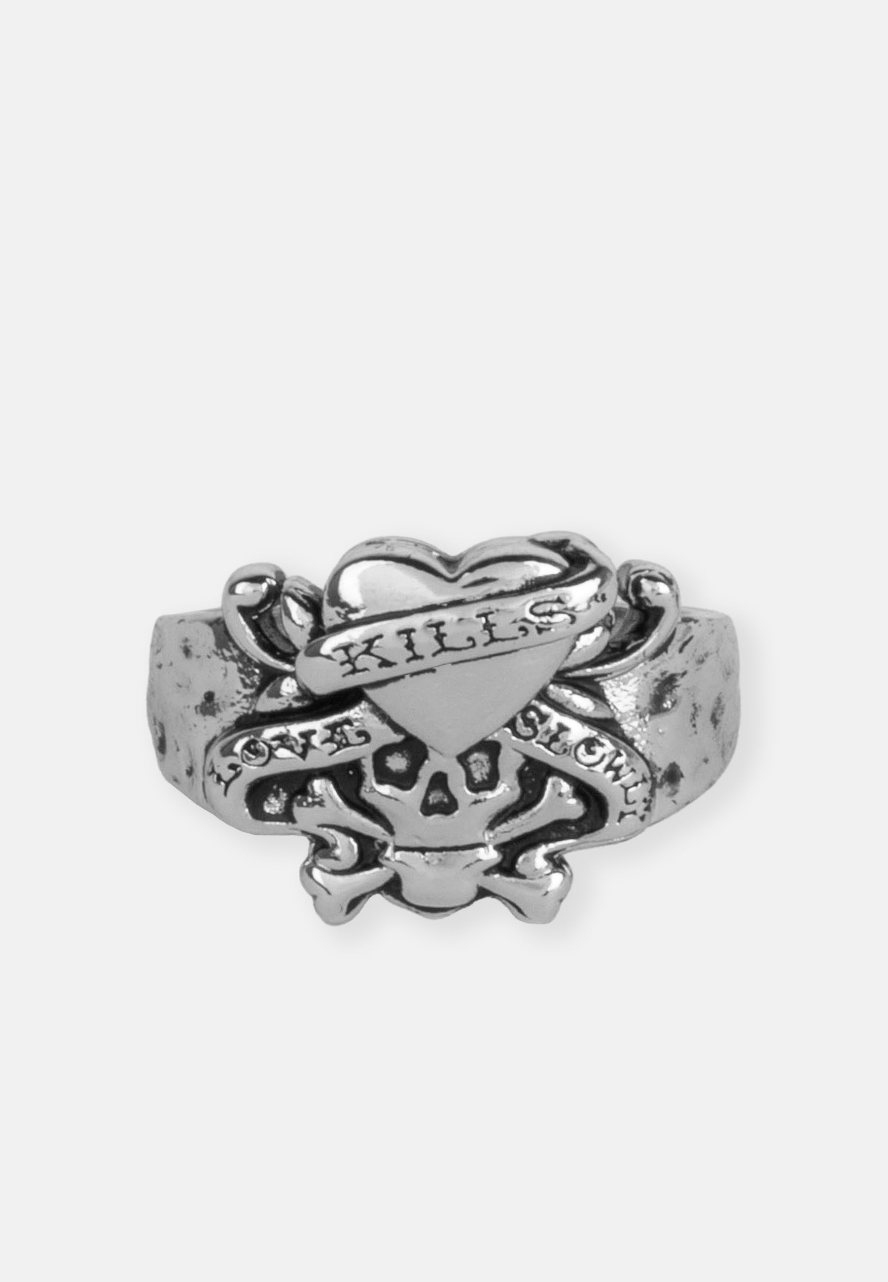 Ed Hardy custom cast textured signet ring with Don Ed Hardy 'Love Kills Slowly' Skull and Heart design, hand finished in a silver finish with antiqued engraved detailing.