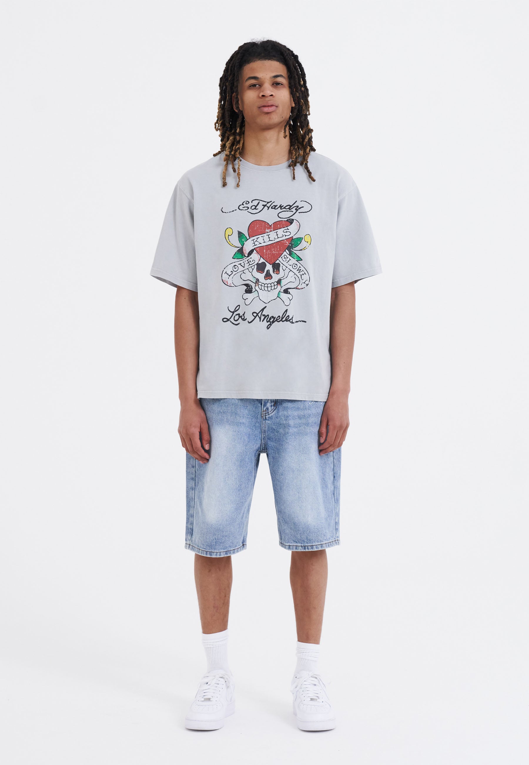 The Love-Kills Slowly T-shirt in Washed Grey is cut to an oversized fit and features one of The Don's most popular artworks, straight from the archive, in full-colour distressed print.