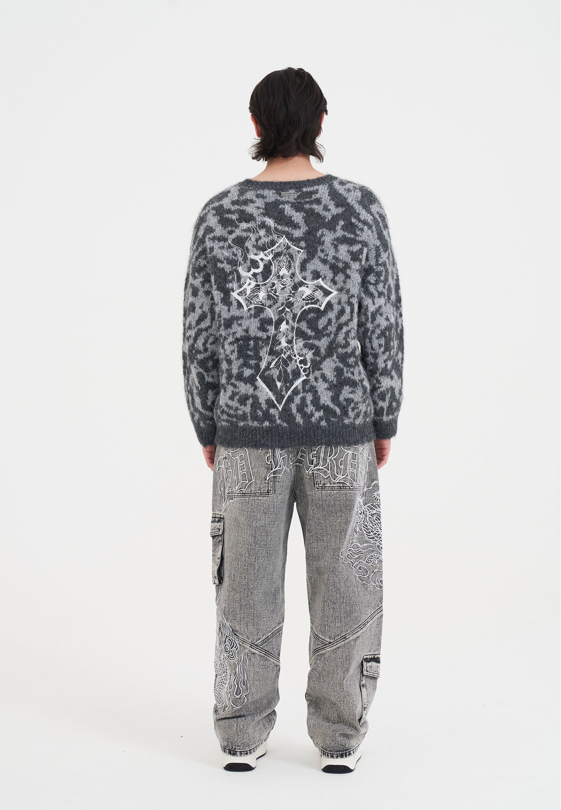 MENS INTARSIA LEOPARD KNITTED CREW JUMPER in Grey