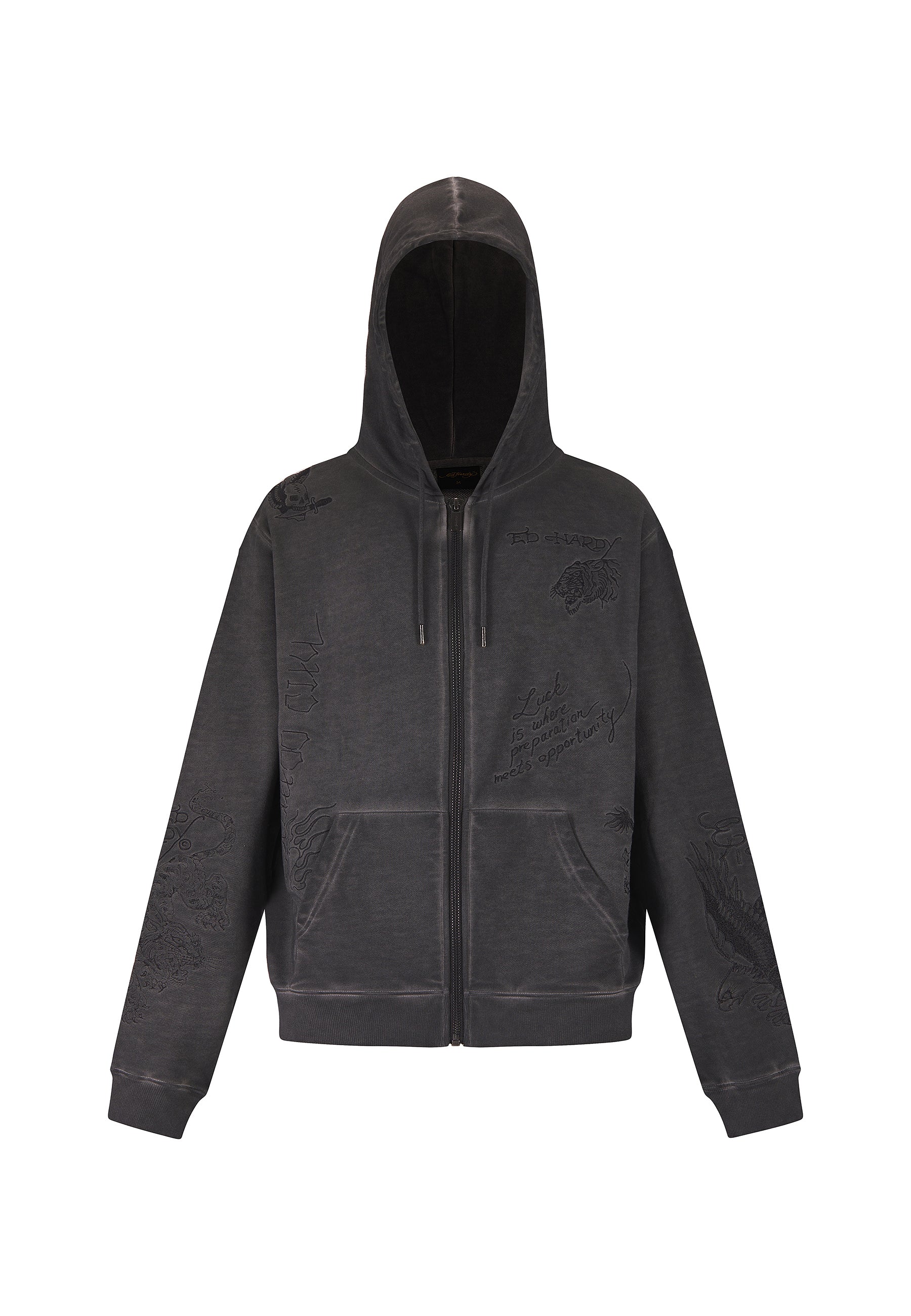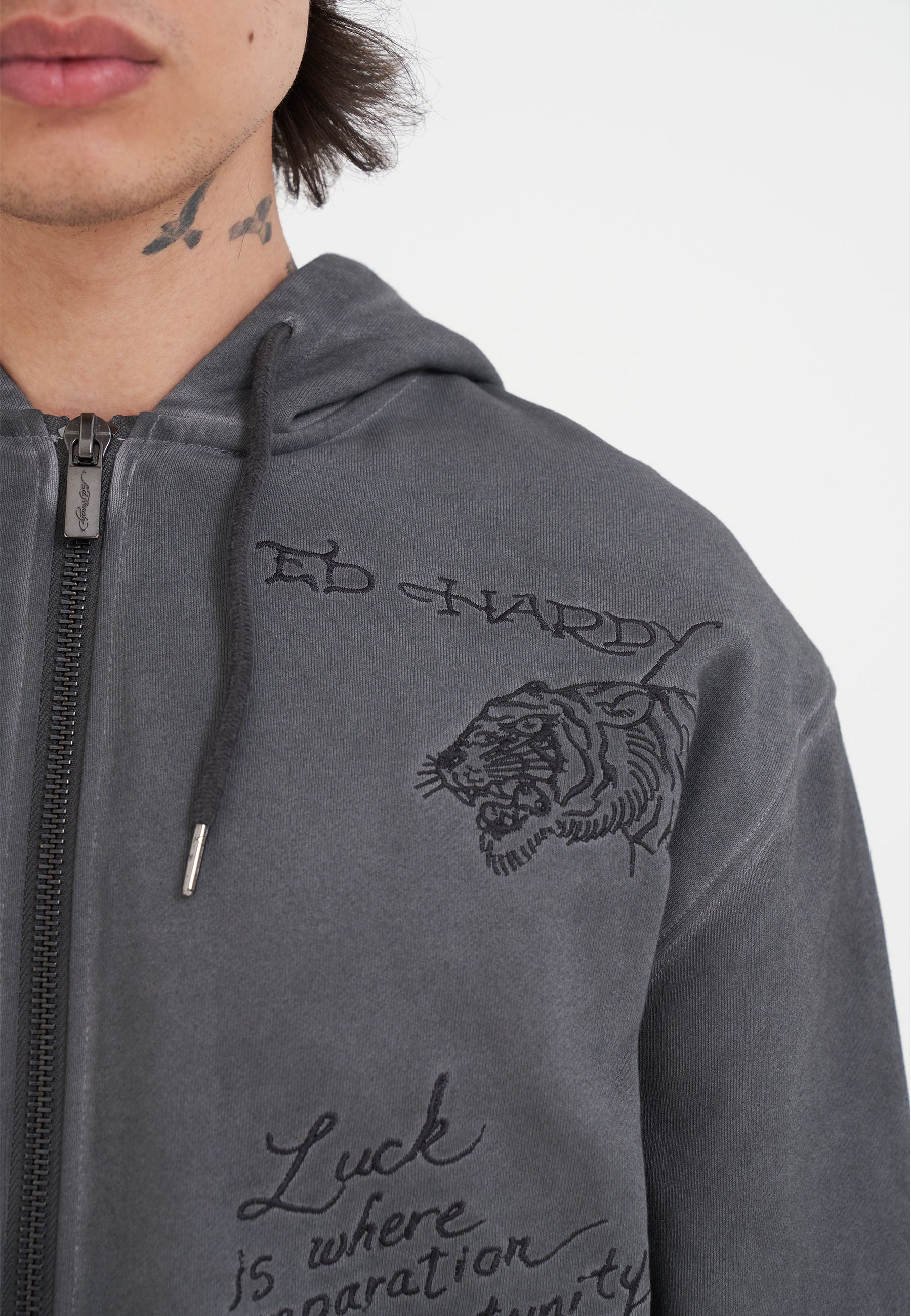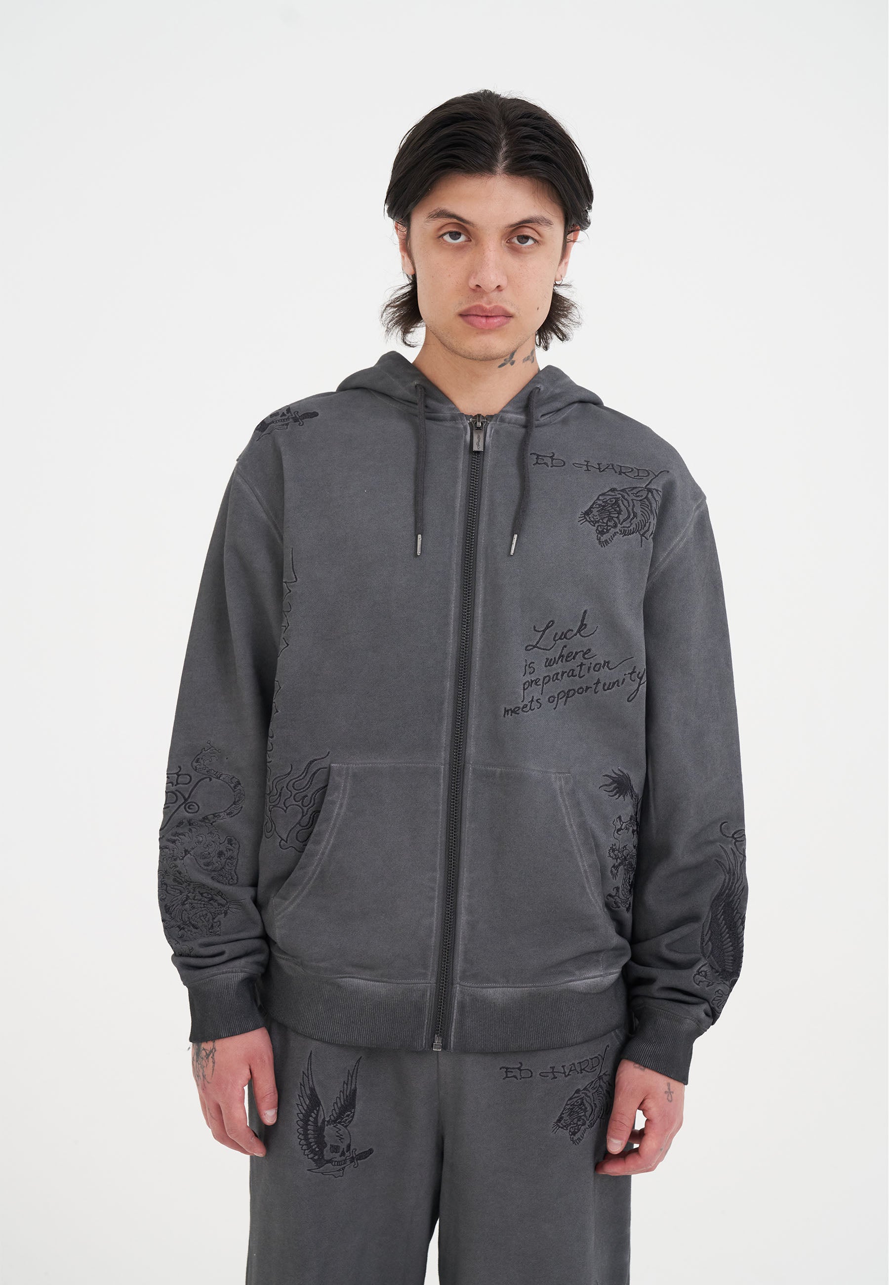 Mens Multiple Graphic Distress Zip Thru Hoodie - Grey
