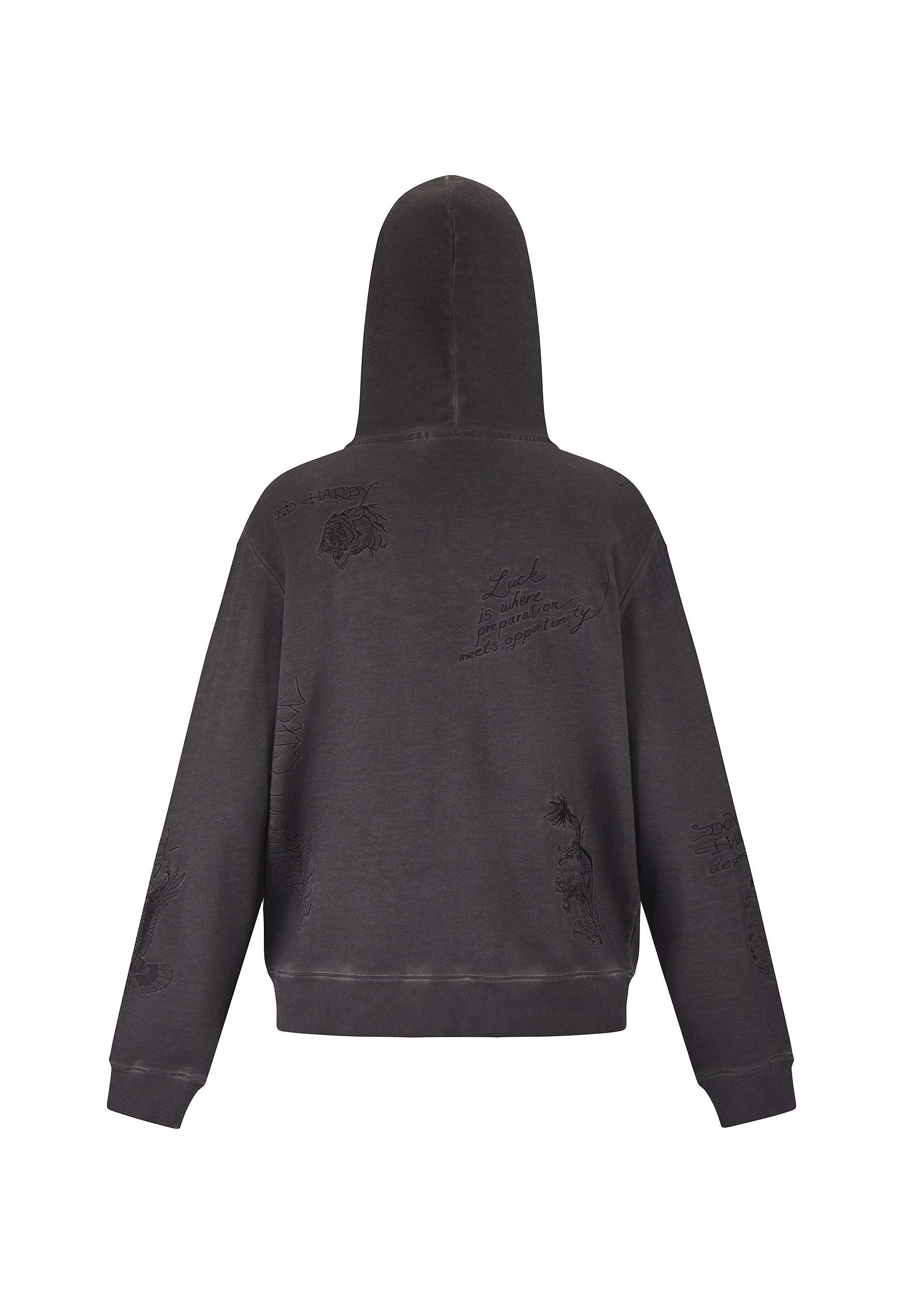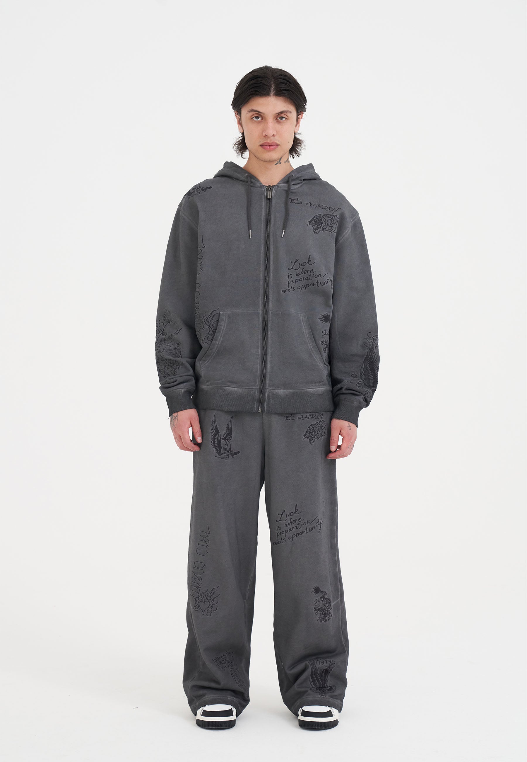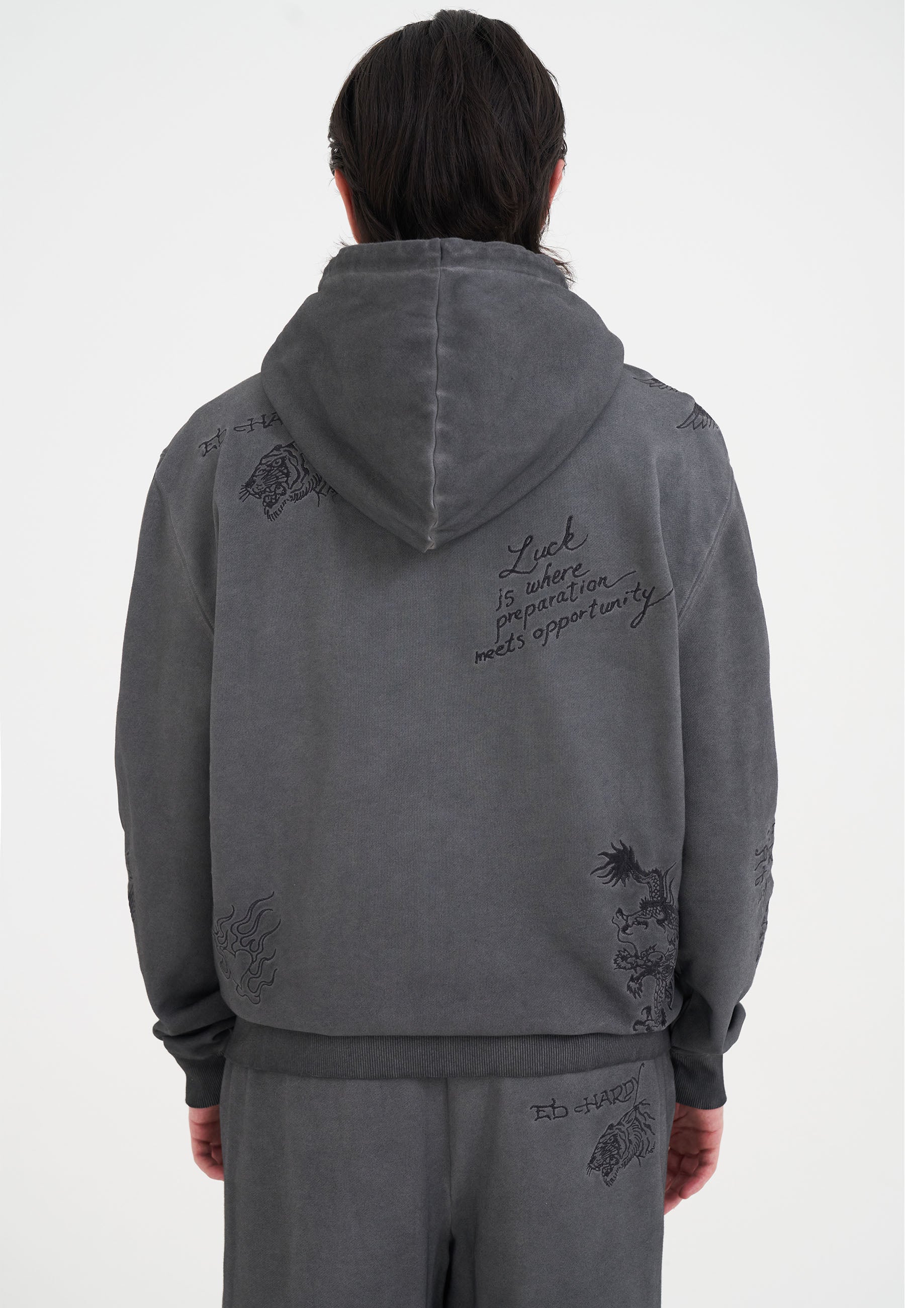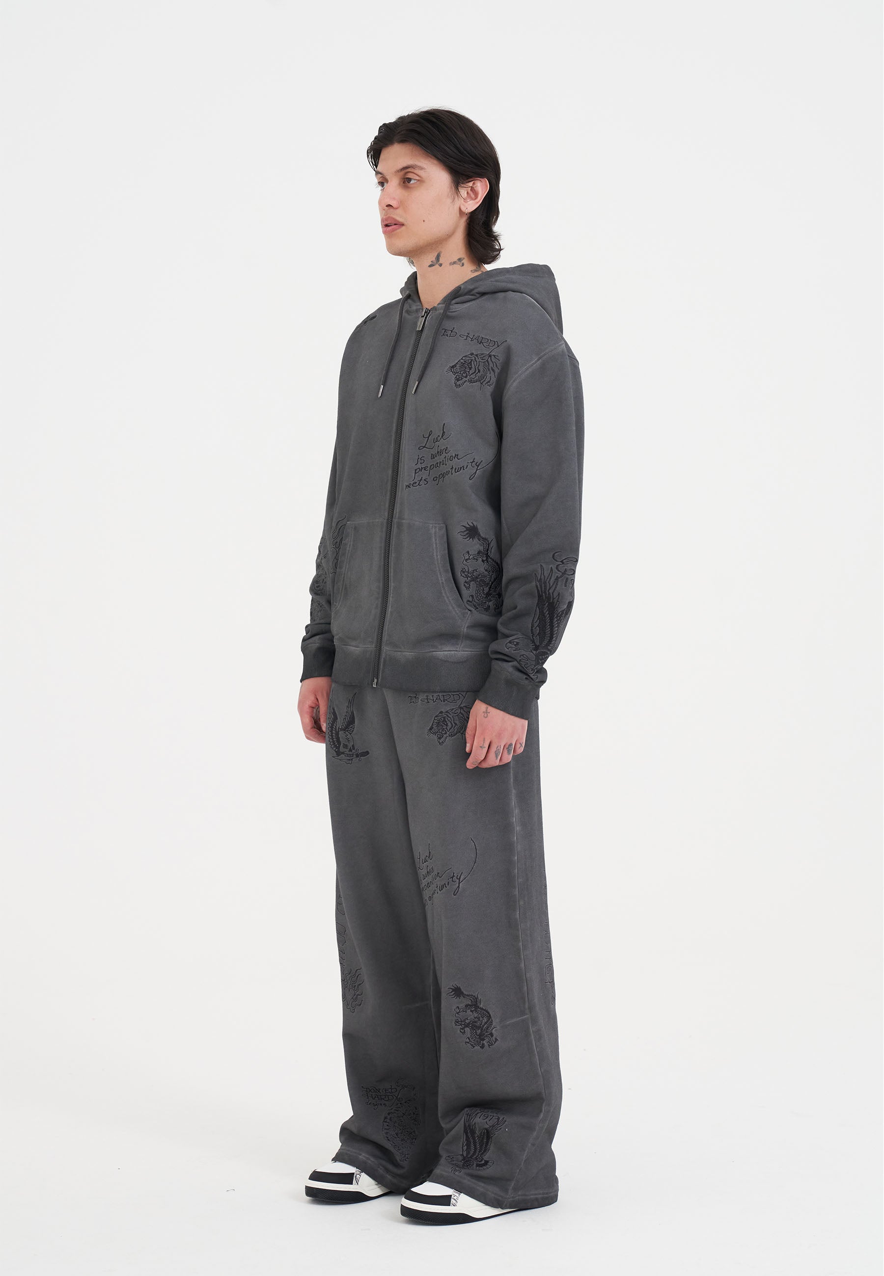 Mens Multiple Graphic Distress Zip Thru Hoodie - Grey