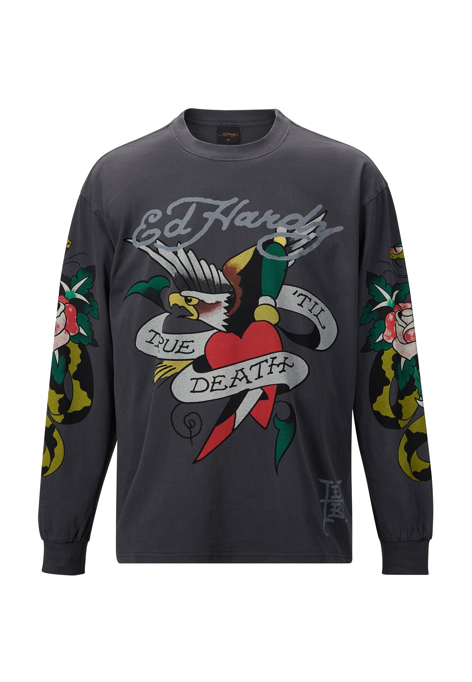 Note Ed's iconic design DNA; striking red, yellow and greens throughout an Eagle & Heart tattoo design, against a heavy contrast Washed Black tee.