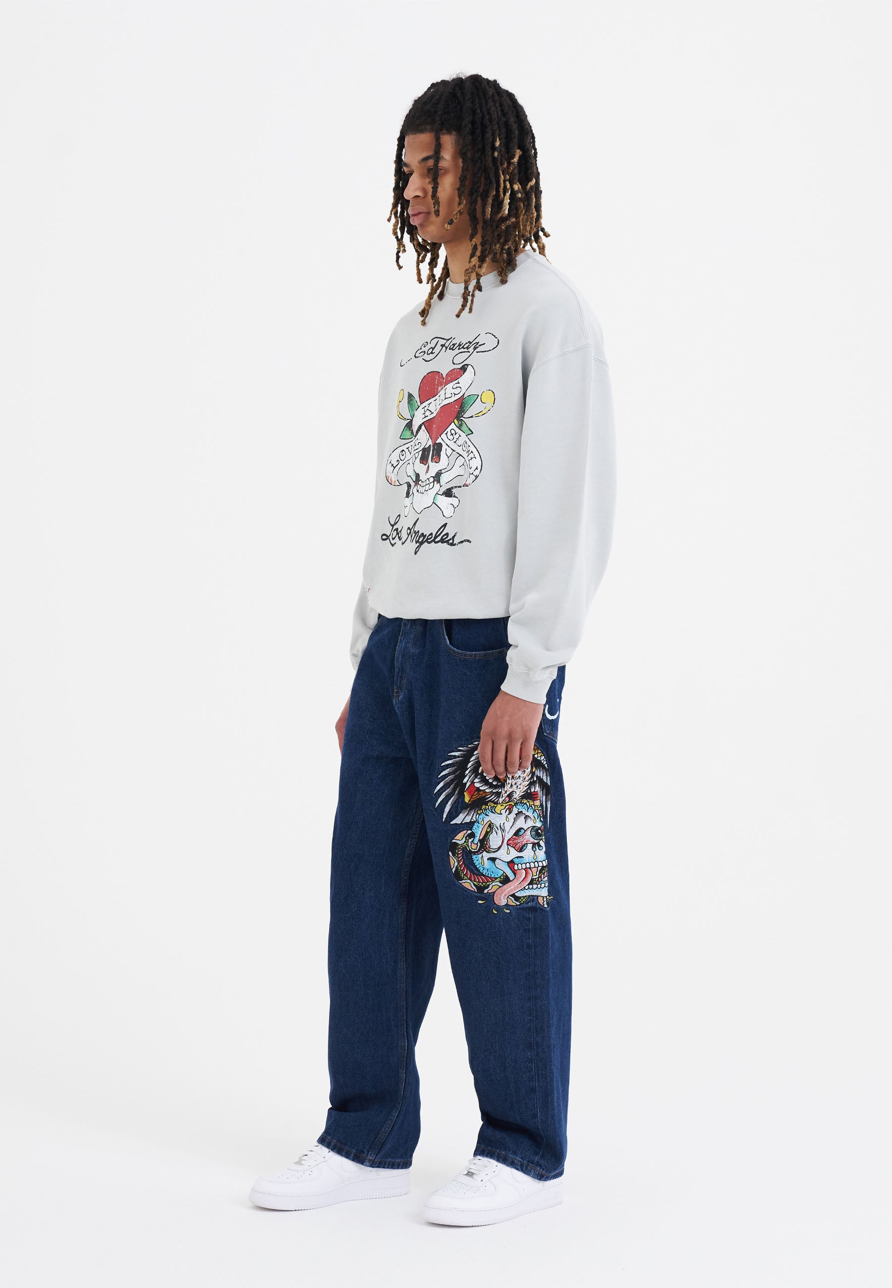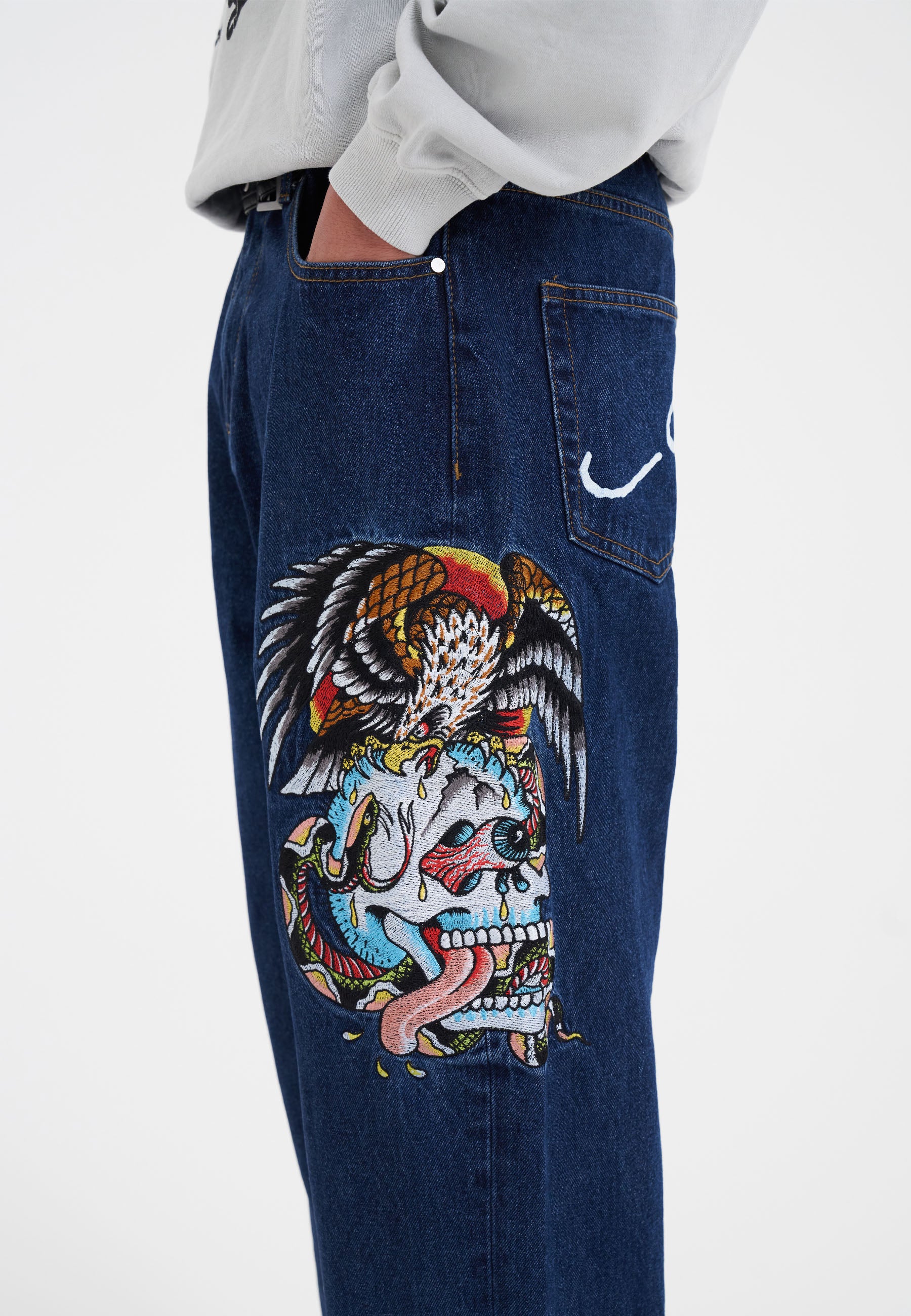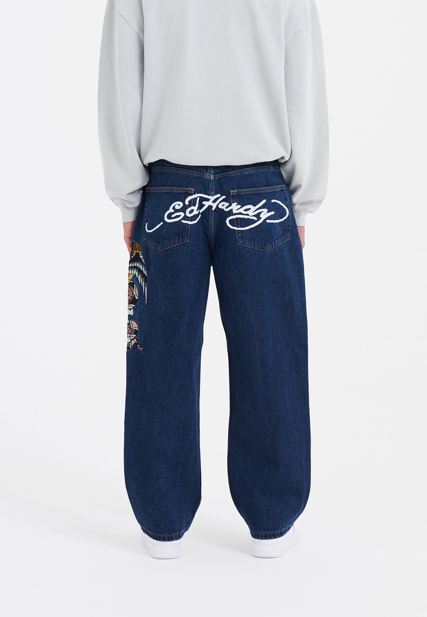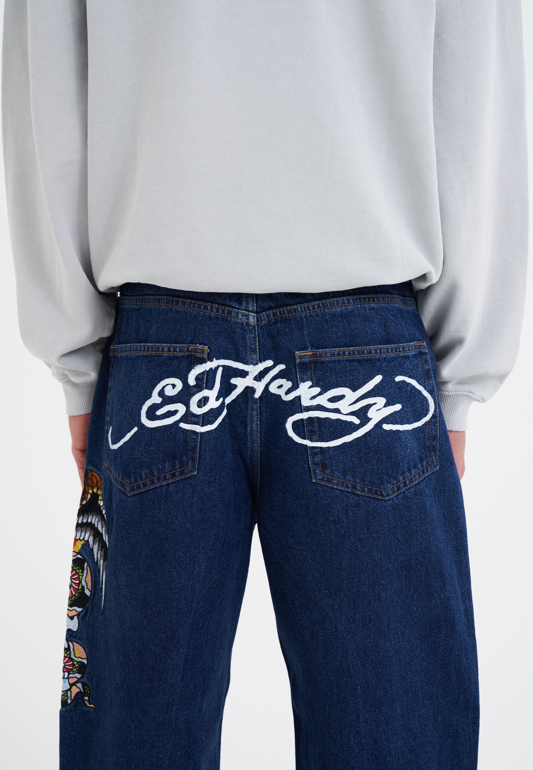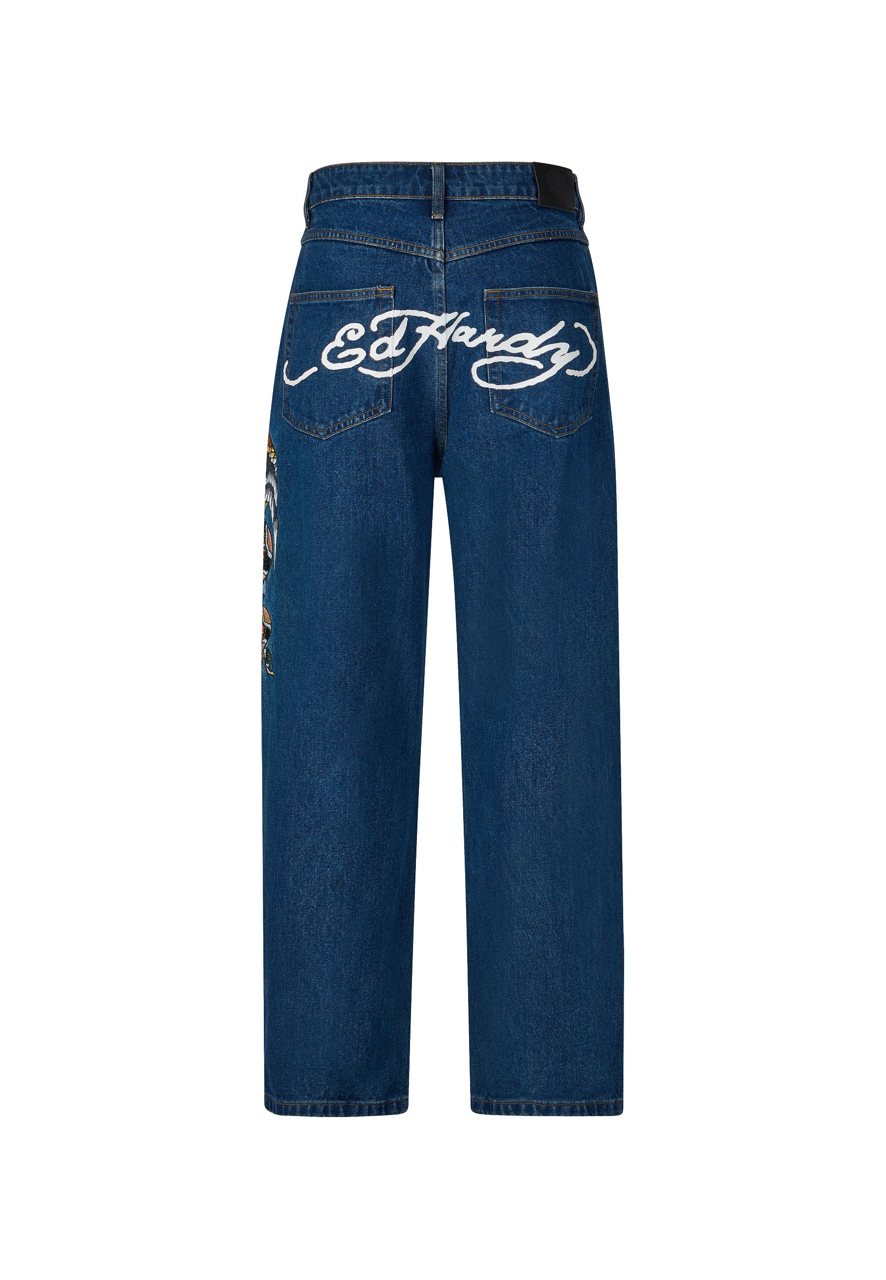 Boasting Ed Hardy’s legendary logo across their rear, these vintage-style jeans feature a unique skull eagle embroidered graphic on their upper left leg.
