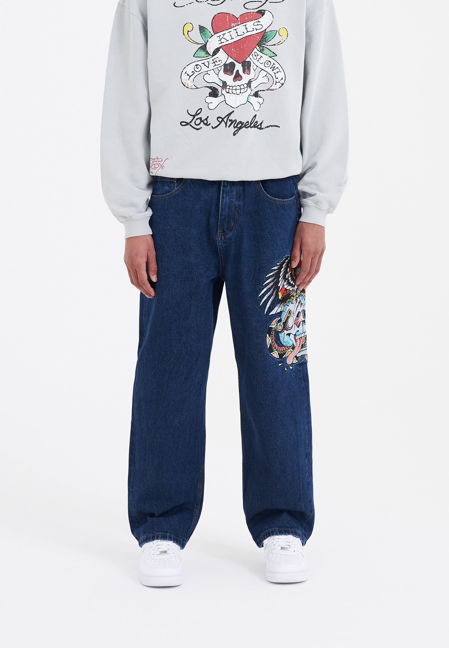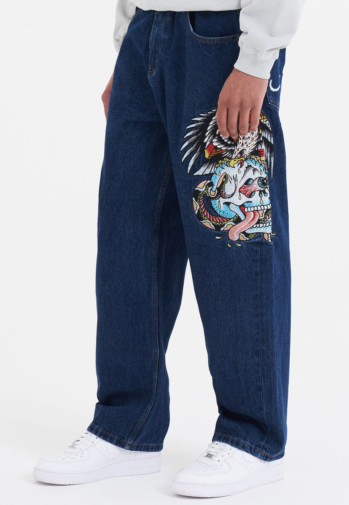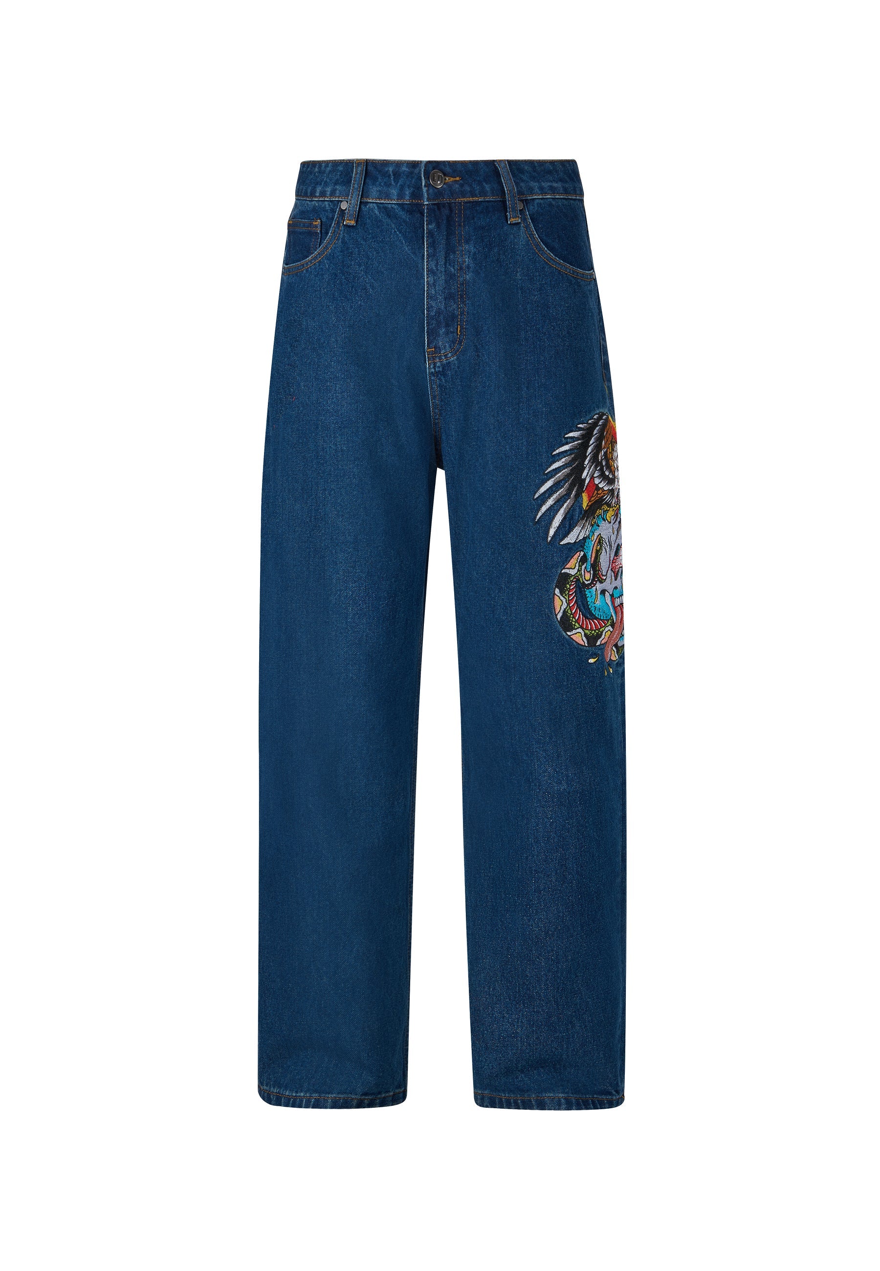 Mens Skull-Snake-Eagle Tattoo Graphic Denim Trousers Baggy Jeans - Indigo