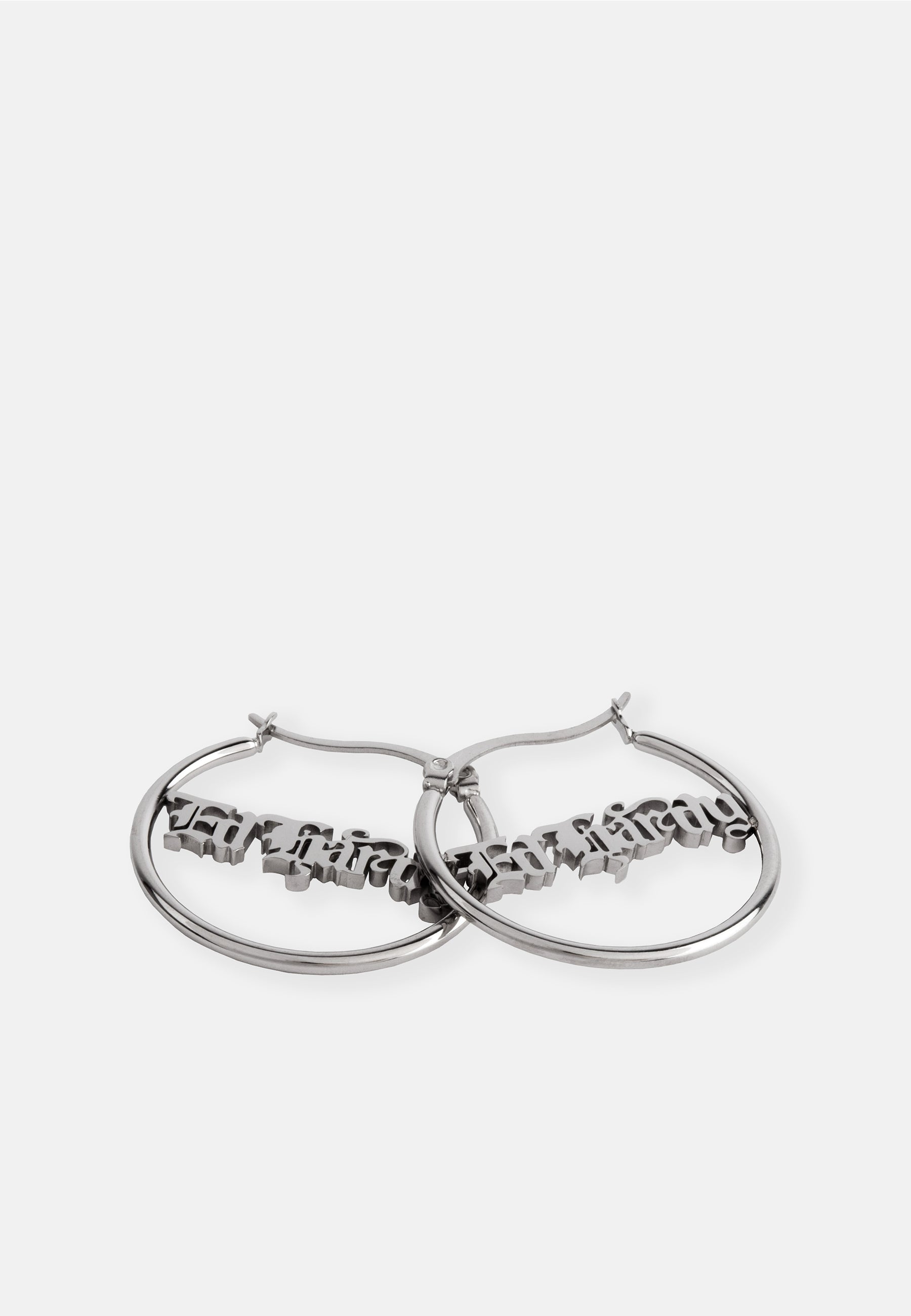 Stainless steel 30mm hoop earring with custom cast gothic ED HARDY logo in a silver finish.