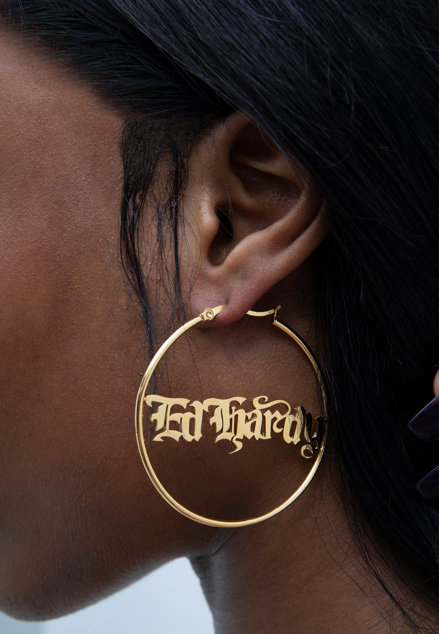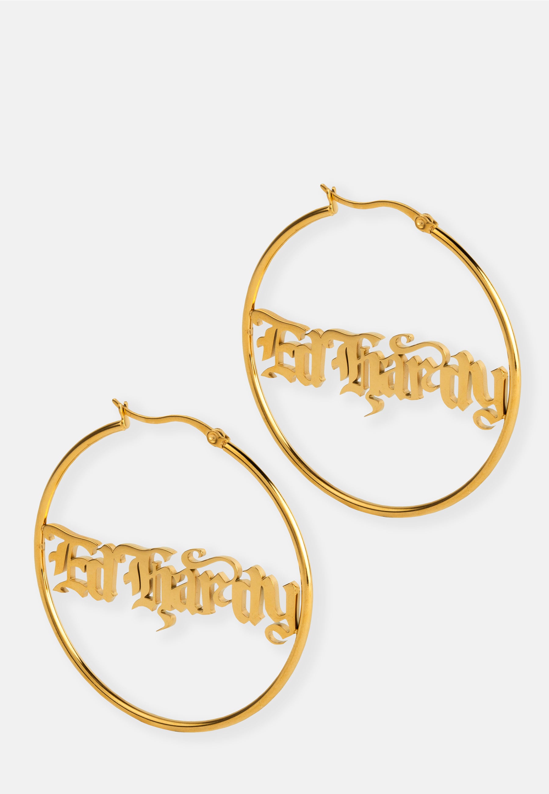 Stainless steel 55mm hoop earring with custom cast gothic ED HARDY logo in a gold finish.