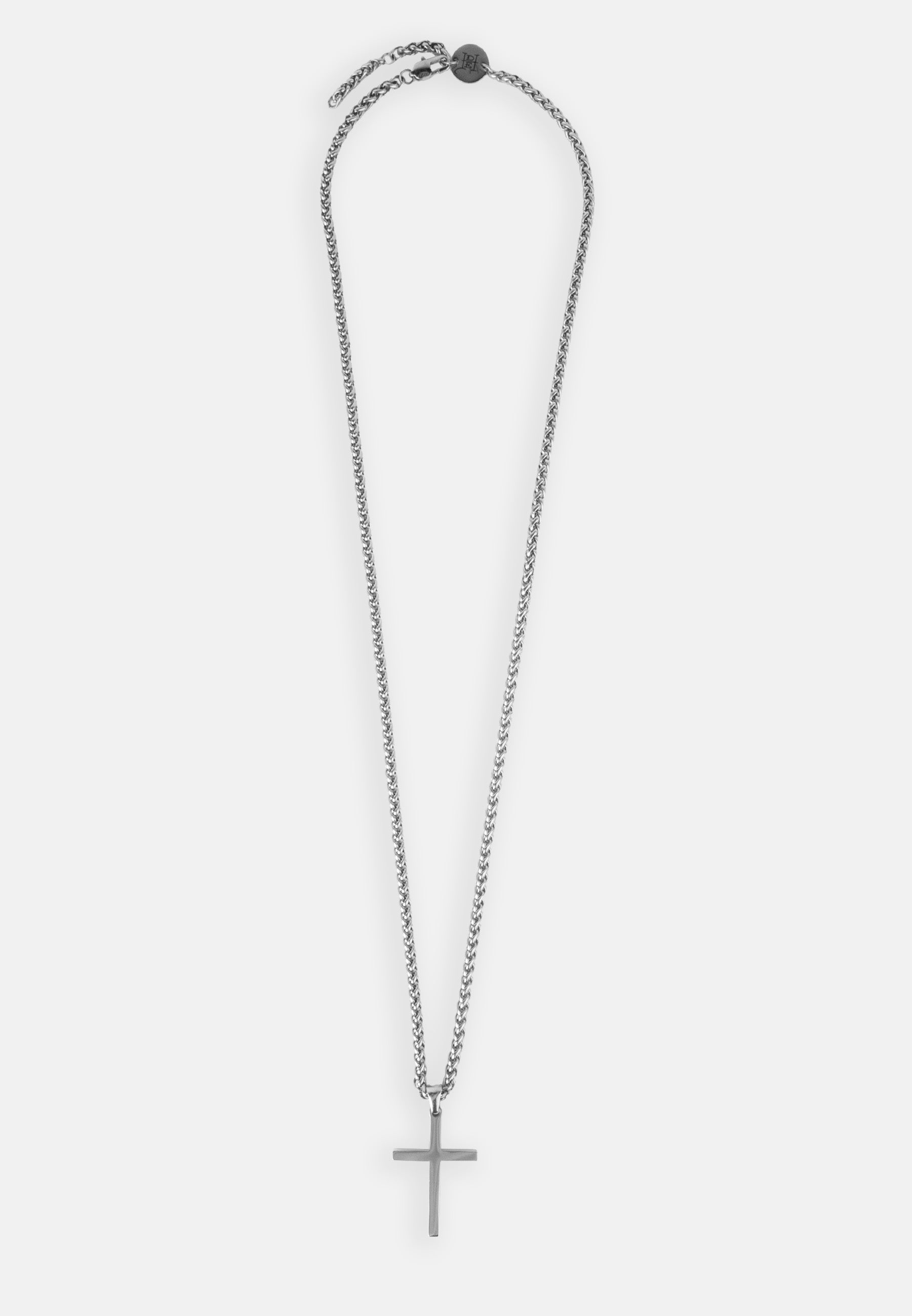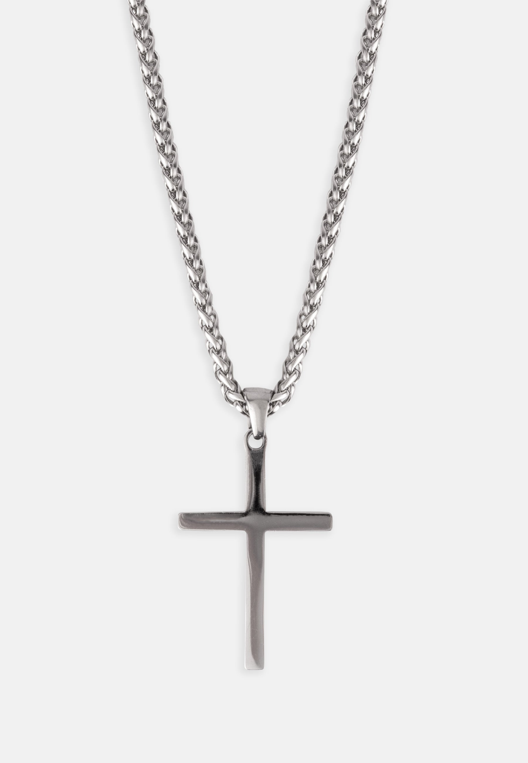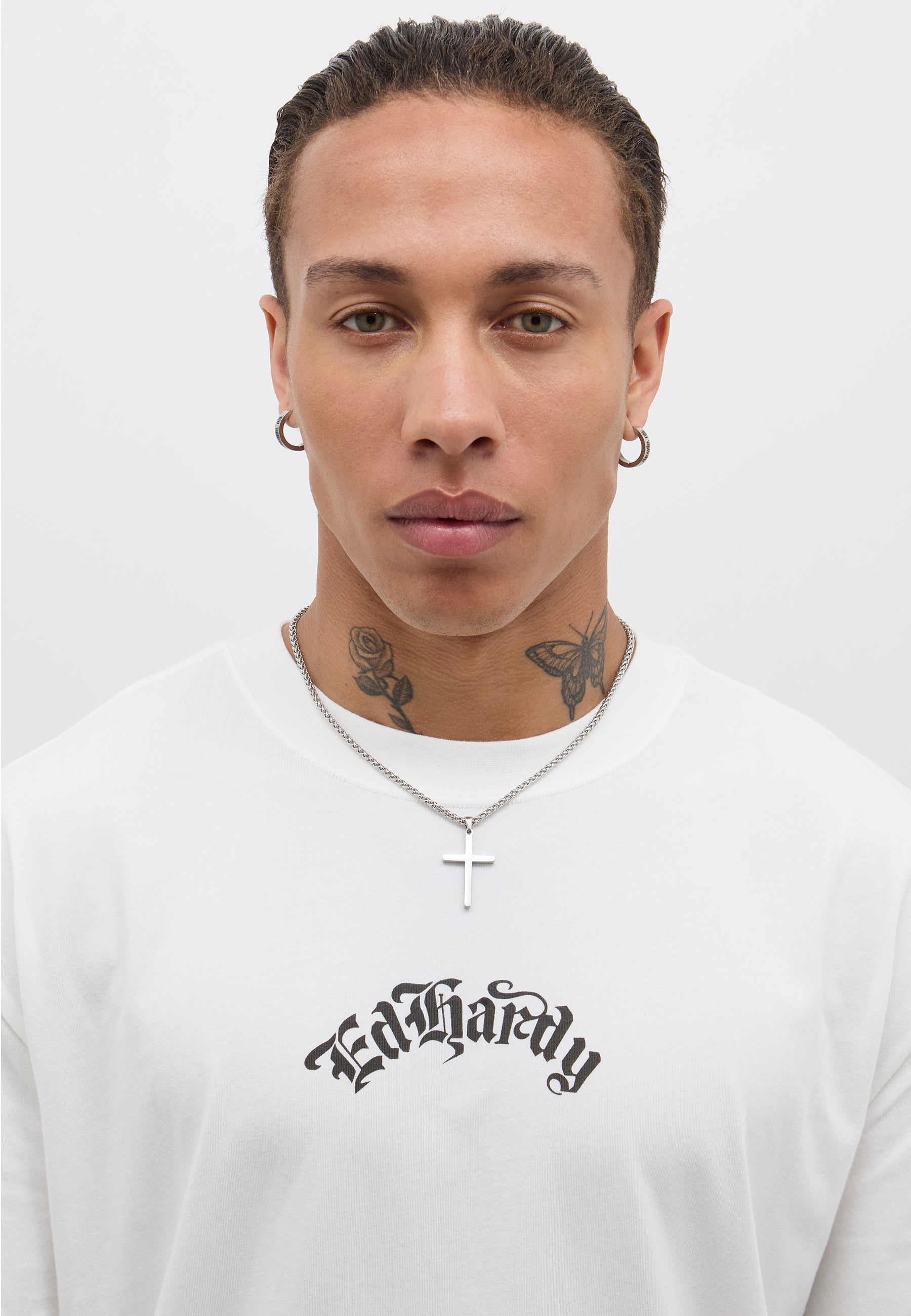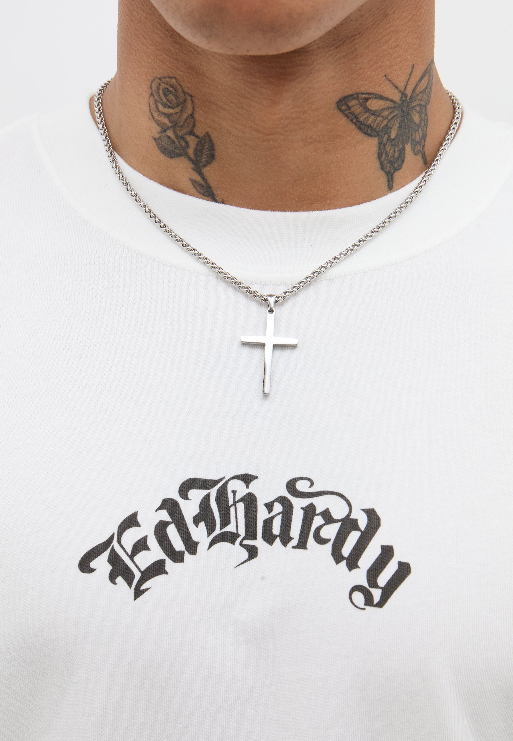Stainless Steel Rounded Box chain with large Custom cast Cross with ED HARDY logo ribbon detail on the edge in a silver finish.