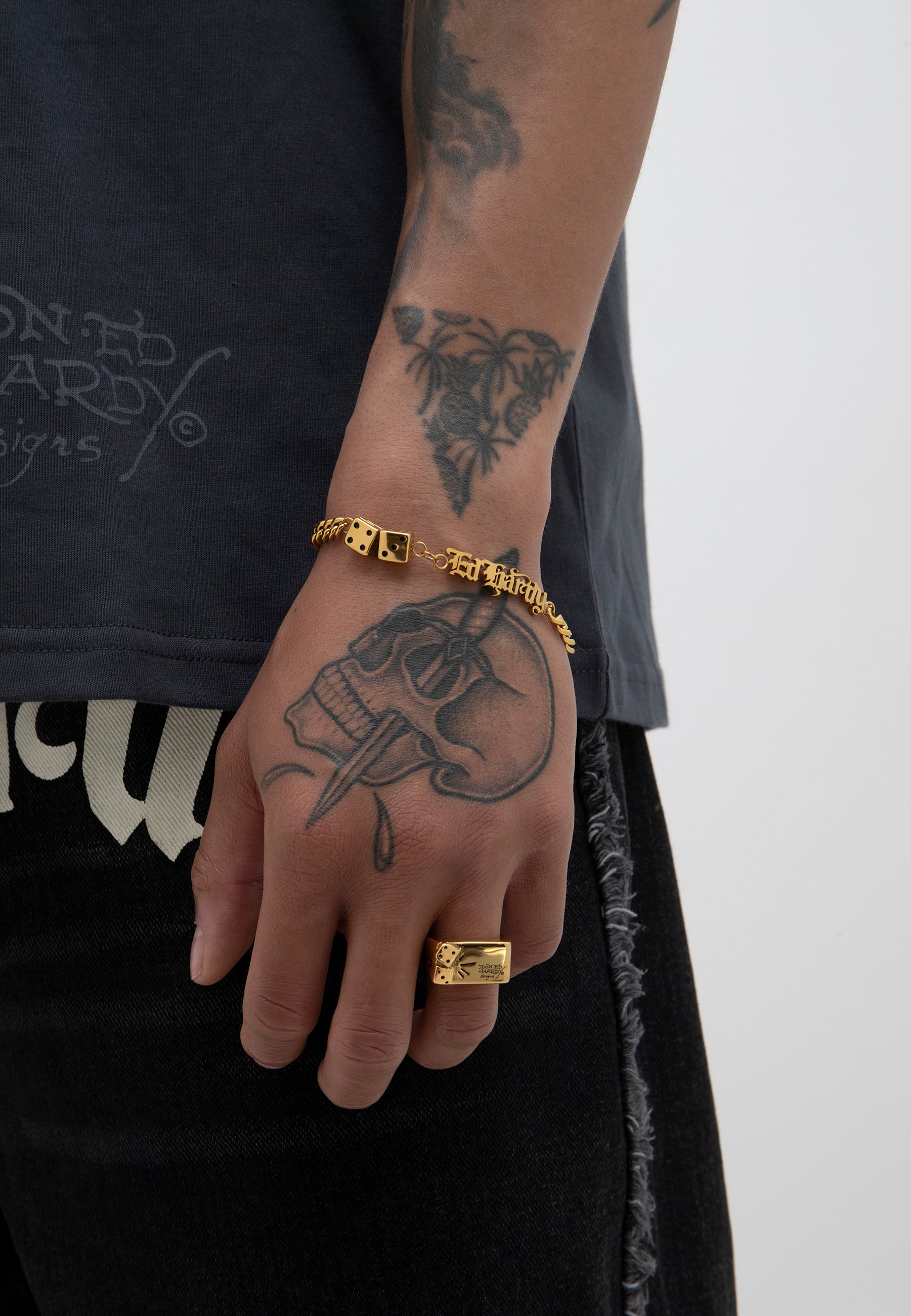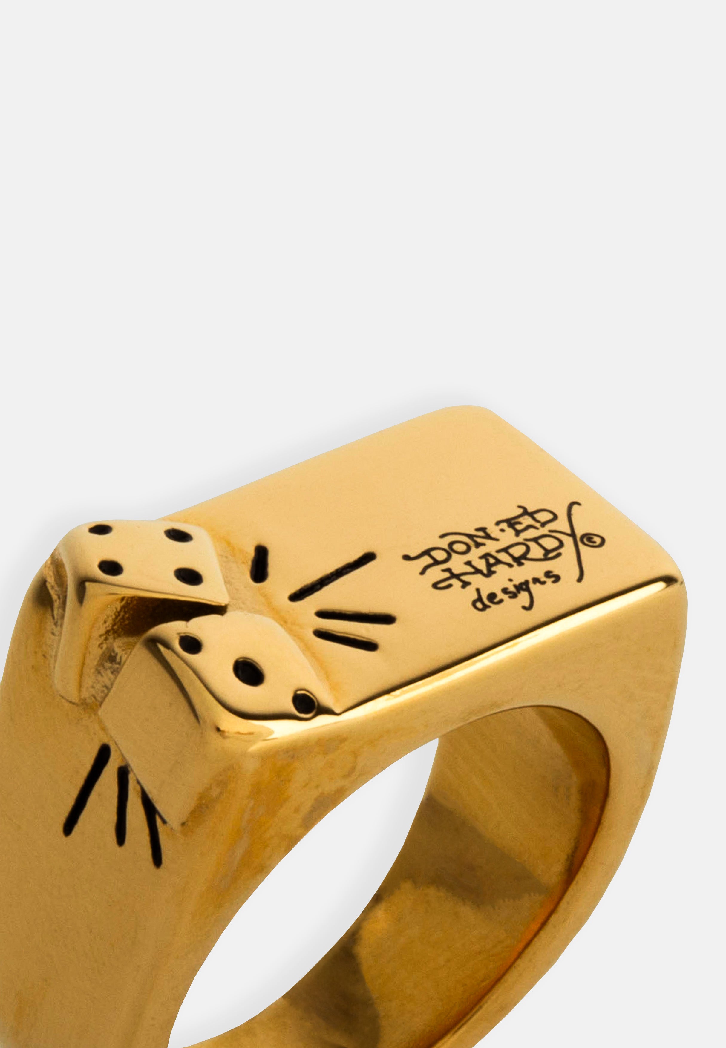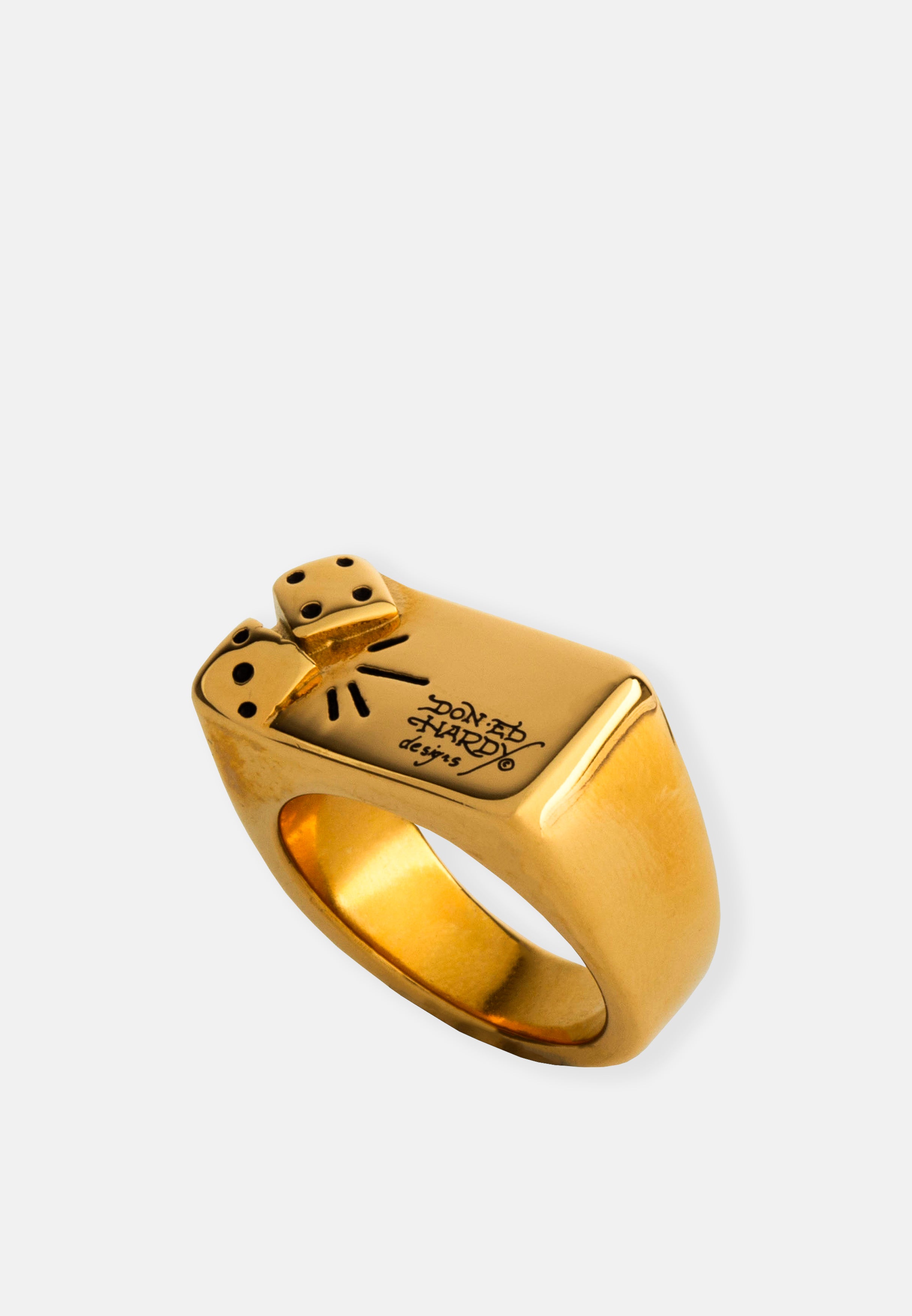 Stainless Steel Rectangular faced signet ring with dice motif and Don Ed hardy Designs logo in a gold finish.