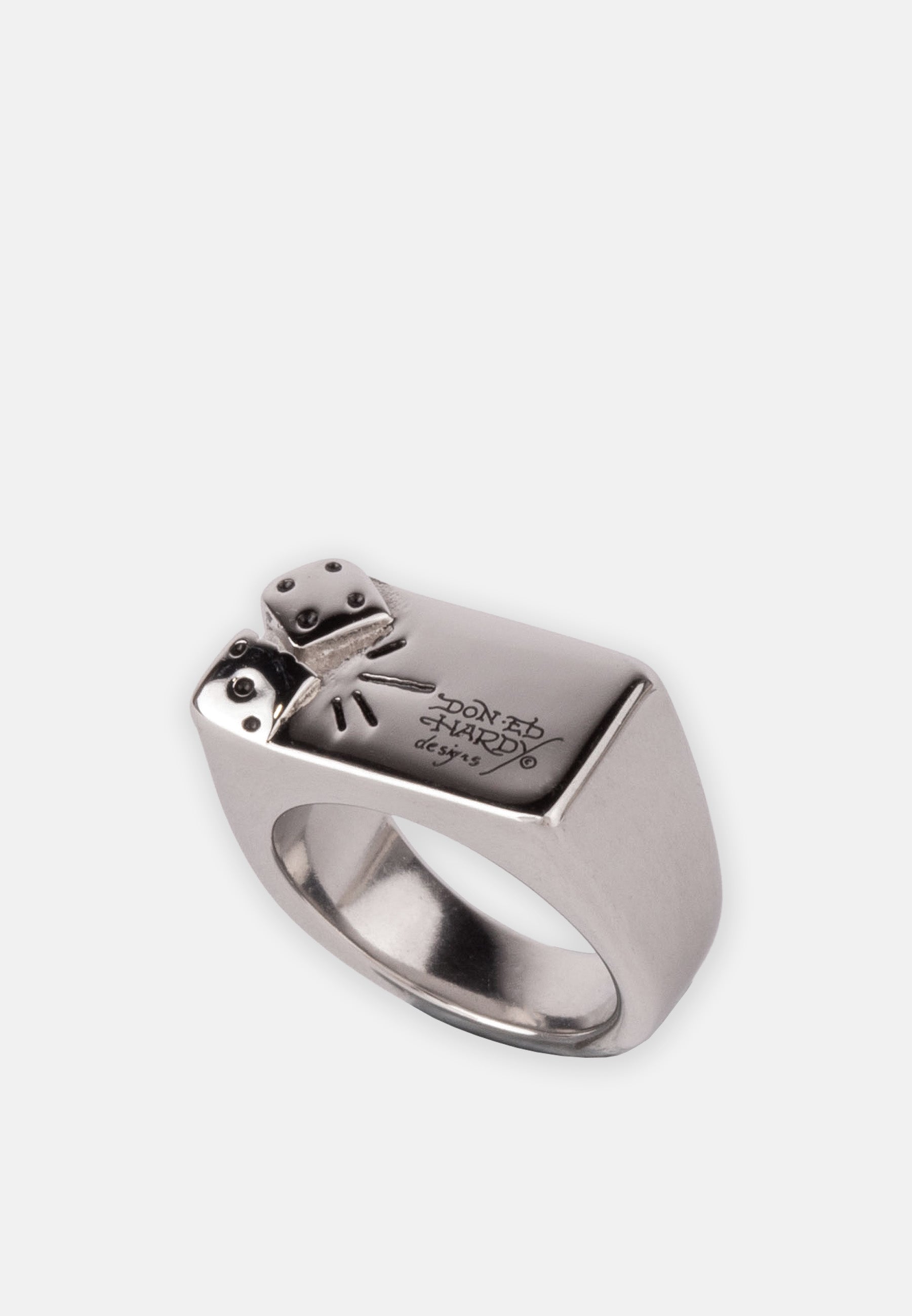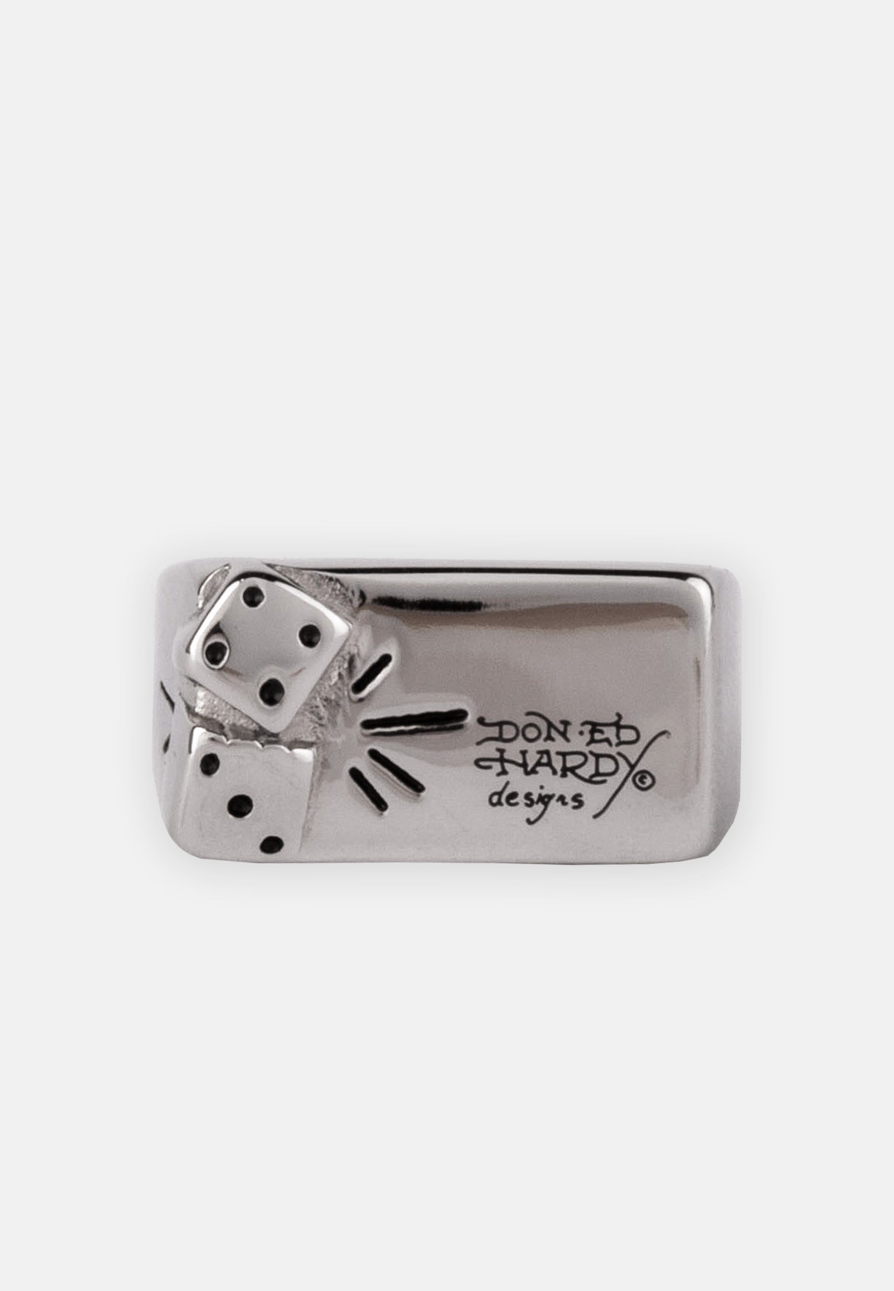Stainless Steel Rectangular faced signet ring with dice motif and Don Ed hardy Designs logo in a silver finish.