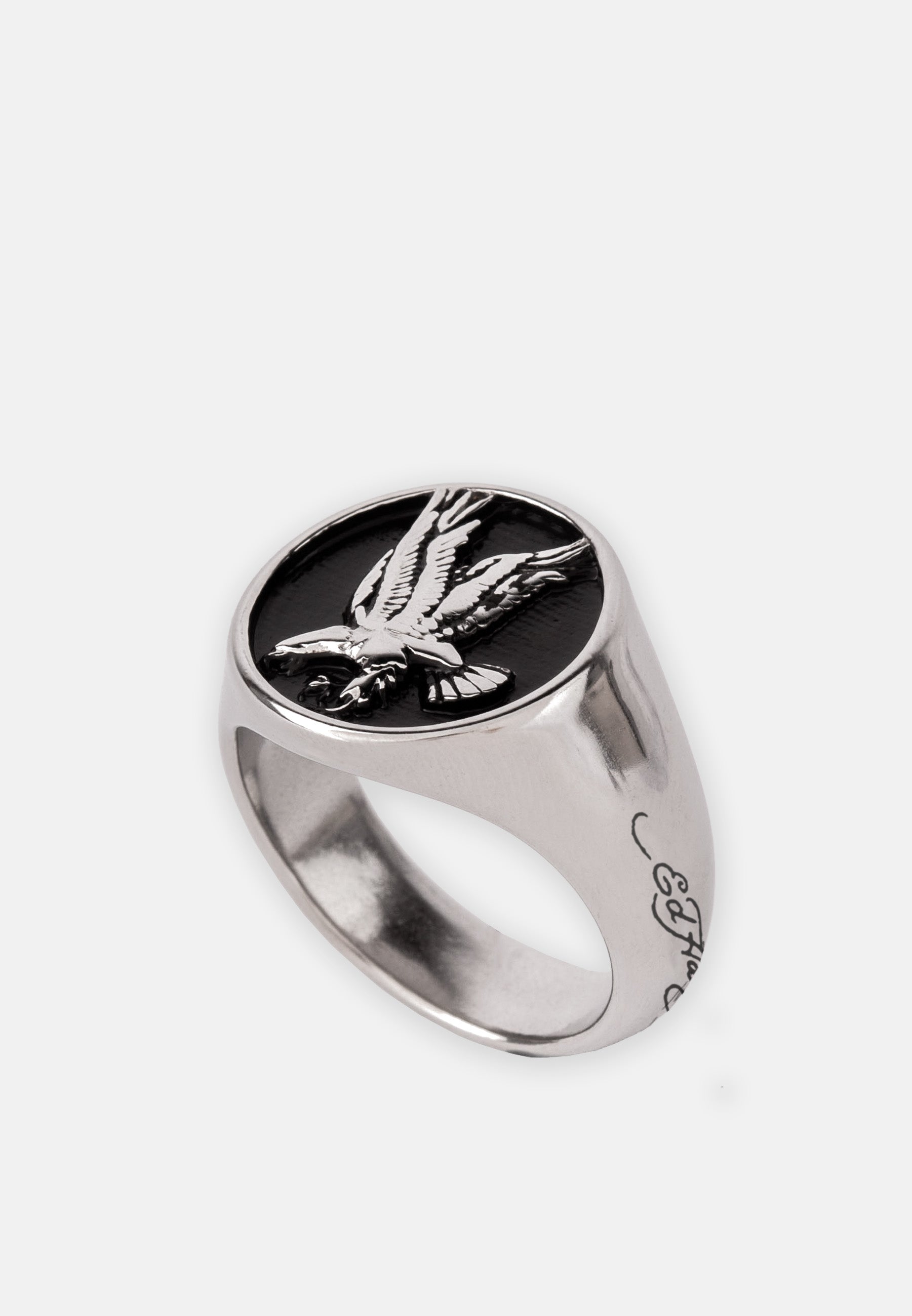Stainless Steel custom cast Ed Hardy debossed Eagle rond signet ring in a silver finish.