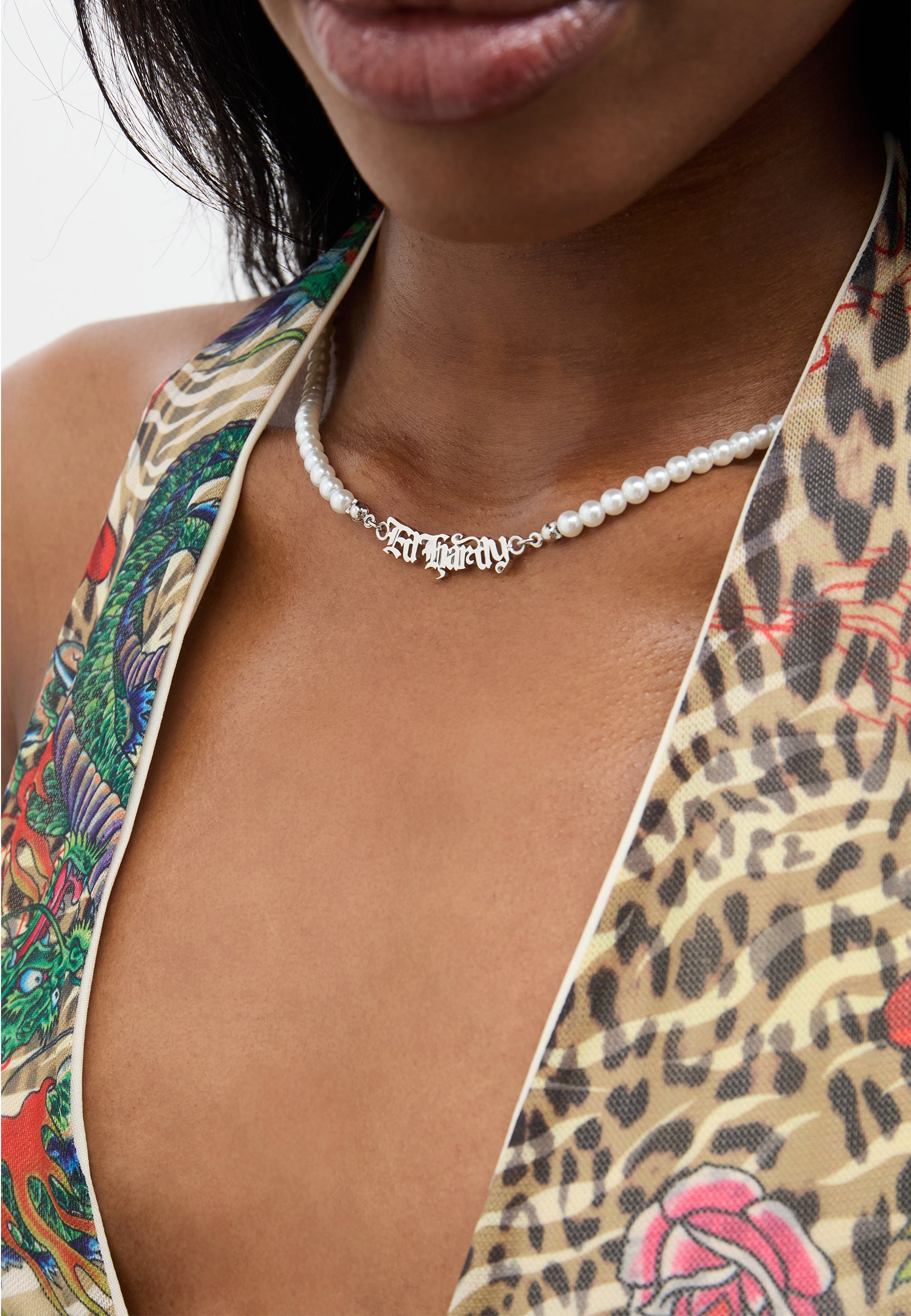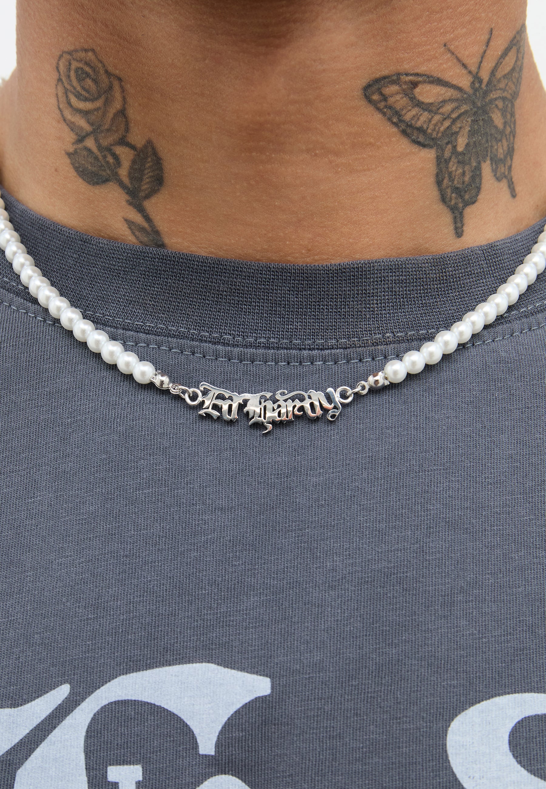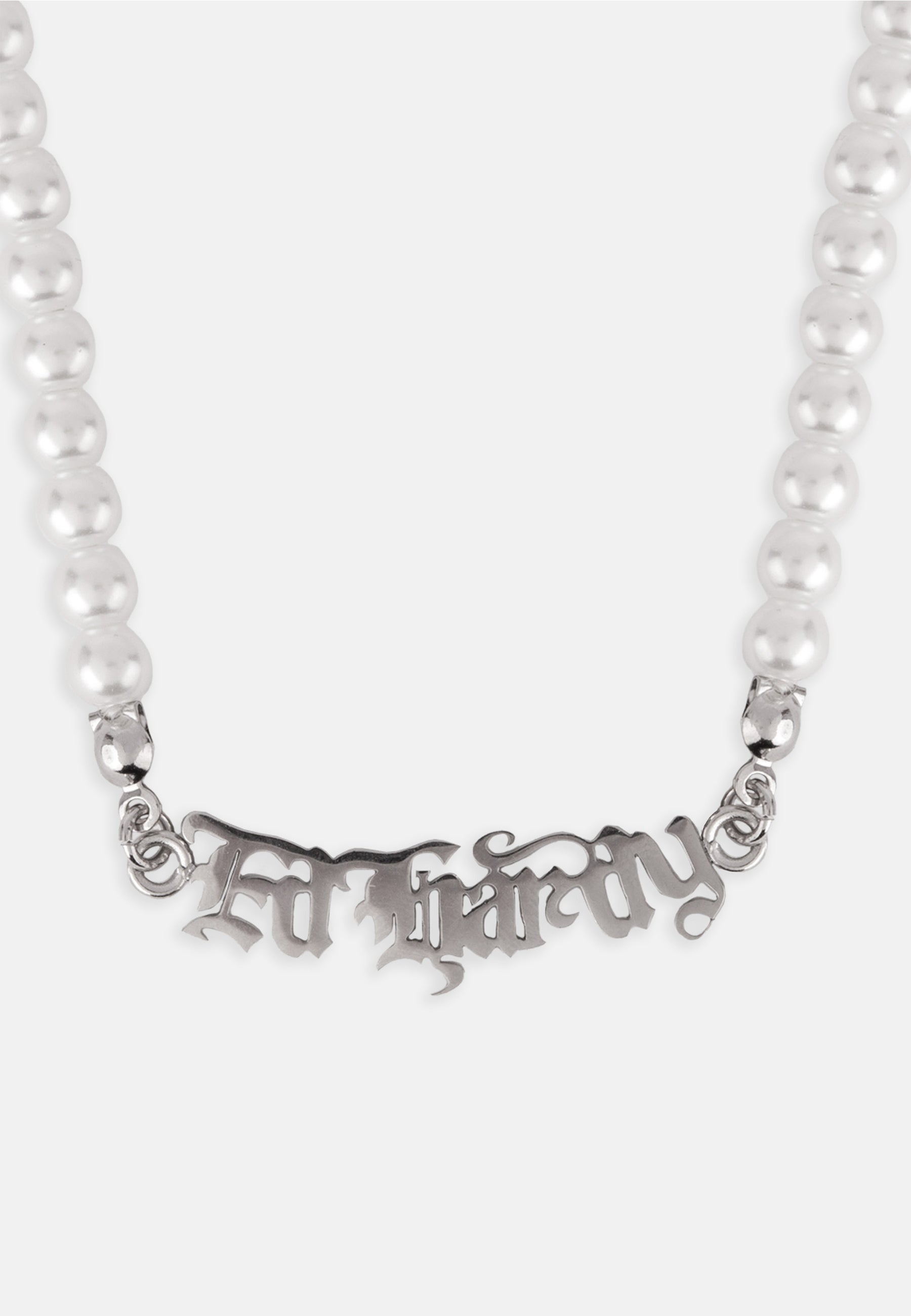 5mm Glass Pearl necklace with in line Gothic Ed Hardy logo in a silver finish.