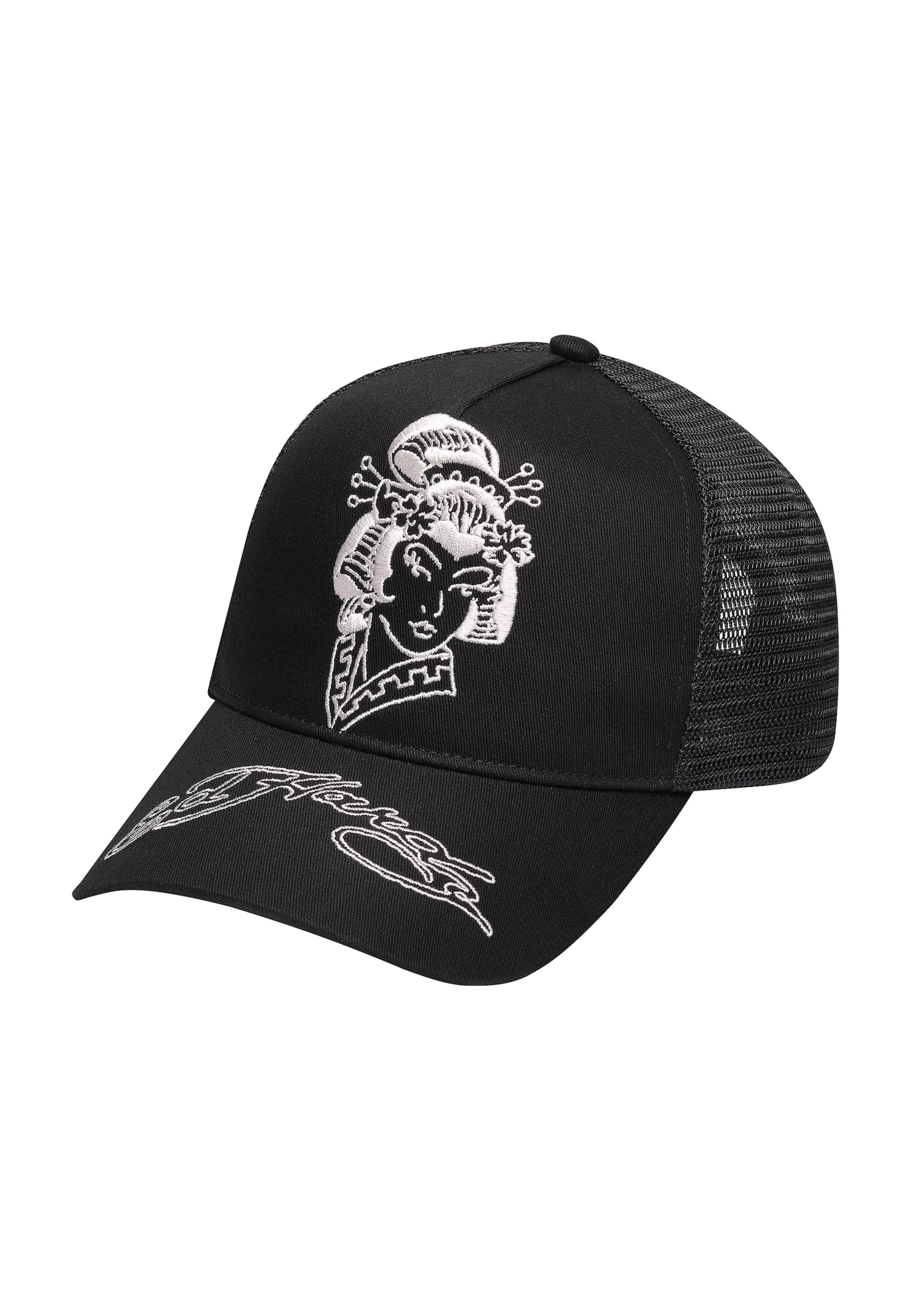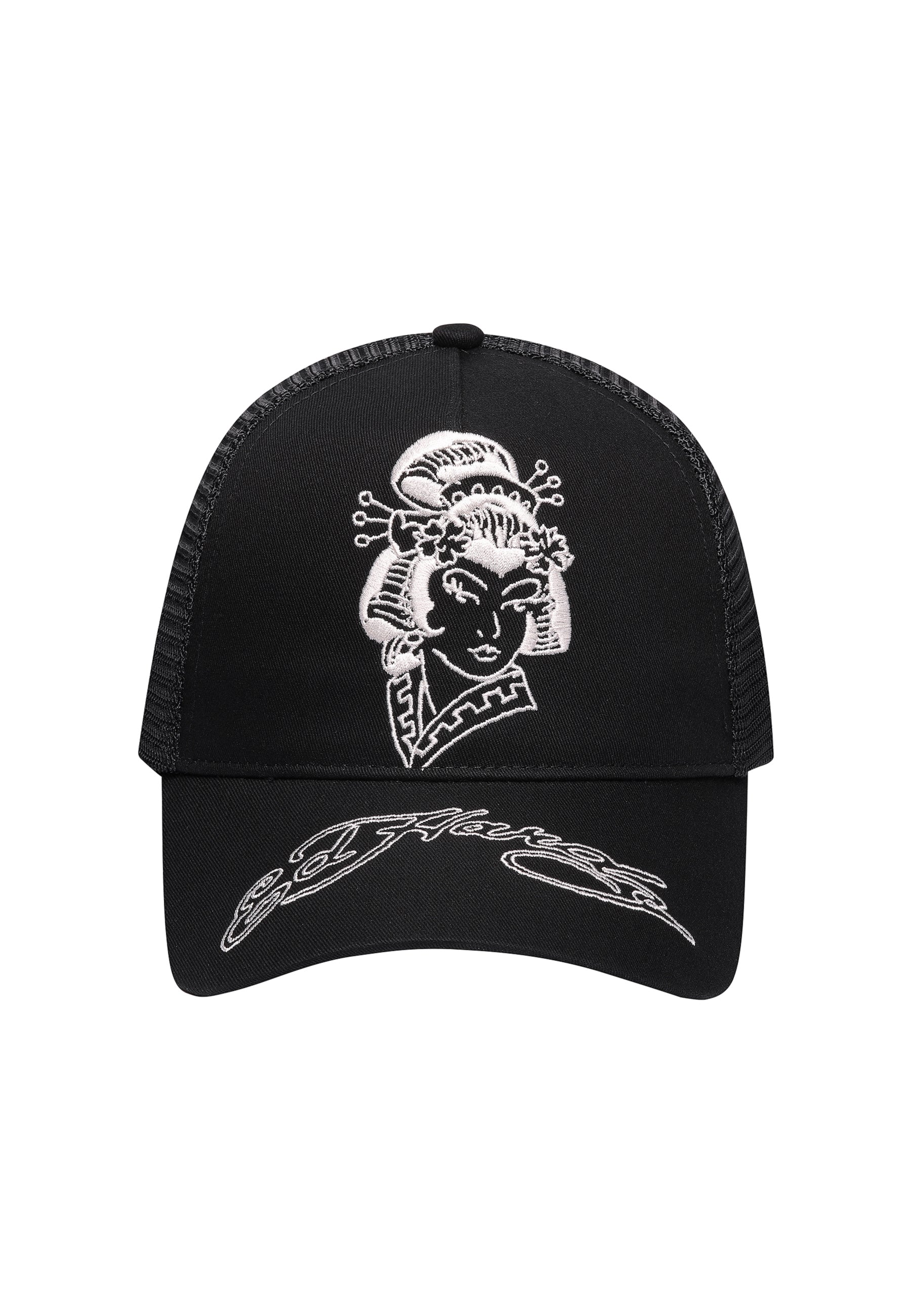 The Geisha Twill Front Mesh Trucker celebrates Ed Hardy’s iconic legacy, showcasing his revered Geisha graphic reimagined for the modern era.