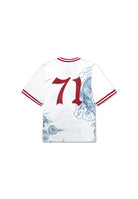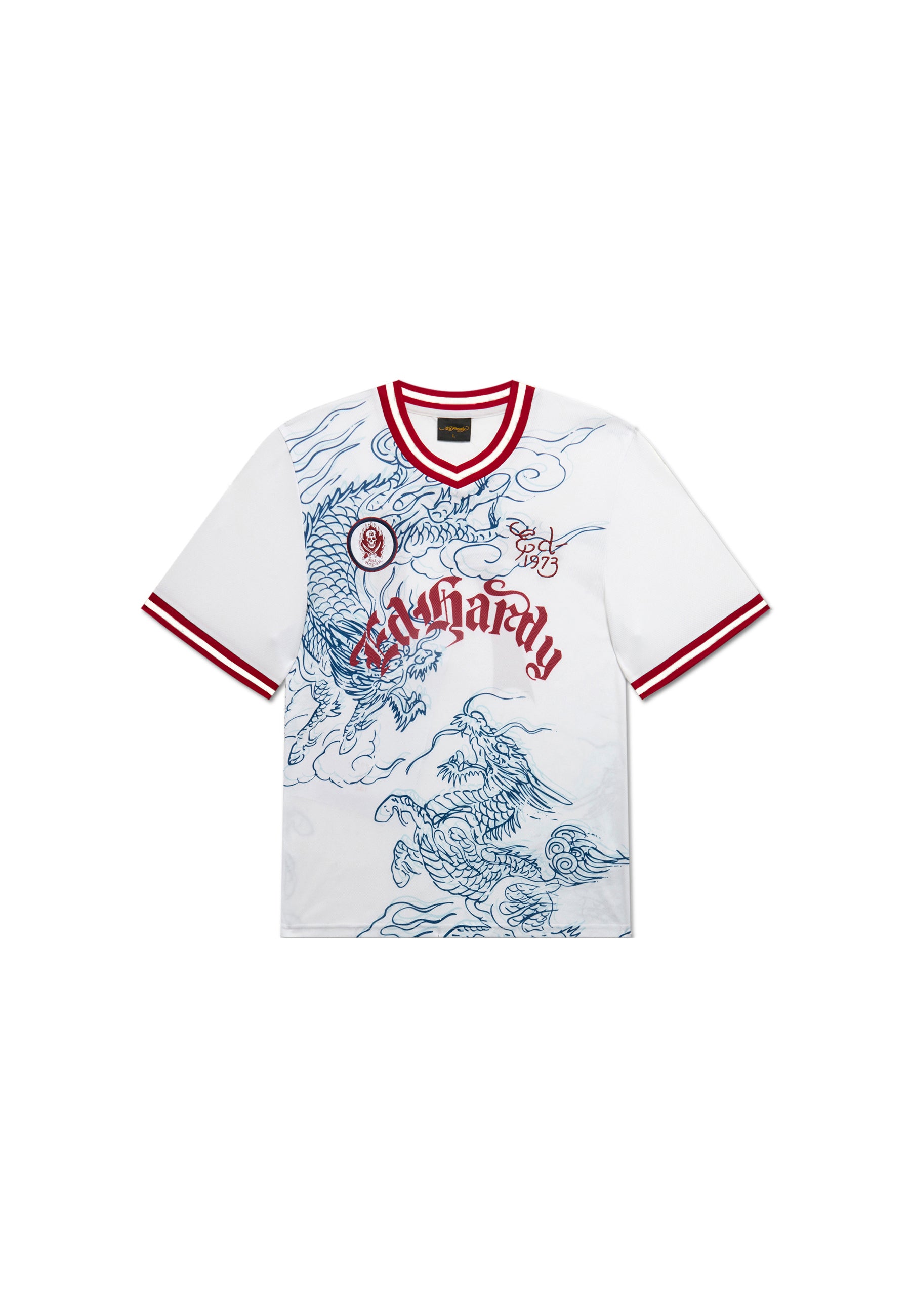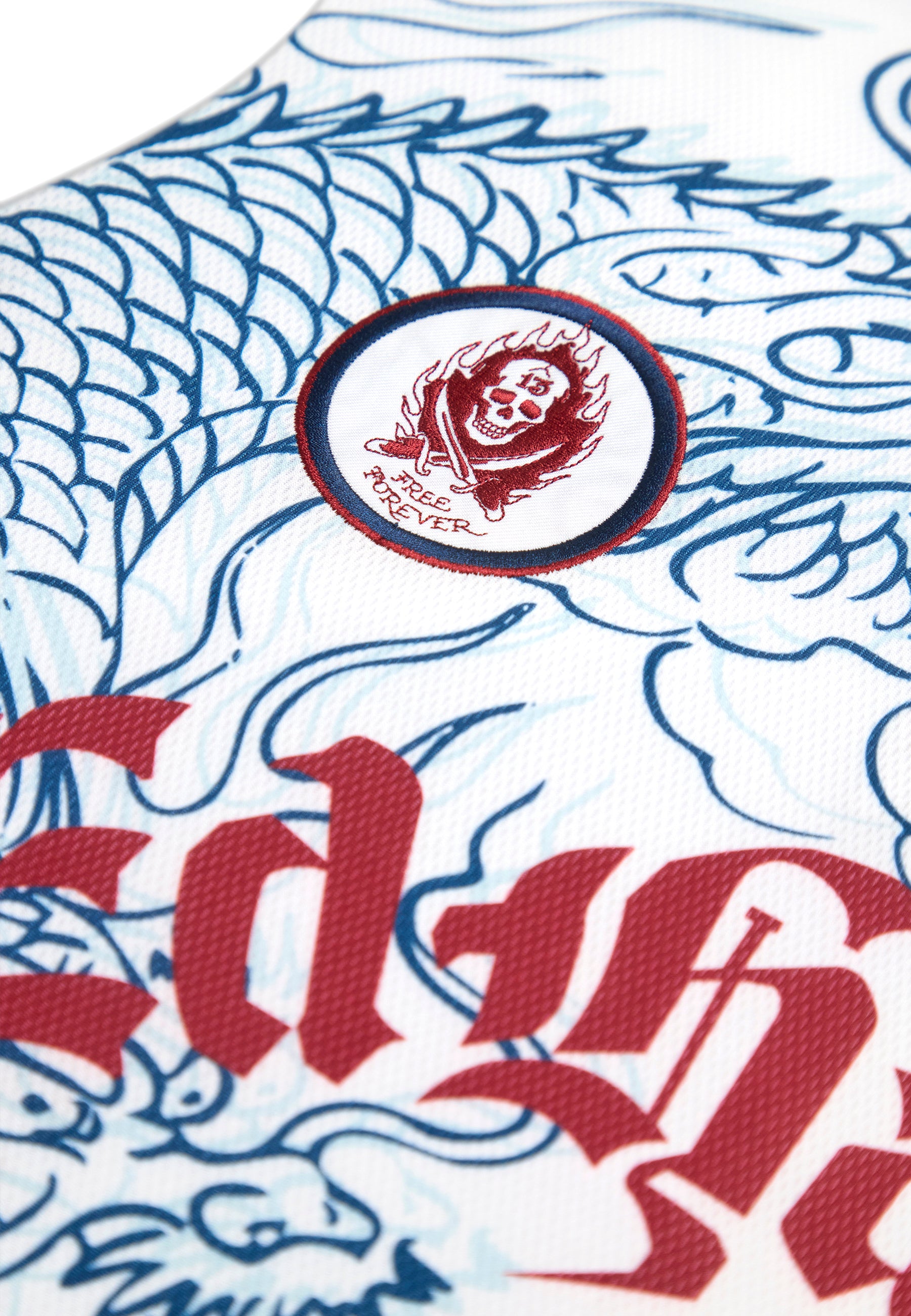 100% POLYESTER REGULAR FIT WOVEN BADGE DRAGON GRAPHIC V NECK