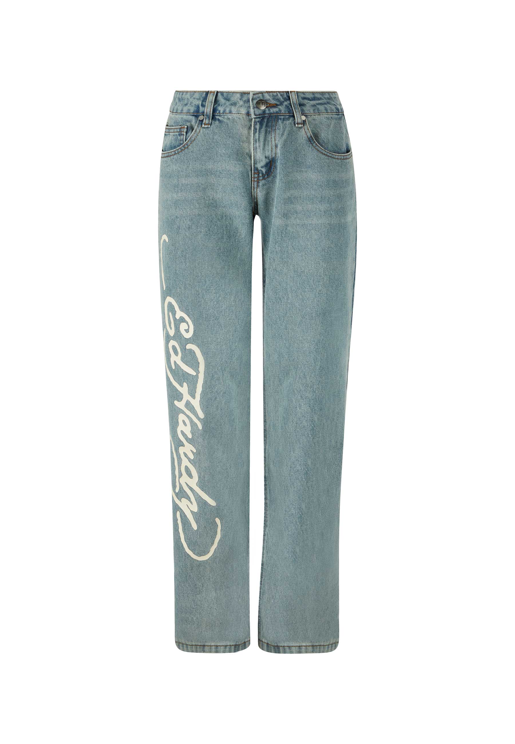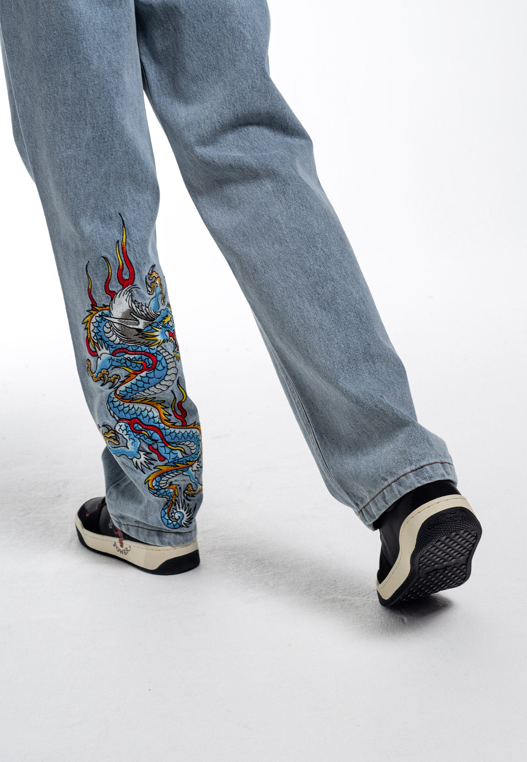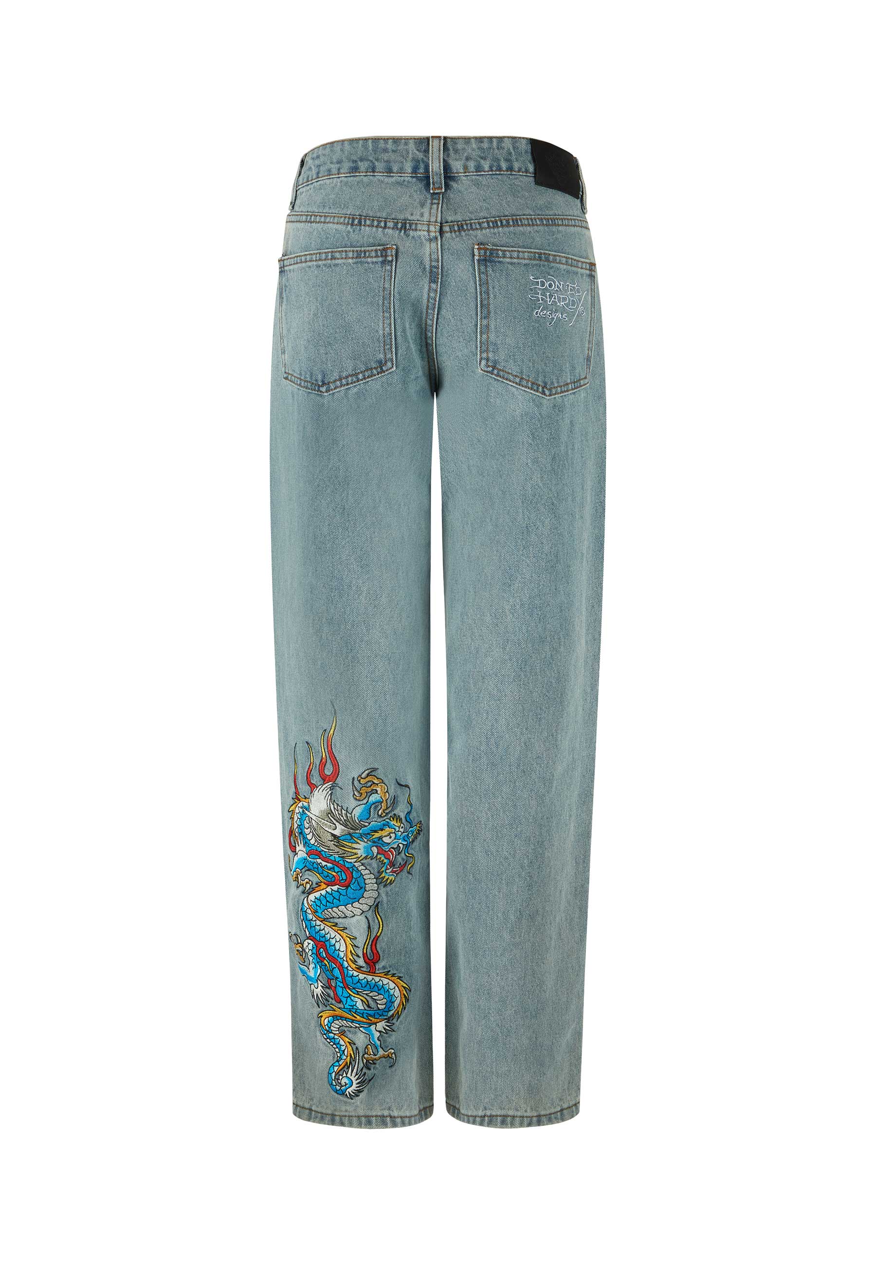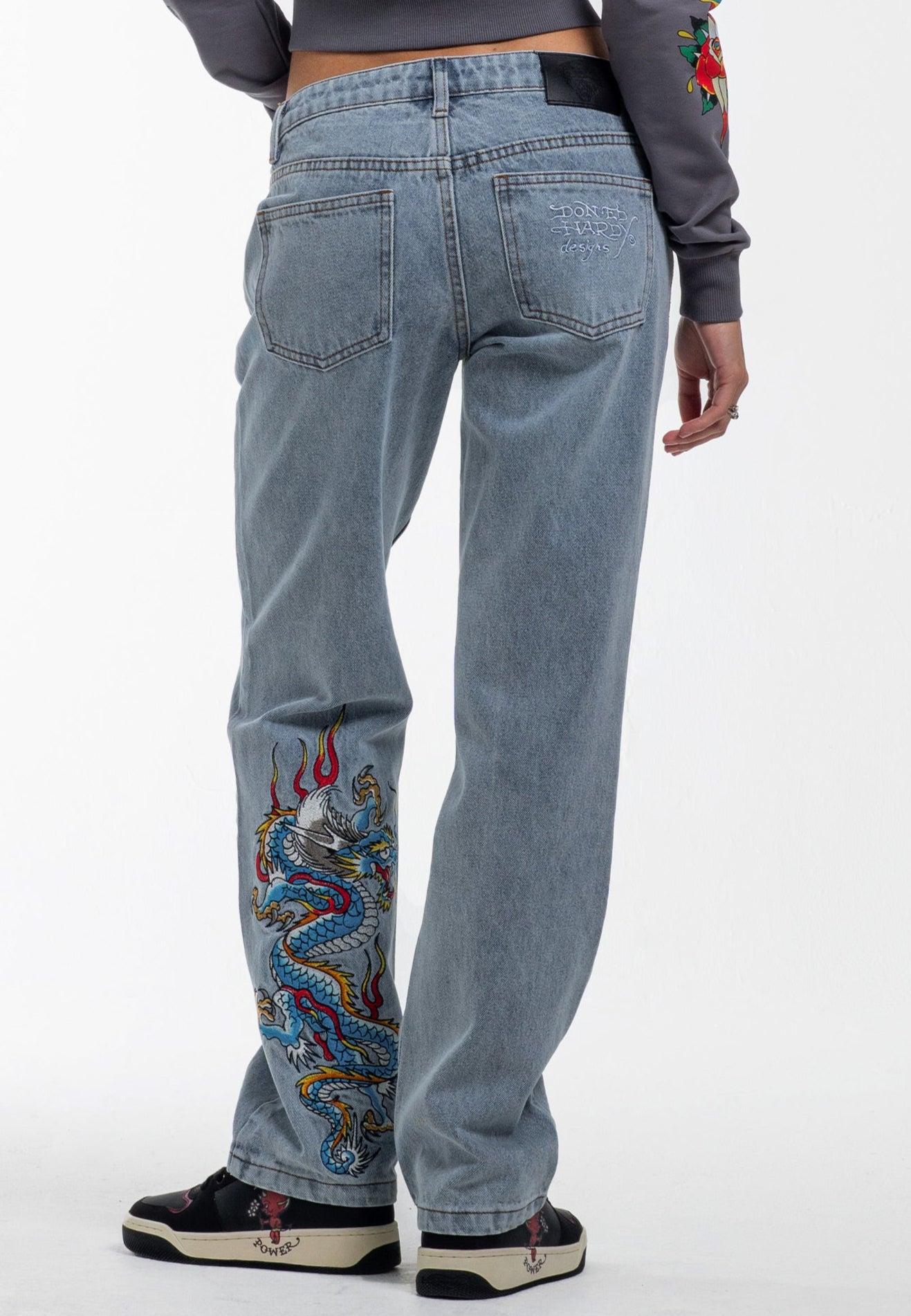 Womens Dragon Flame Straight Leg Denim Trousers Jeans - Blue