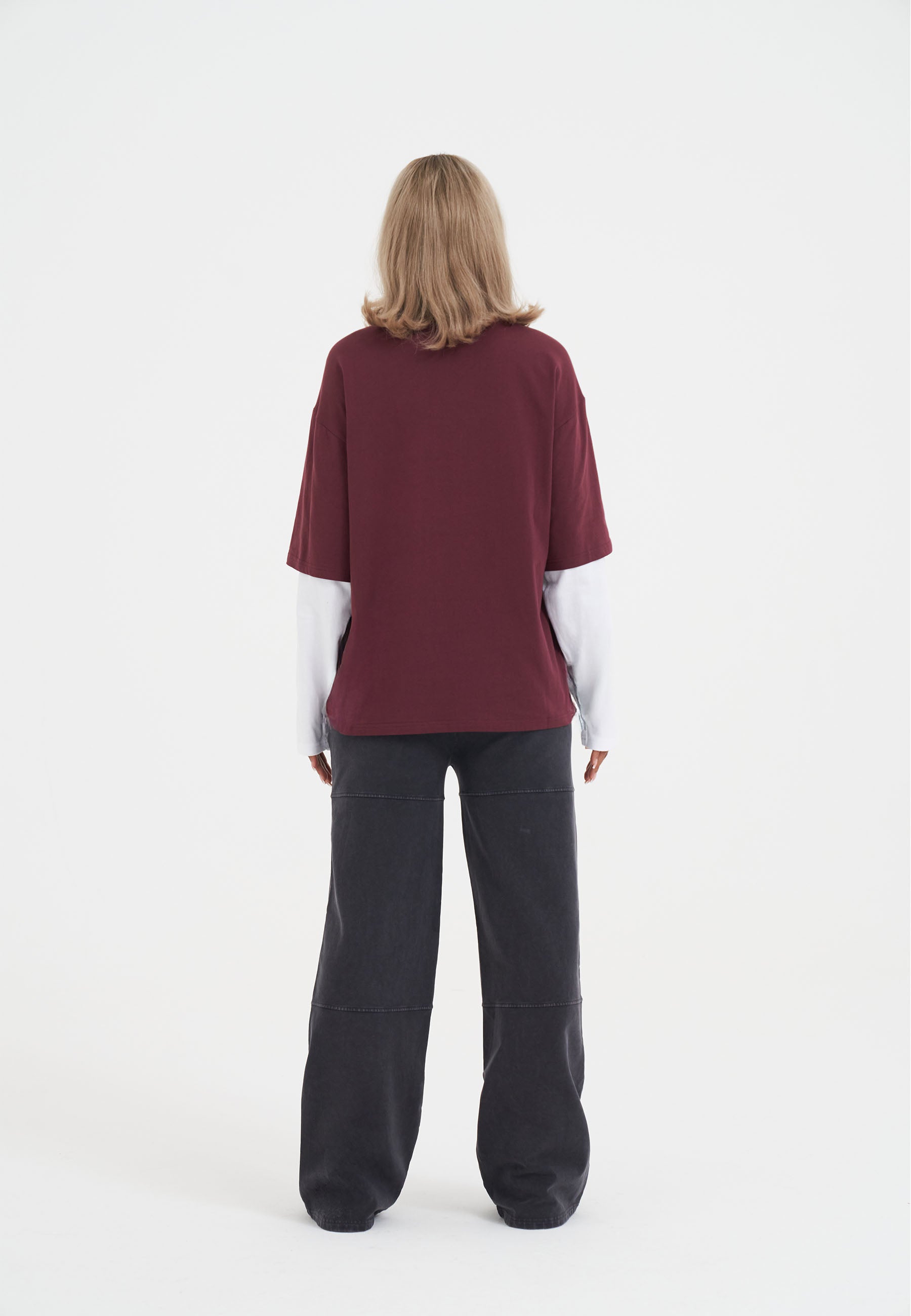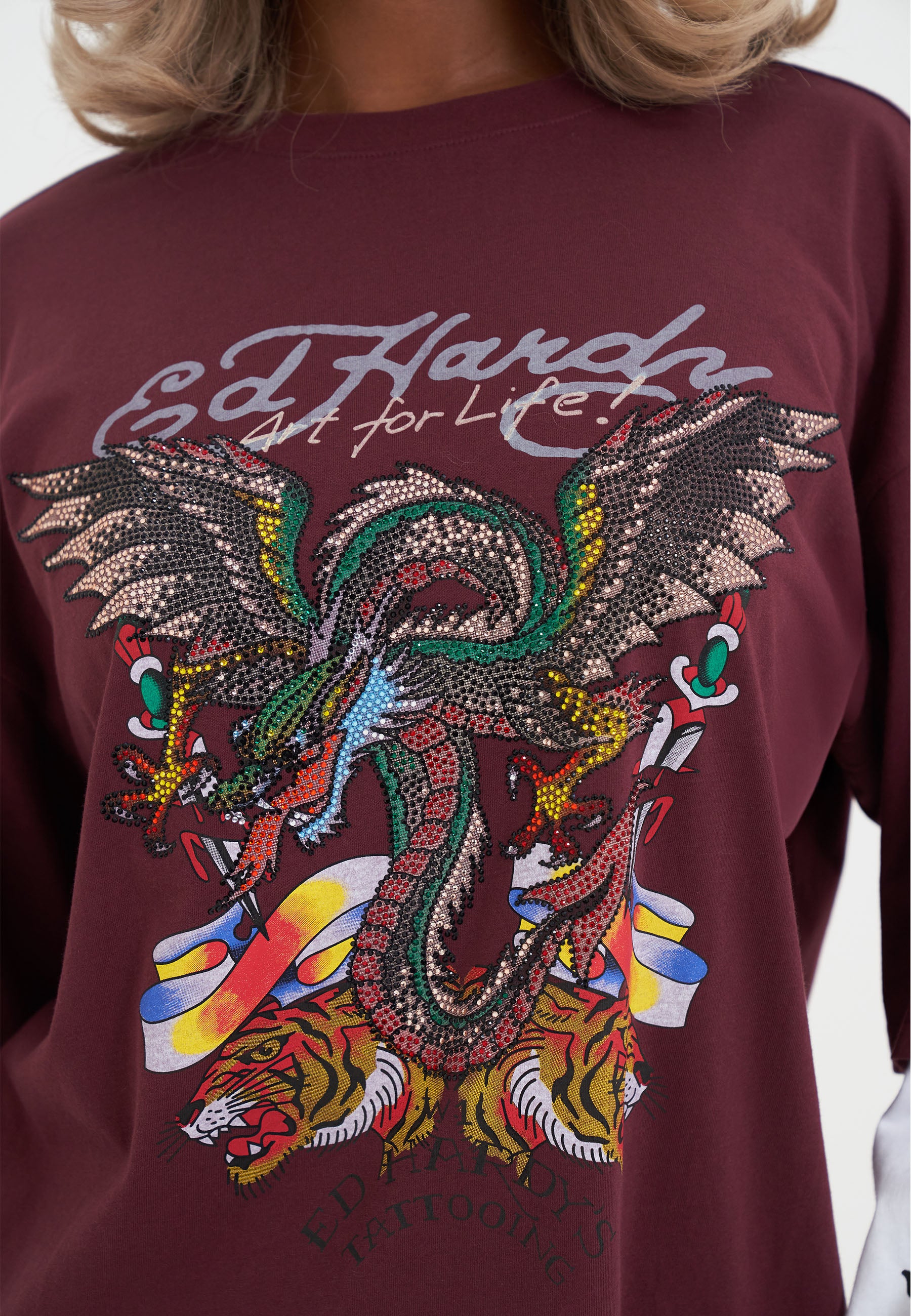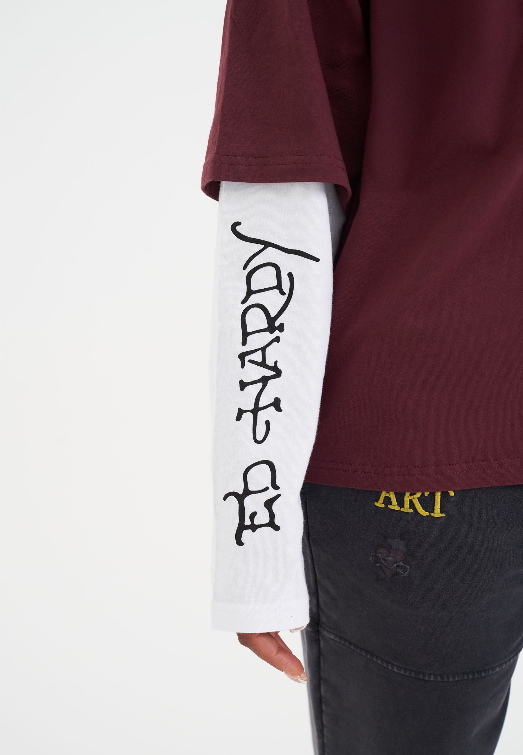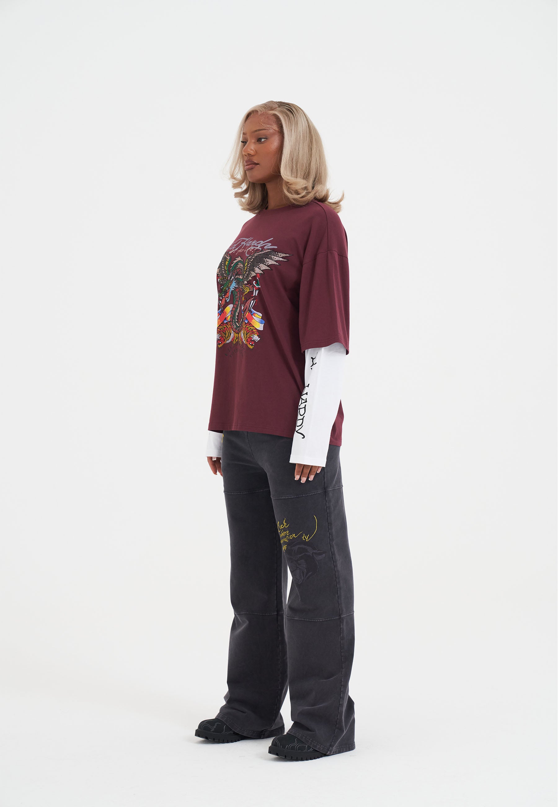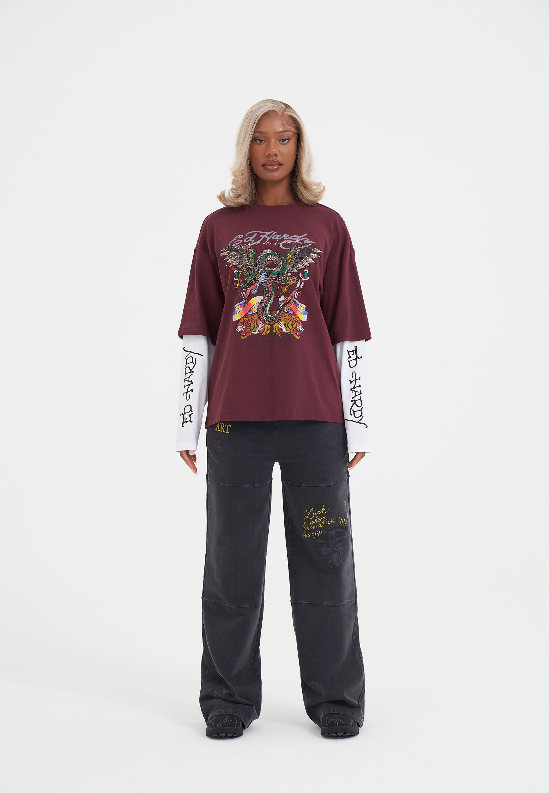 WOMENS FLYING DRAGON DOUBLE SLEEVE T-SHIRT in Burgundy