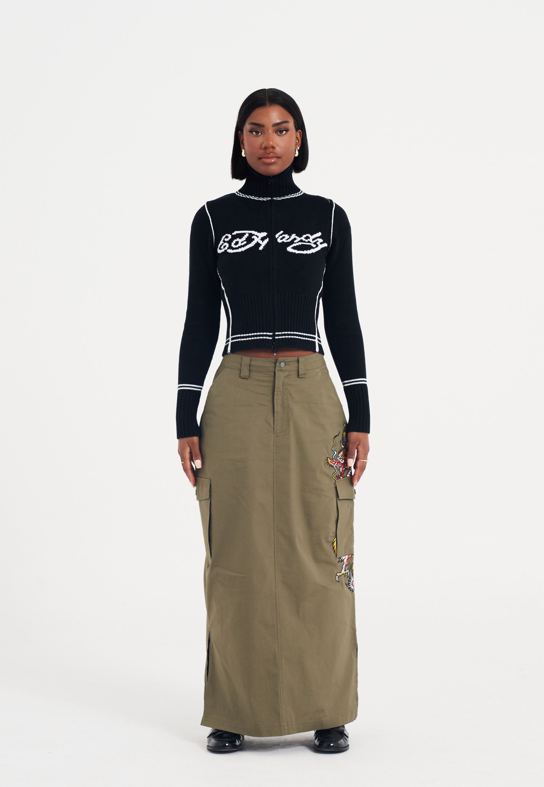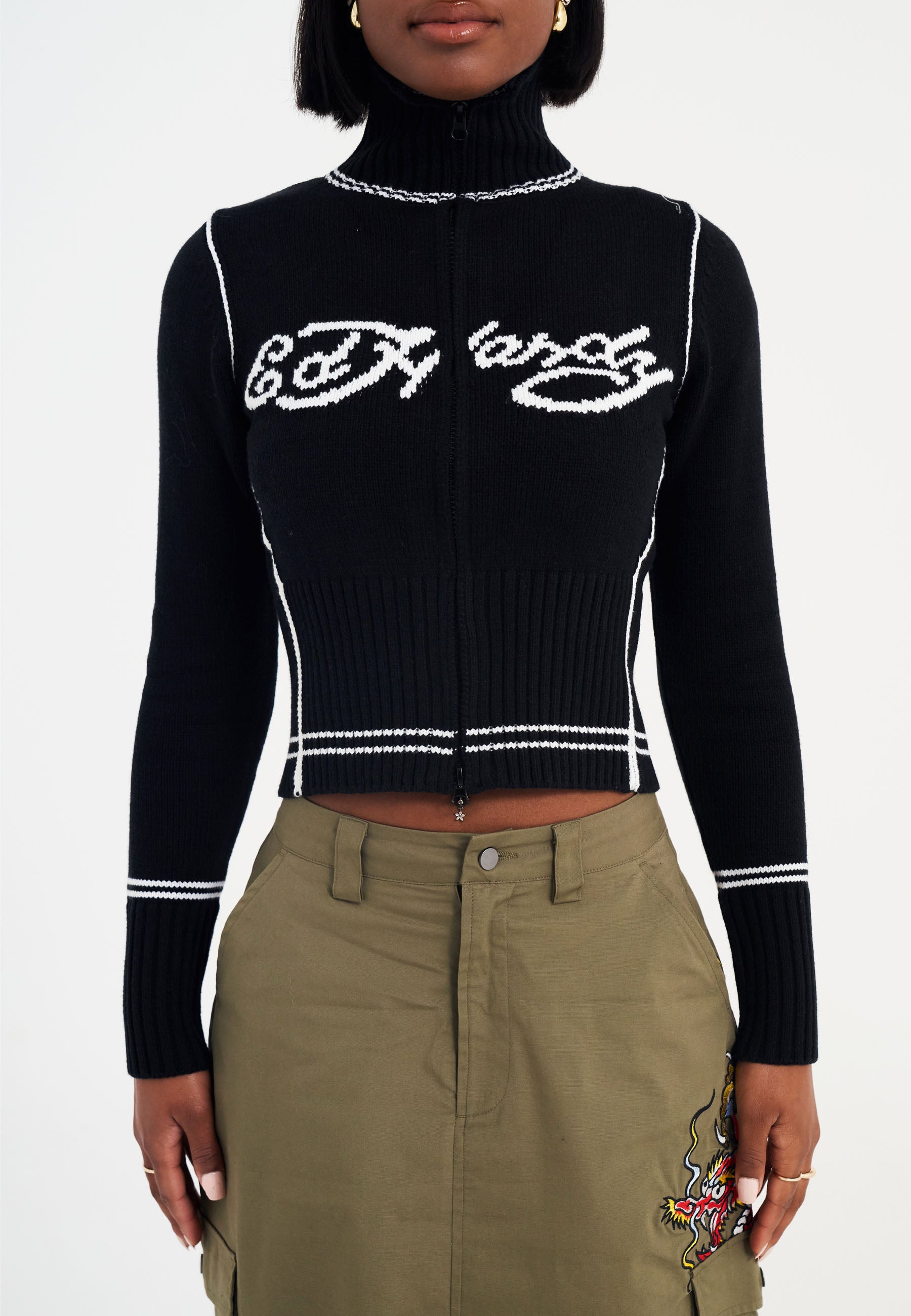 Designed with fine rib knit and contrast colour seams, this jacket showcases a zip fastening, a tonal Ed Hardy signature jacquard across the chest, and a refined jacquard back graphic.