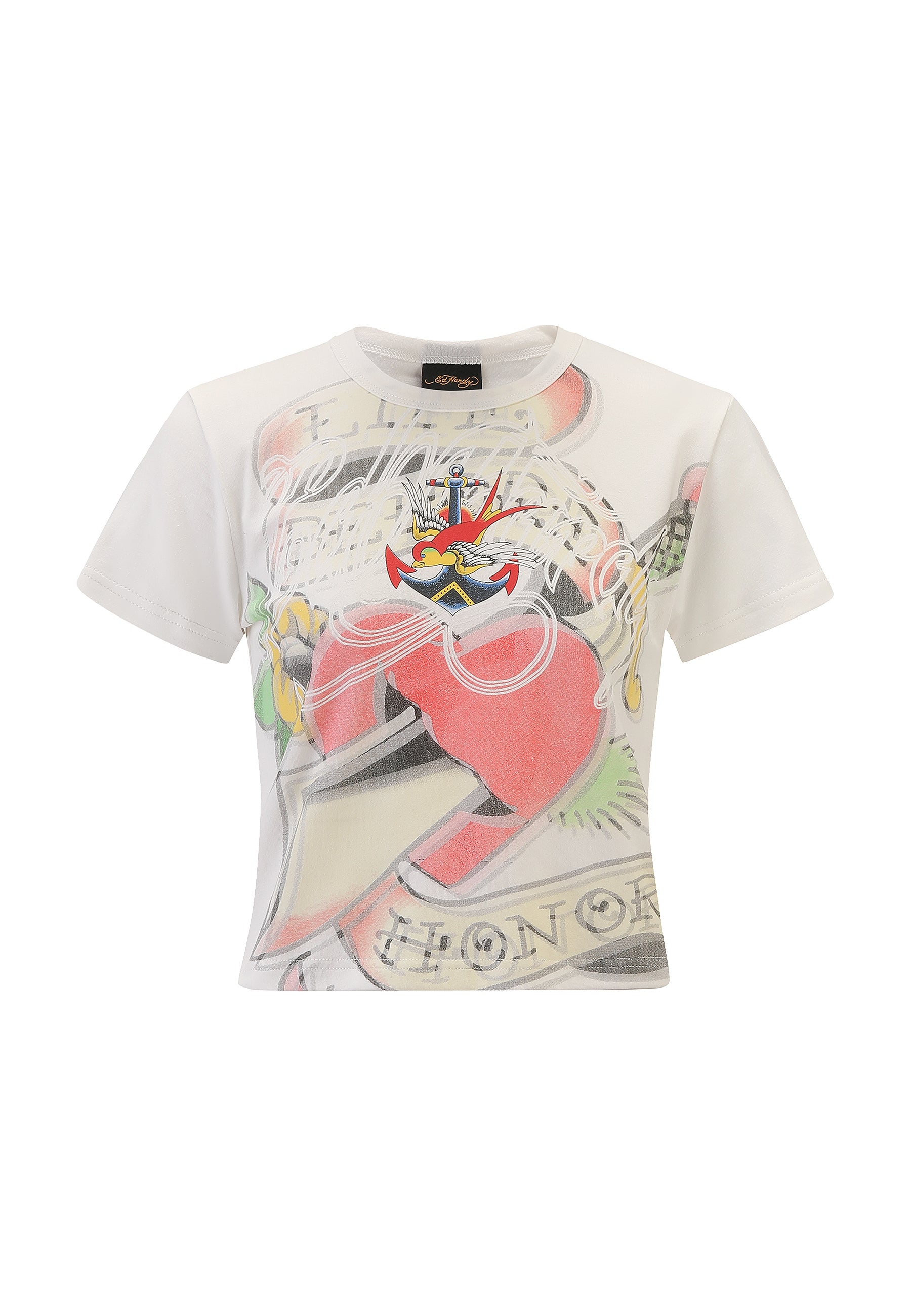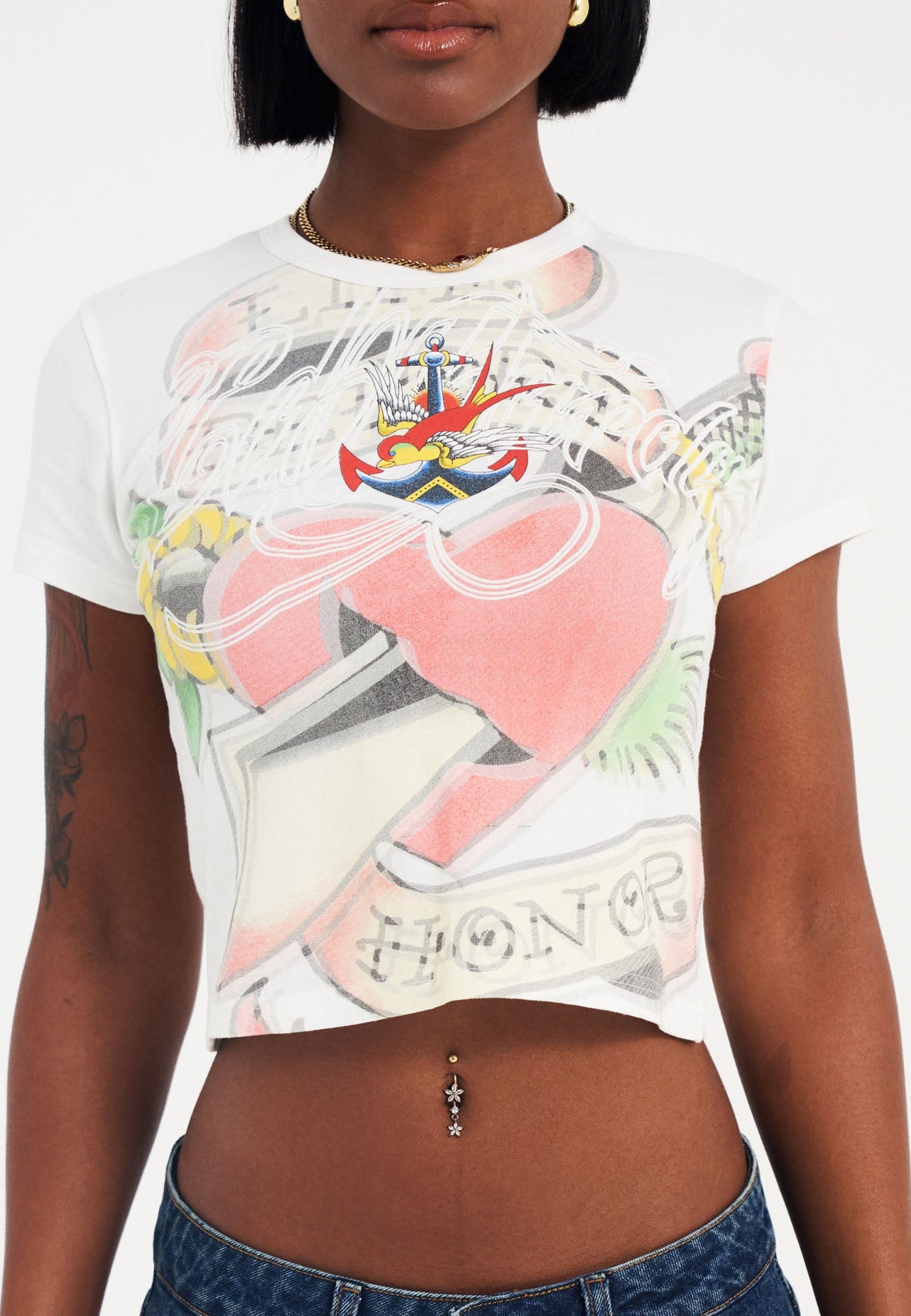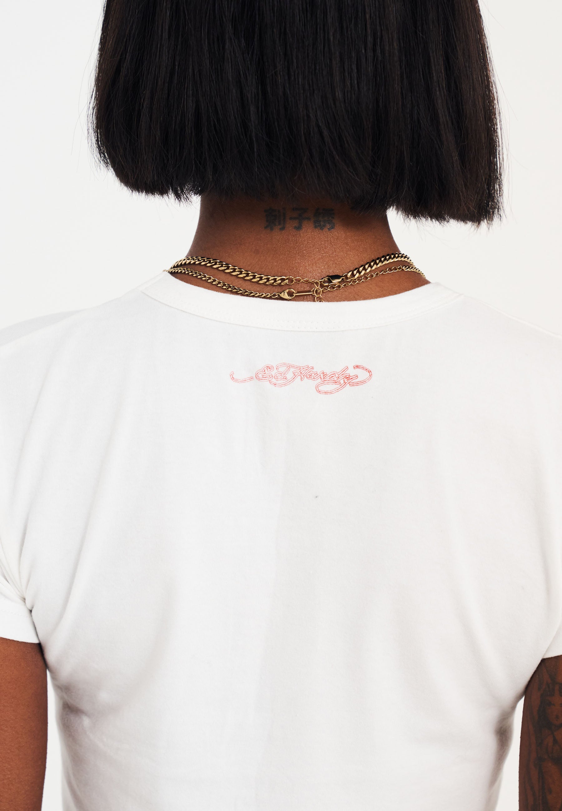 This full-length white graphic t-shirt features a mix of vibrant, layered archival Ed Hardy tattoos with a washed effect. The overlay distortion adds depth and dimension, while the double-lined signature logo and full-color design make it a standout piece. Perfect for adding a bold touch to your everyday look.