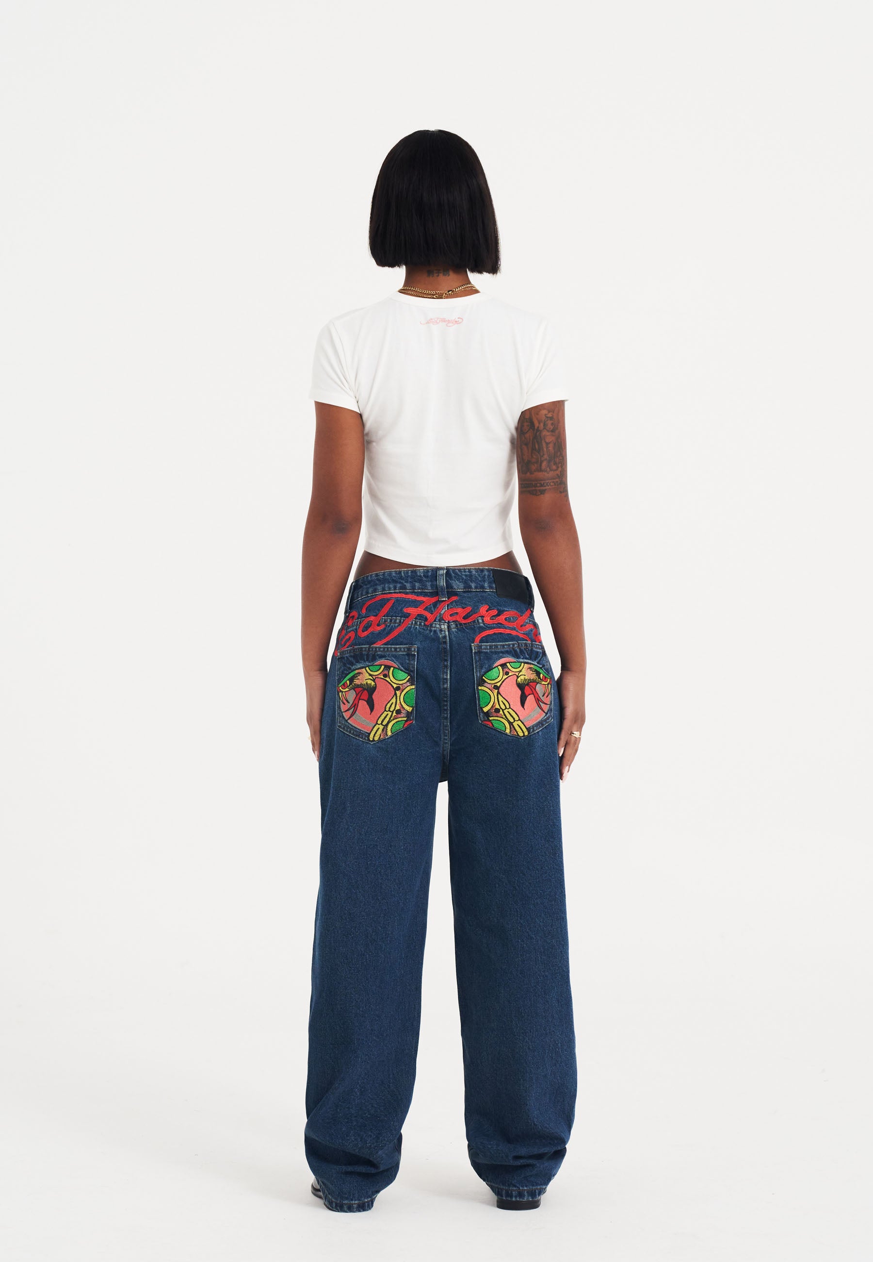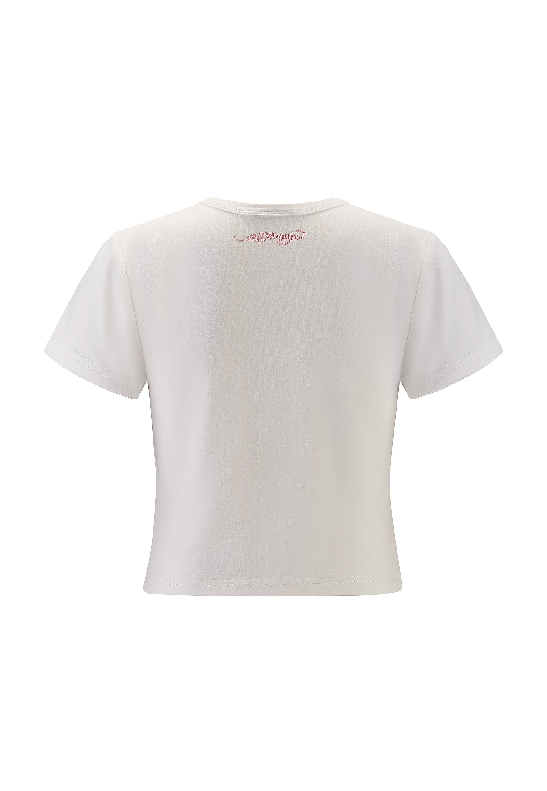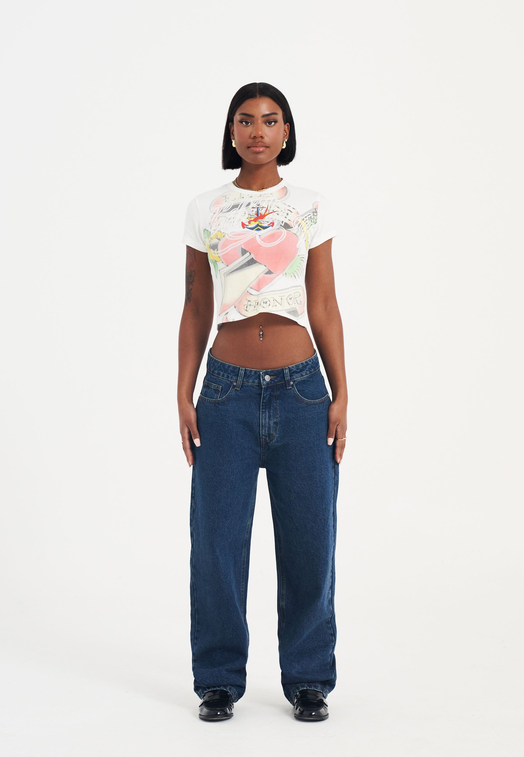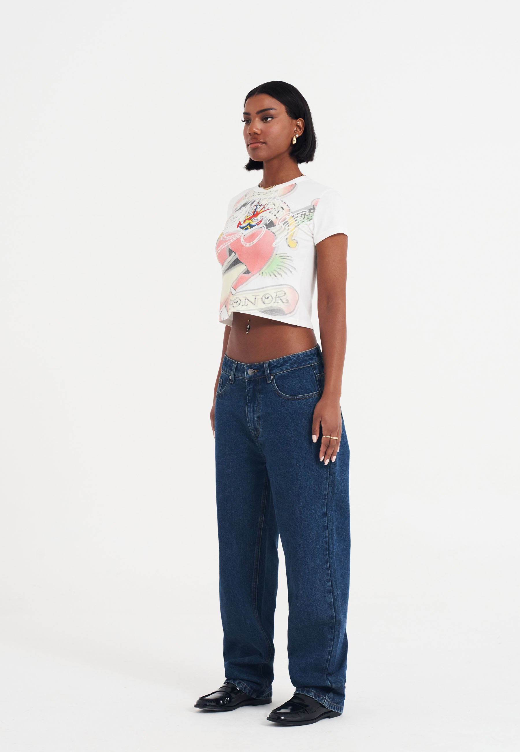 This full-length white graphic t-shirt features a mix of vibrant, layered archival Ed Hardy tattoos with a washed effect. The overlay distortion adds depth and dimension, while the double-lined signature logo and full-color design make it a standout piece. Perfect for adding a bold touch to your everyday look.