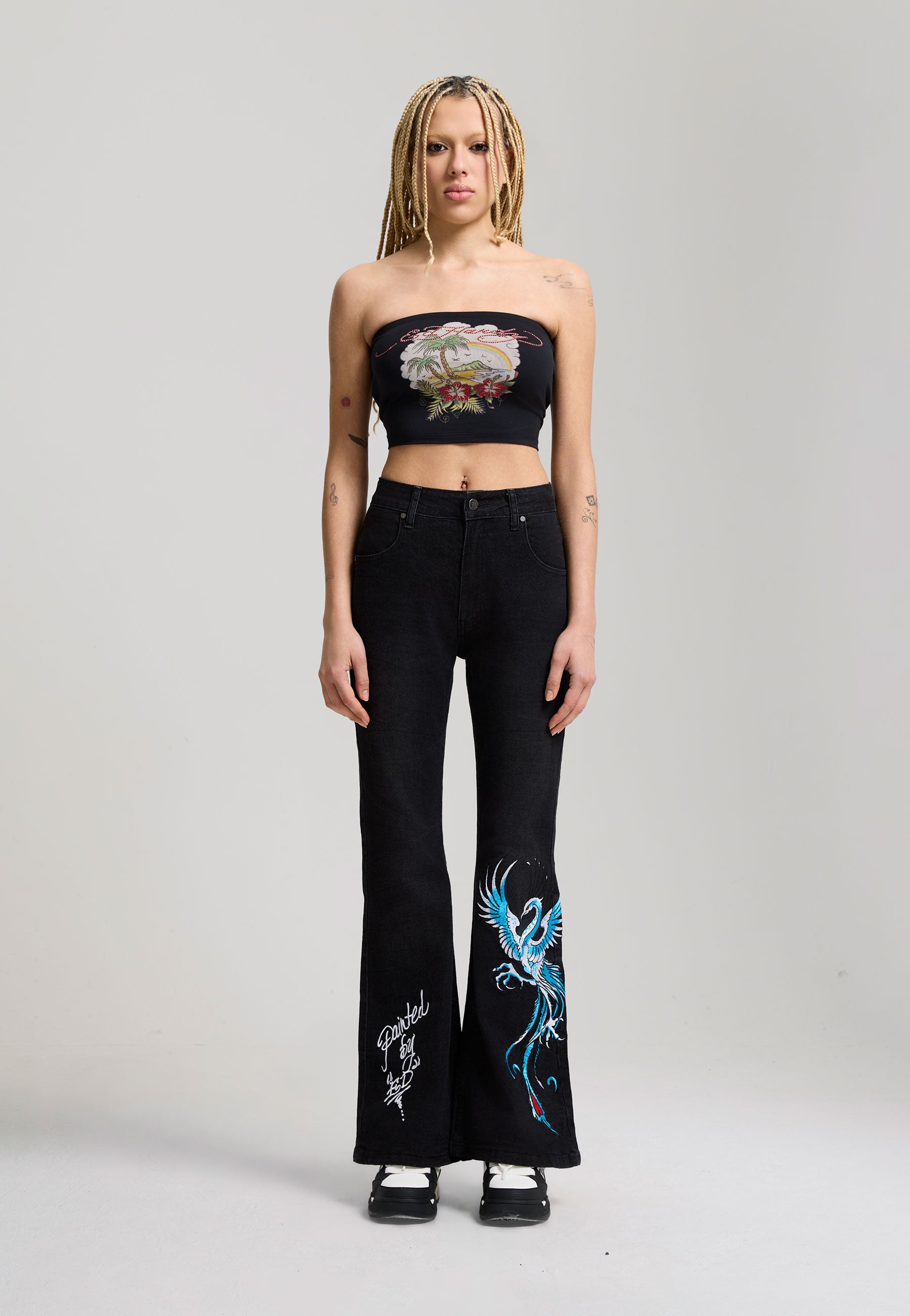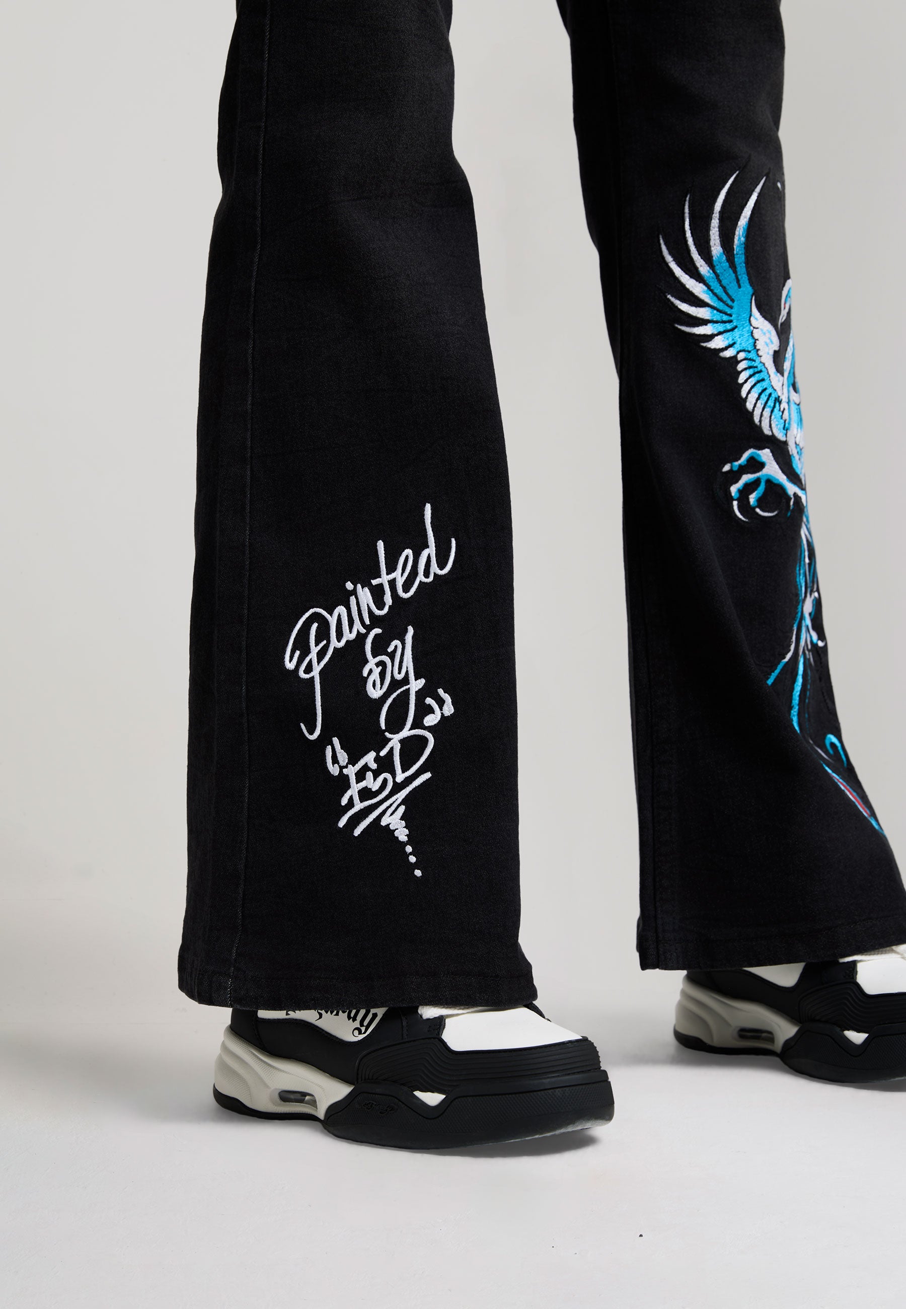 FLARED FIT WASHED 90% COTTON 10% POLYESTER GOTHIC ED HARDY PLASTEROL PRINT BEHIND BACK POCKETS RISING PHOENIX EMBROIDERY TO FRONT LEFT LEG PAINTED BY ED EMBROIDERY TO FRONT RIGHT LEG