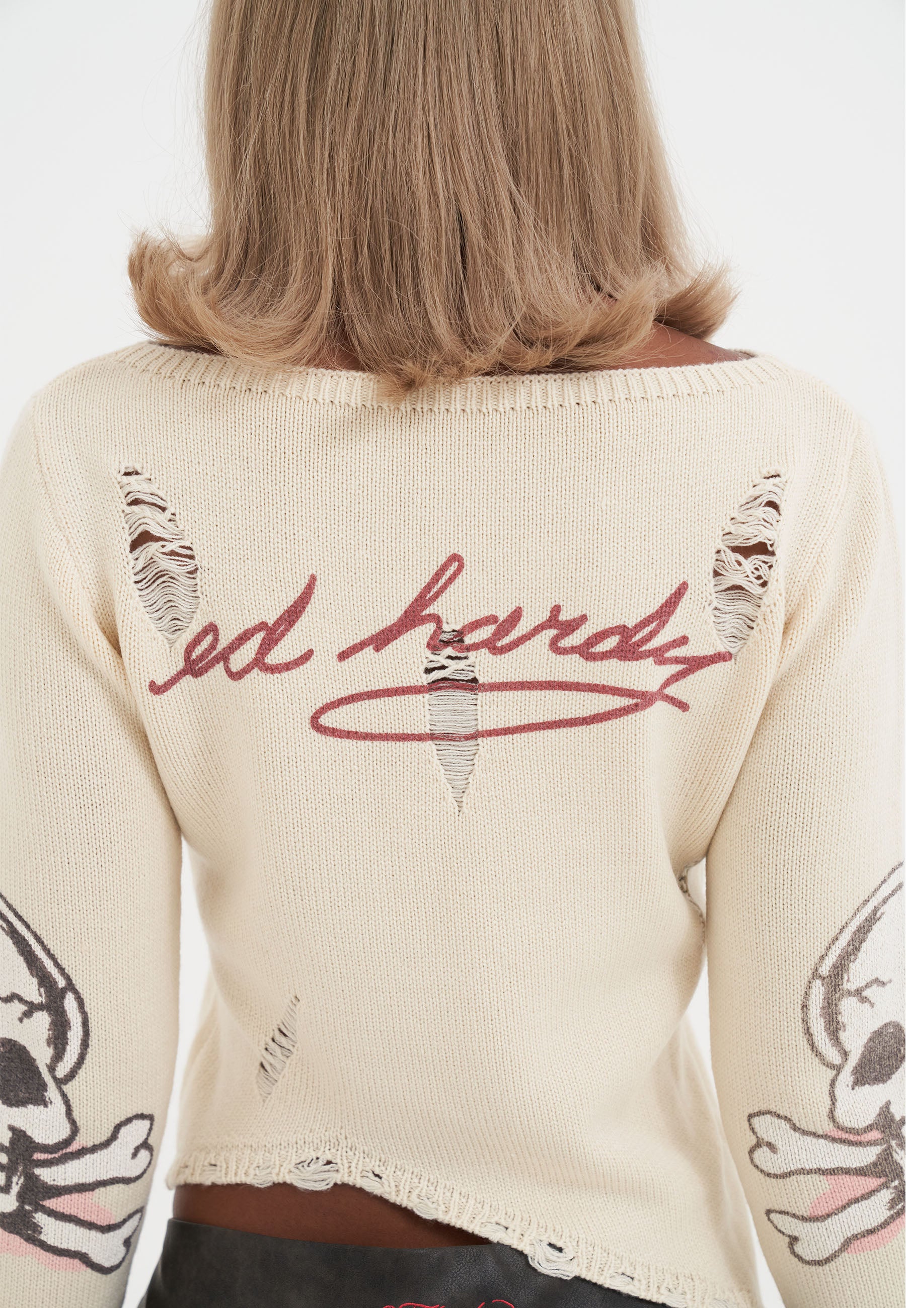 Womens Skull And Roses Distressed Knitted Jumper - Ecru