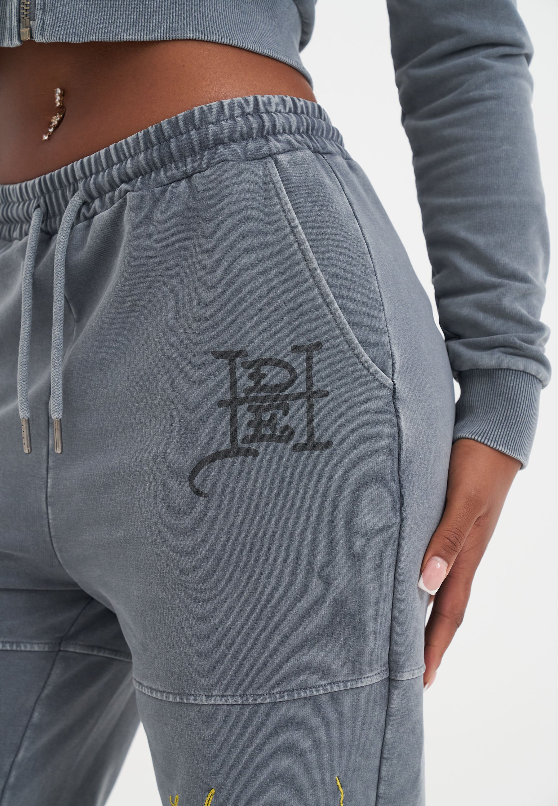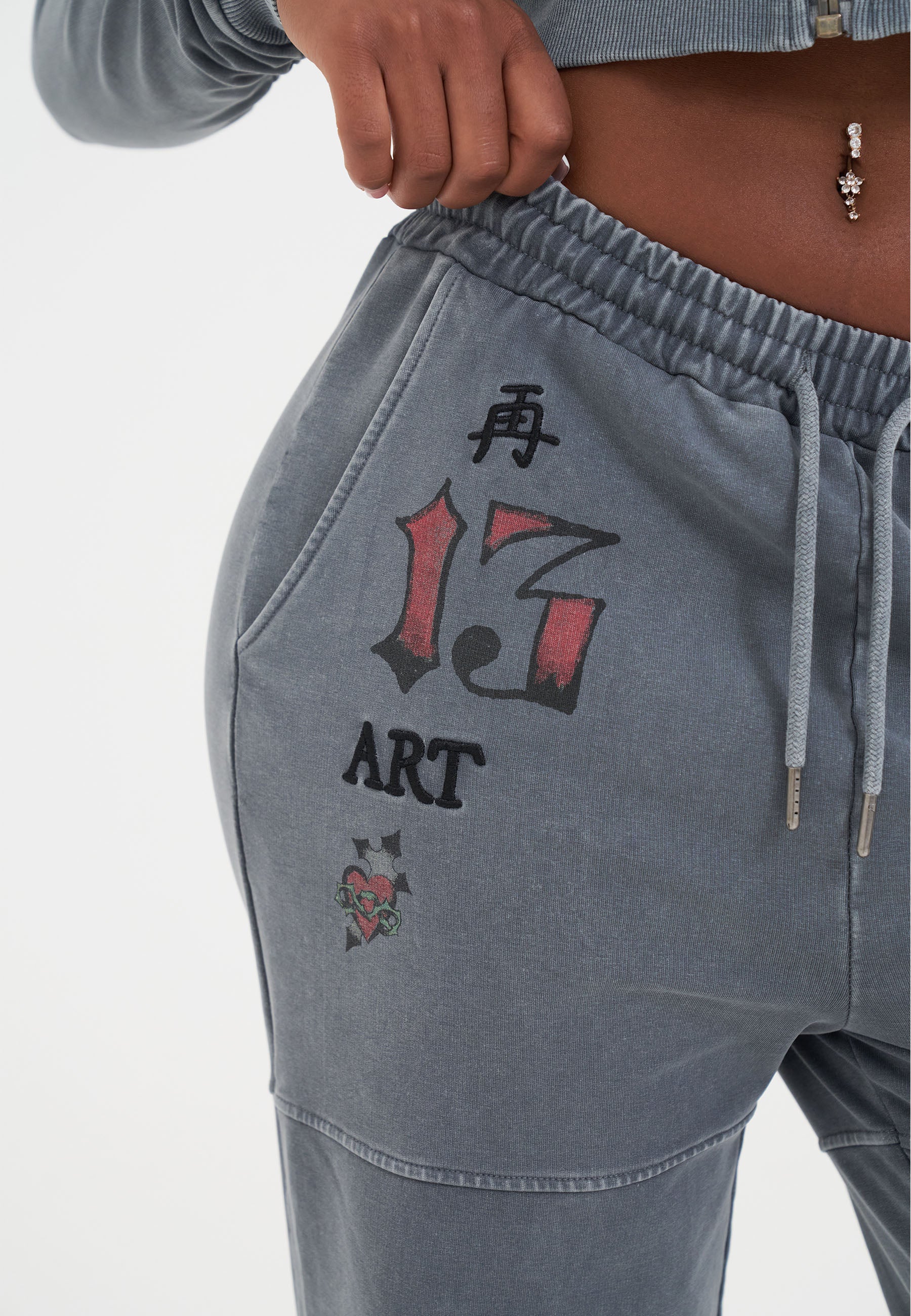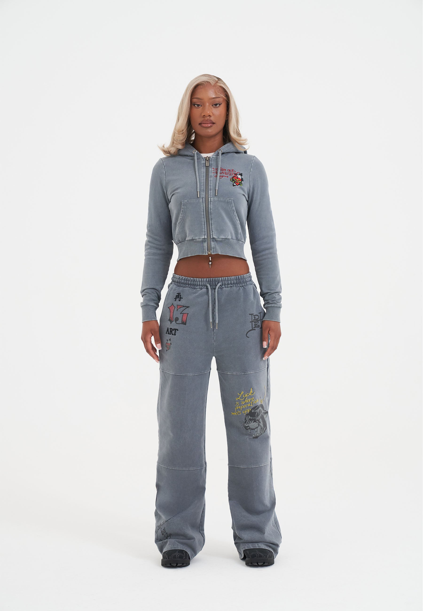 WOMENS TATTOO COLLAGE SEAM DETAIL WIDE LEG JOGGERS in Charcoal