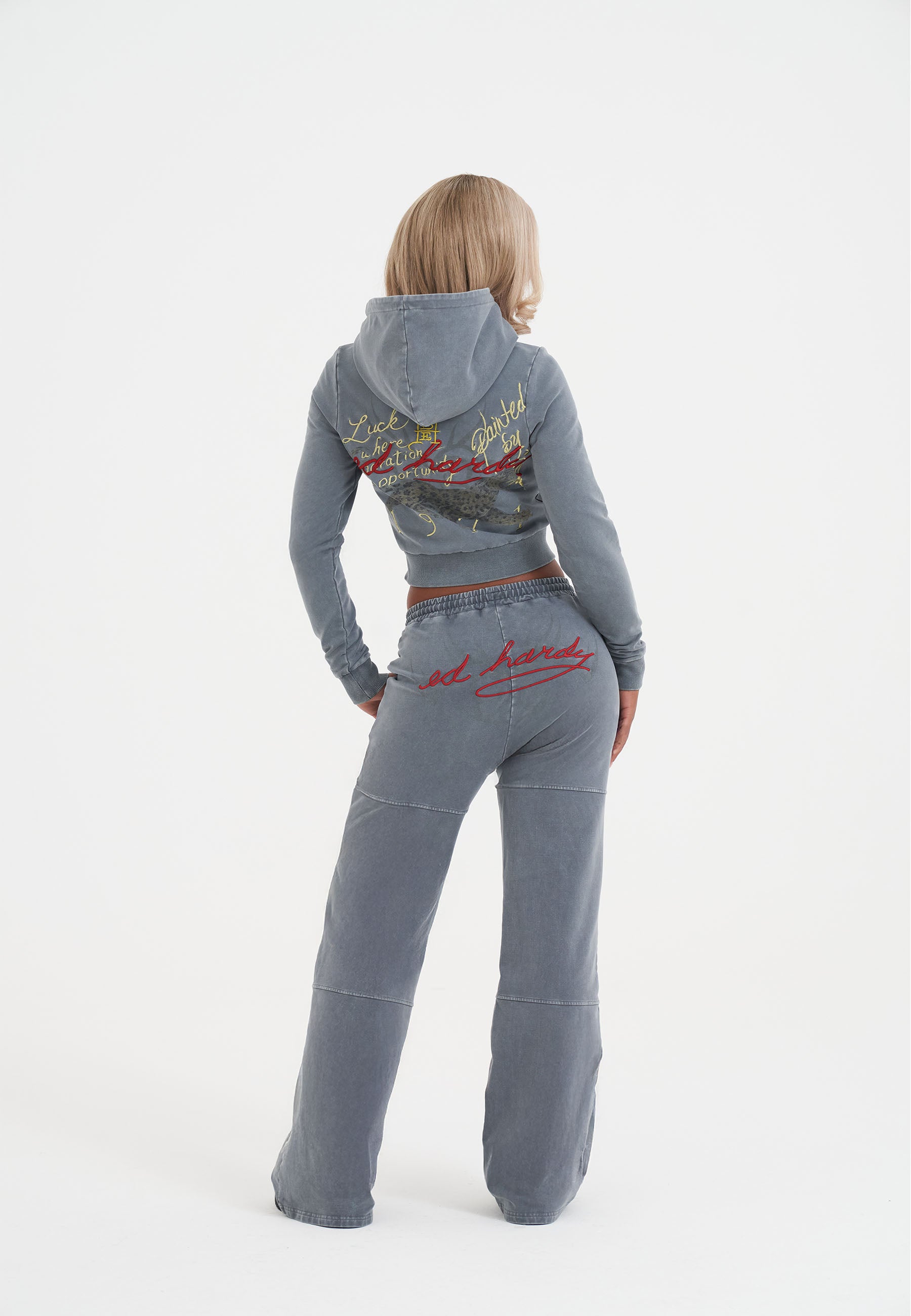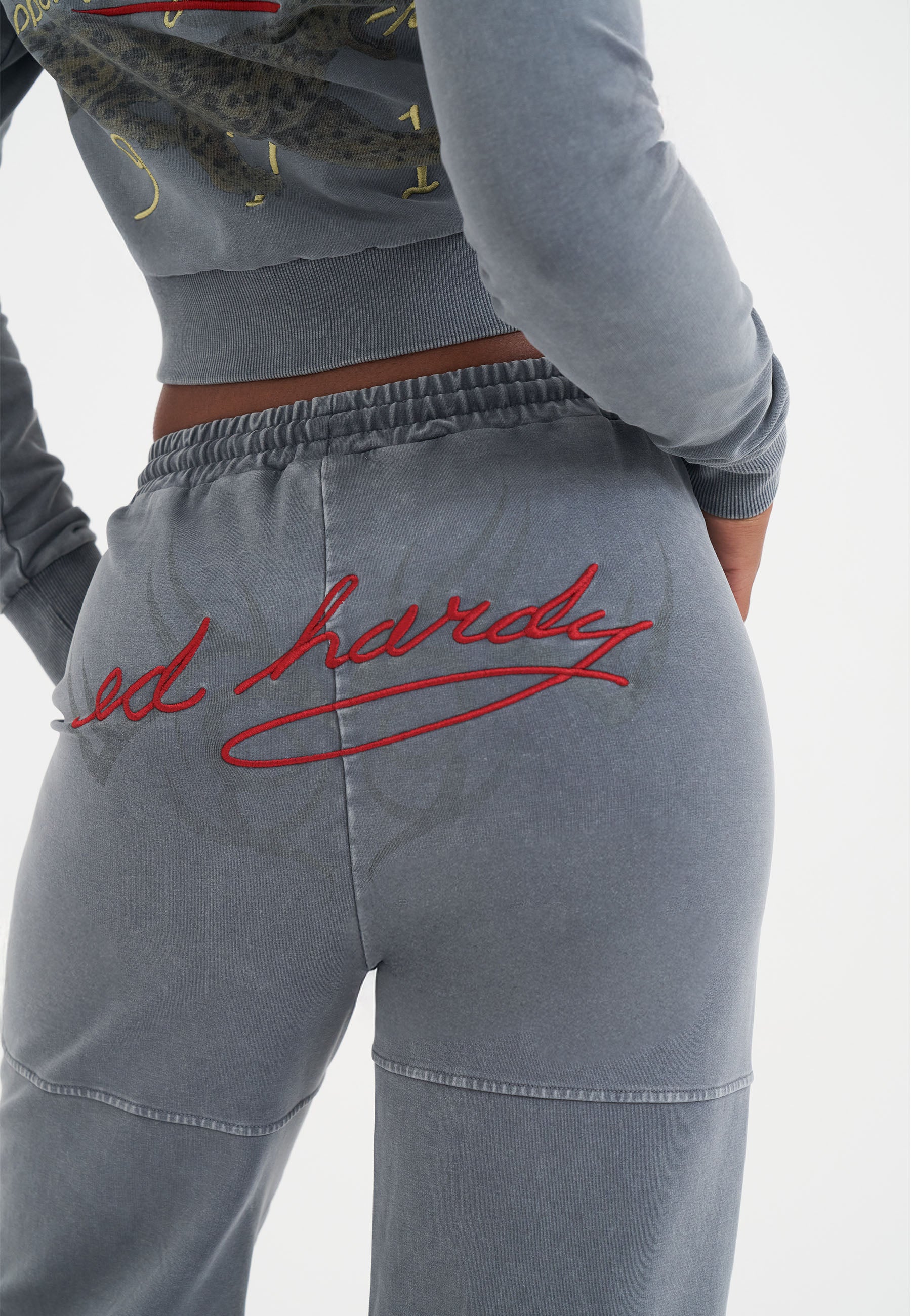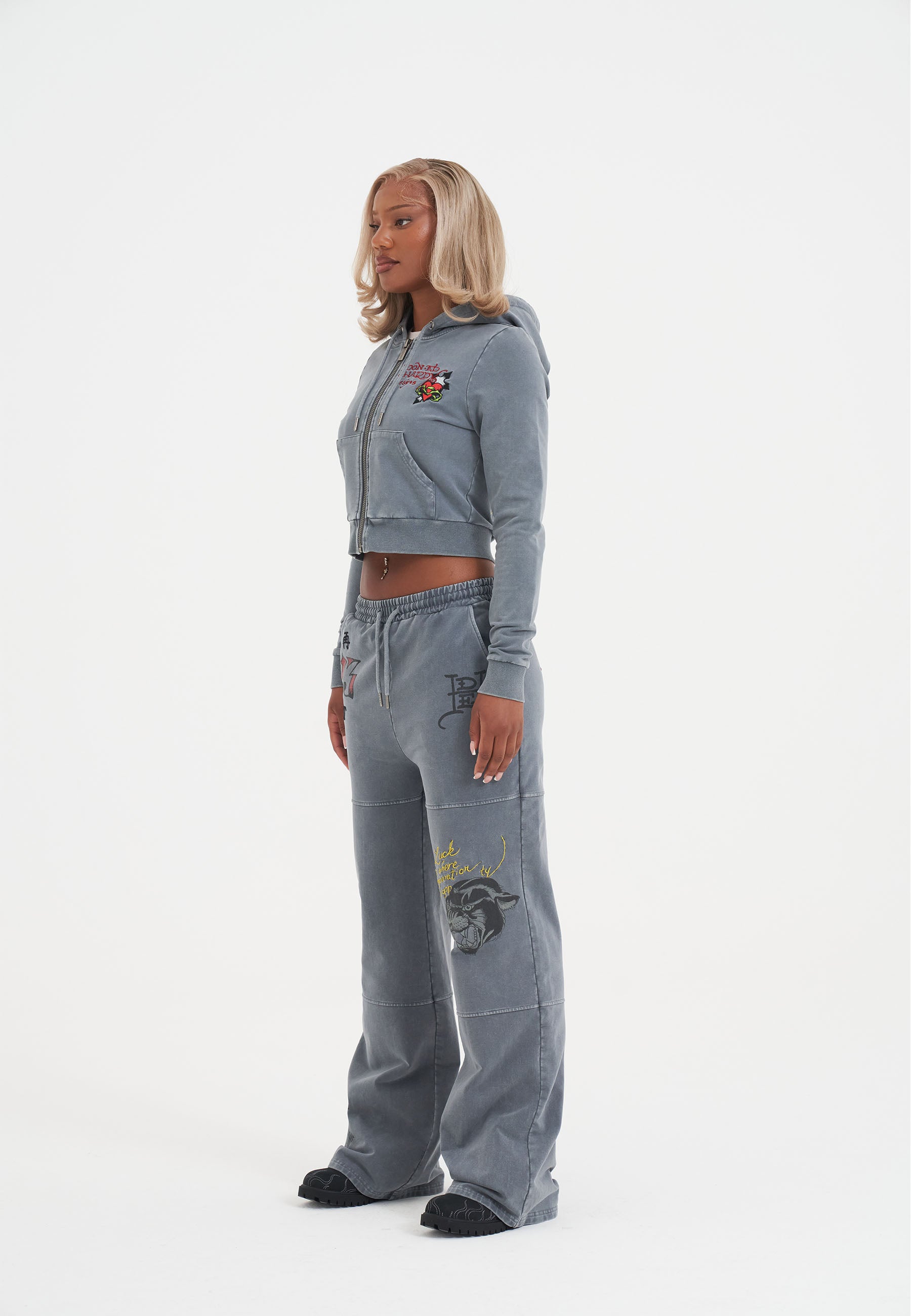 WOMENS TATTOO COLLAGE SEAM DETAIL WIDE LEG JOGGERS in Charcoal
