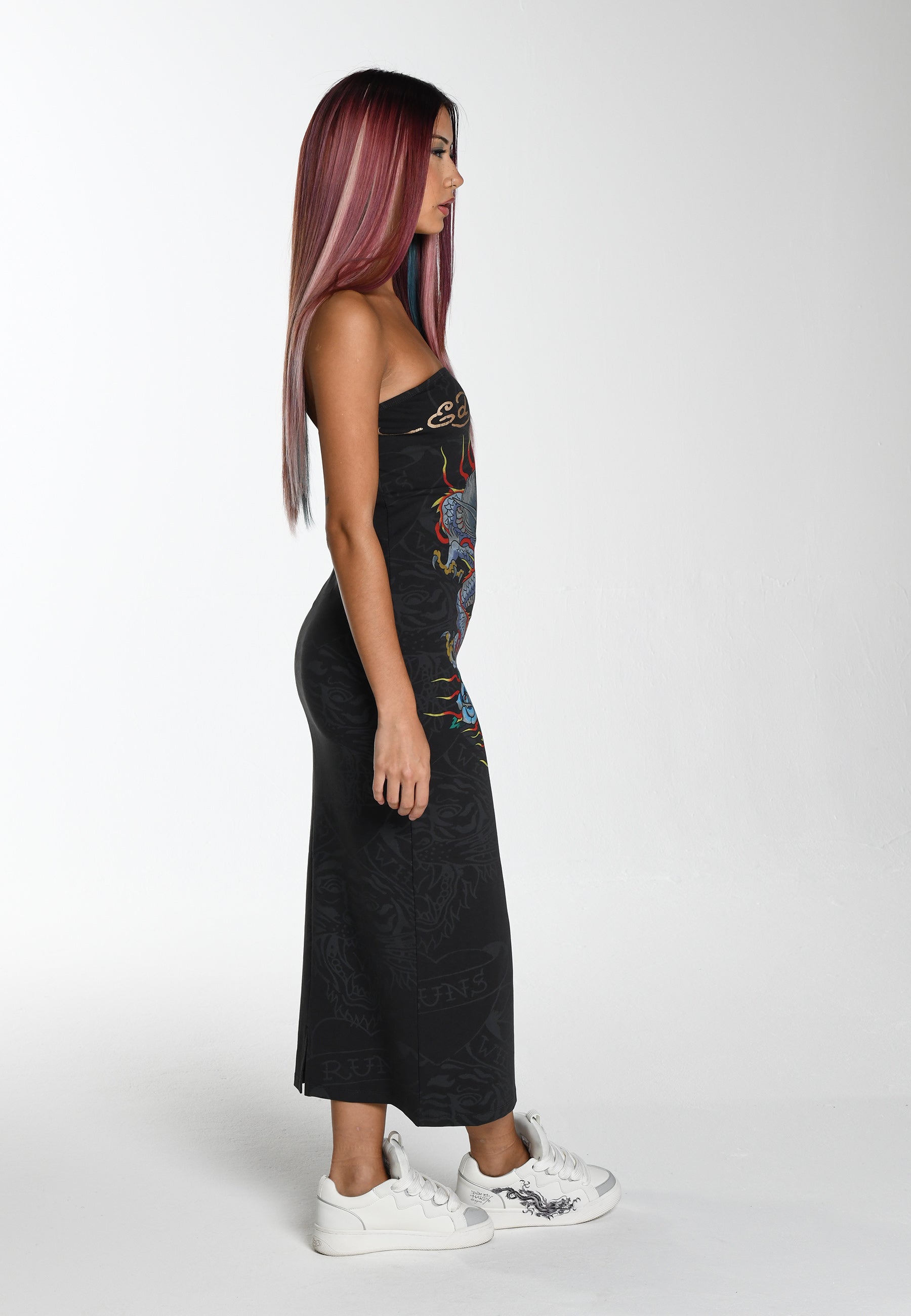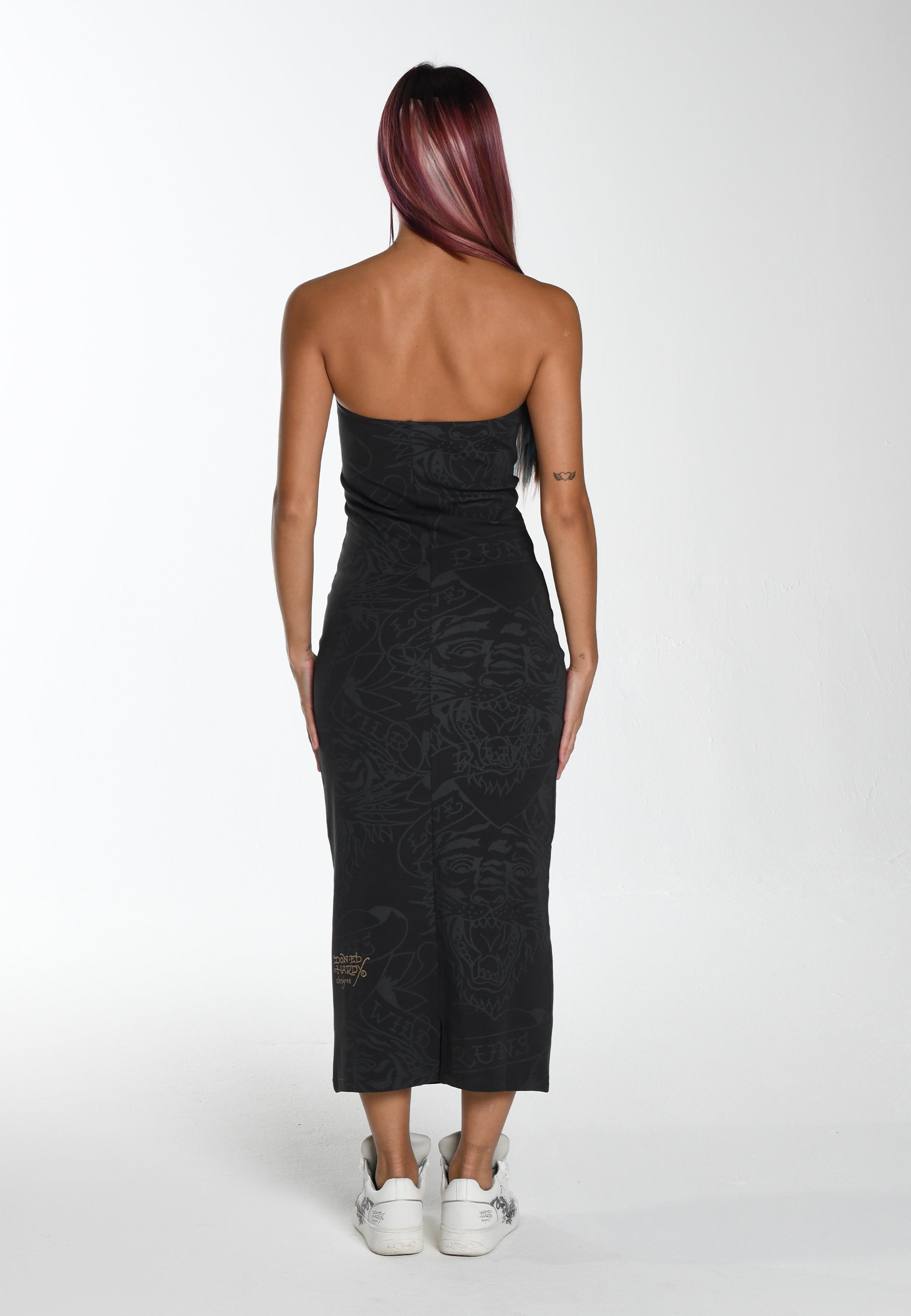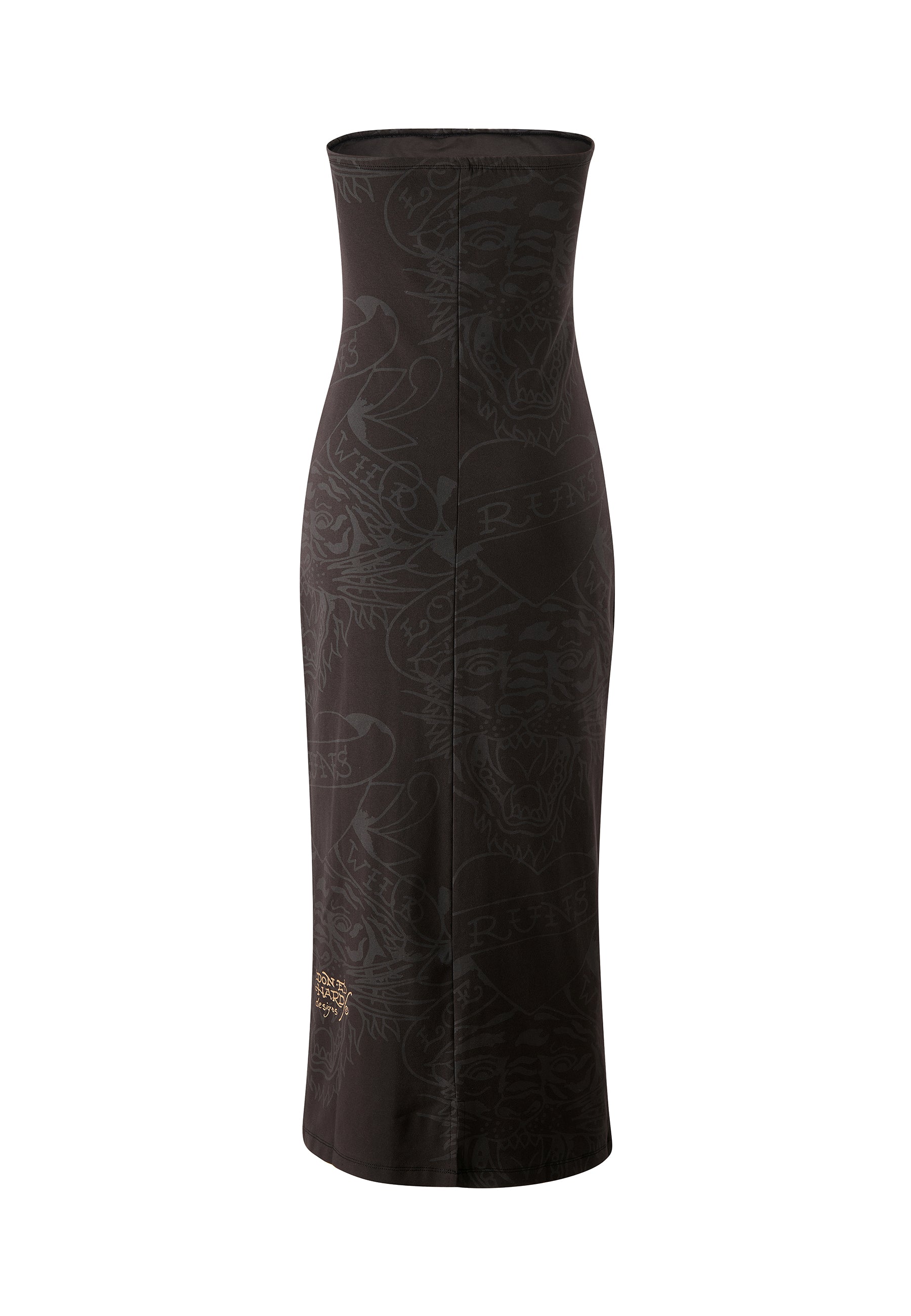 This incredibly flattering bandeau dress is meticulously crafted from high-quality charcoal cotton and spandex. It showcases Ed's signature designs in a captivating interplay of shadow and full-colour prints.
