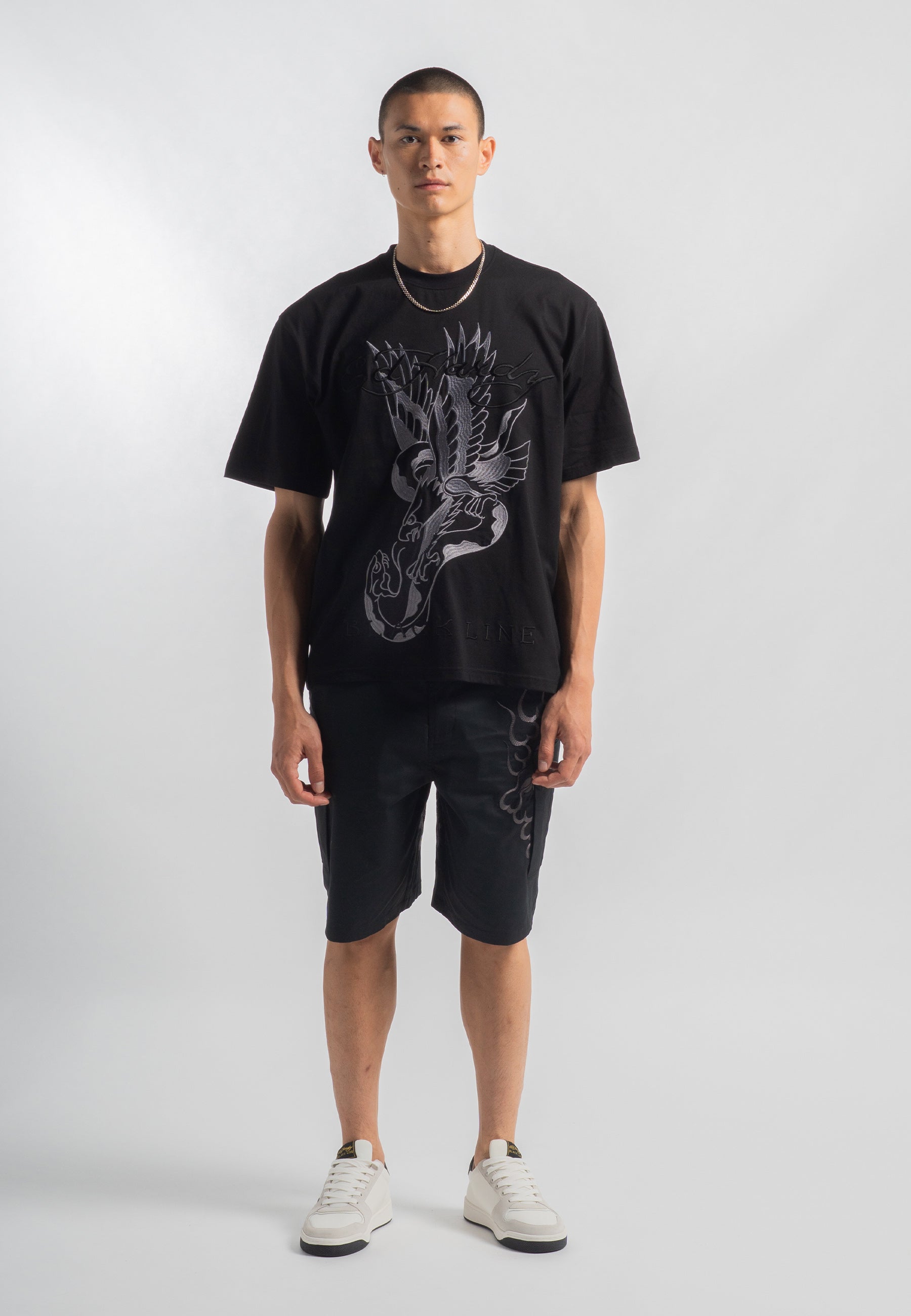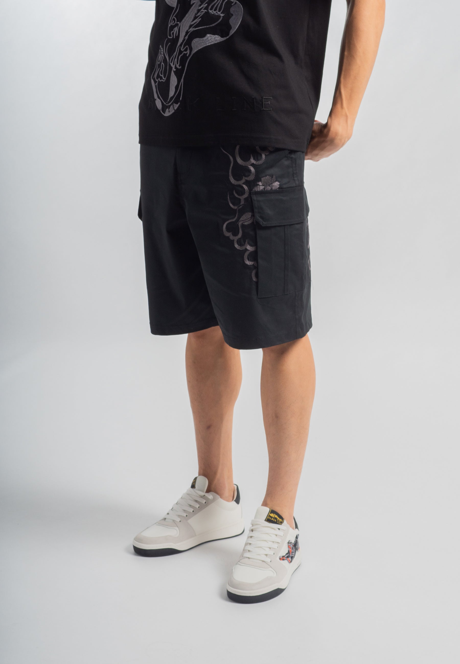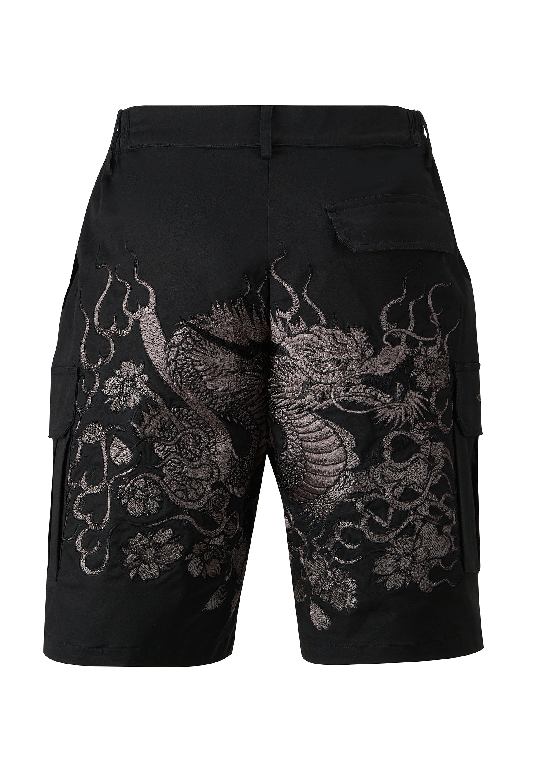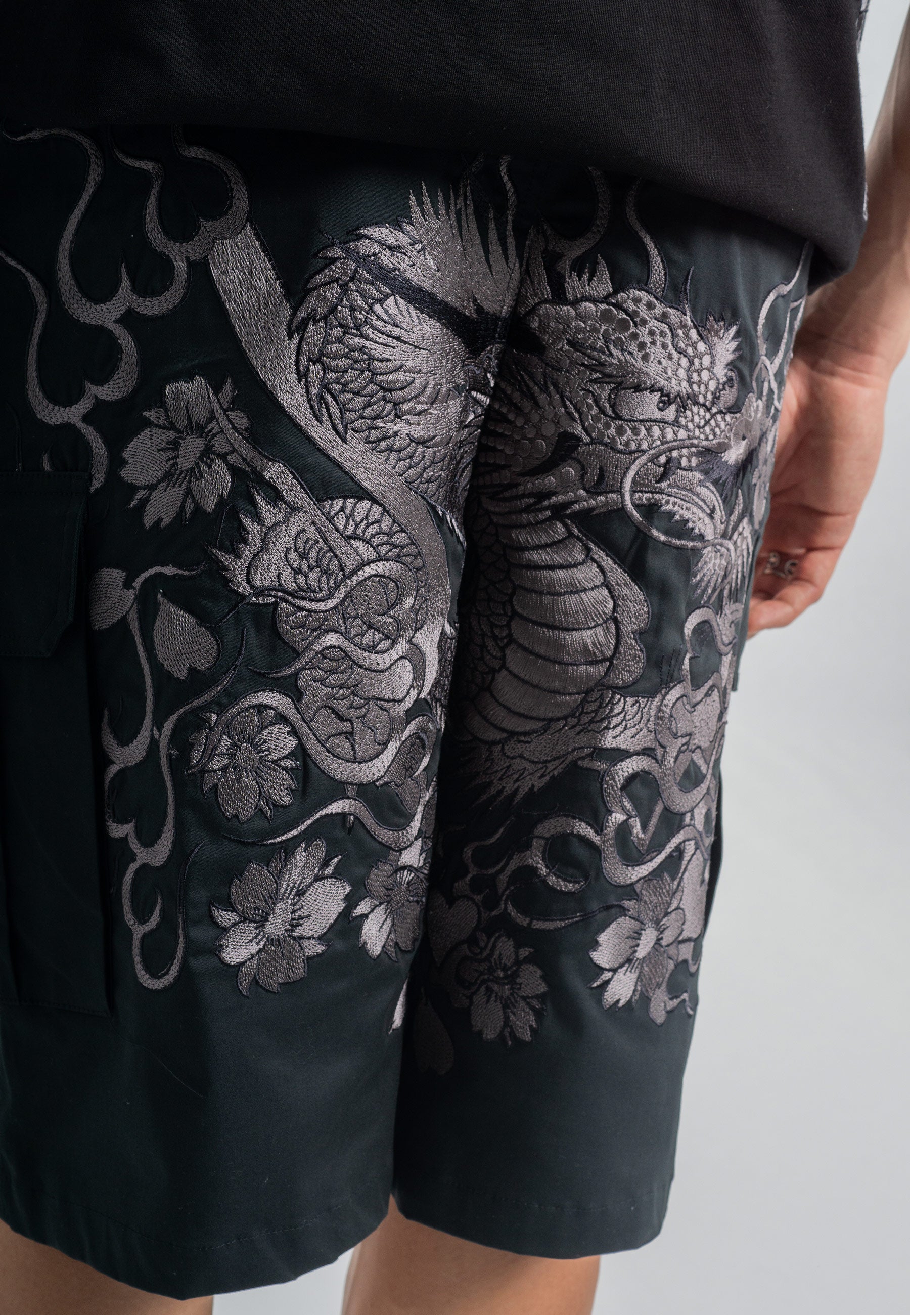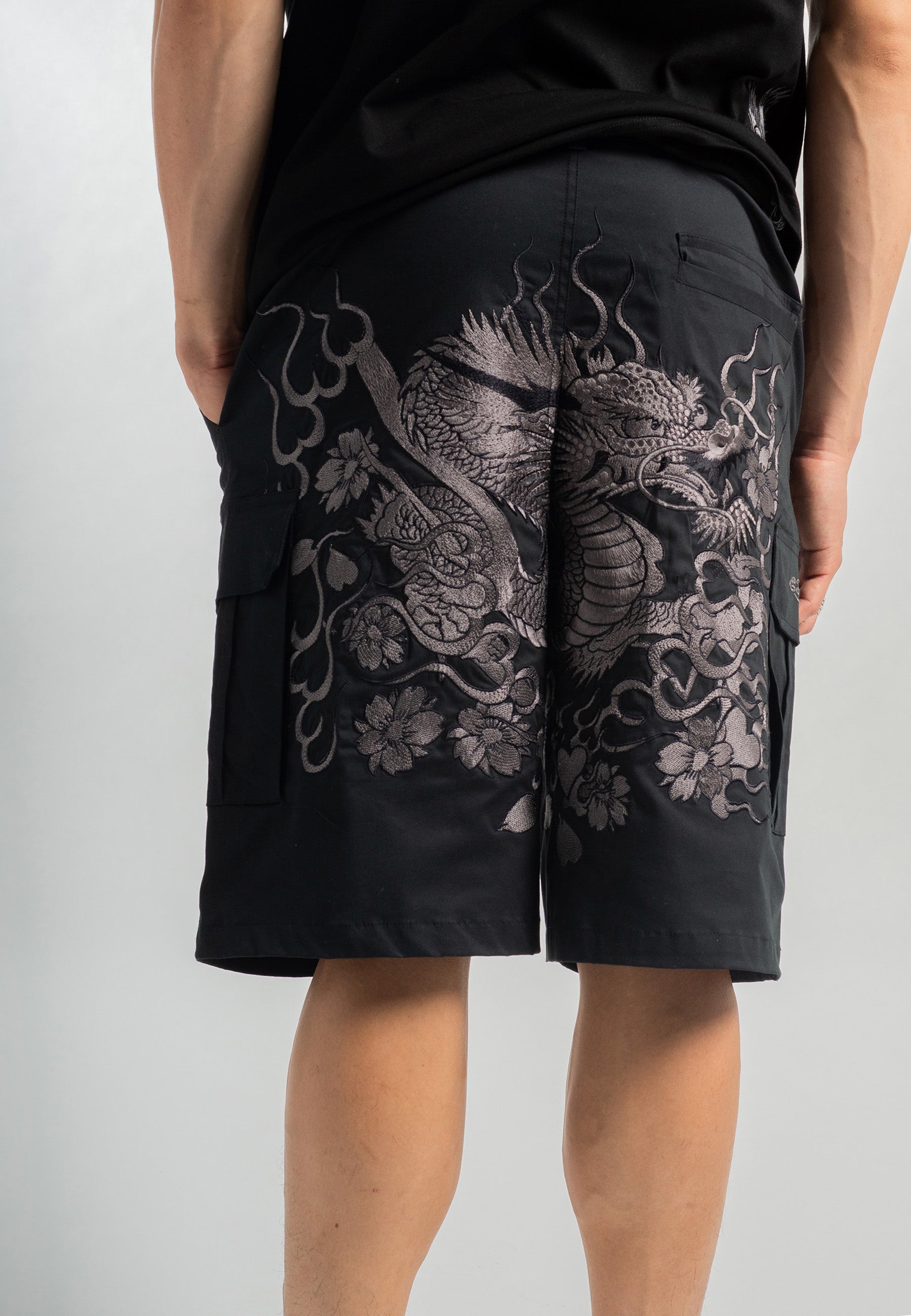 Shorts masculinos de combate bordados vintage-Dragon - preto