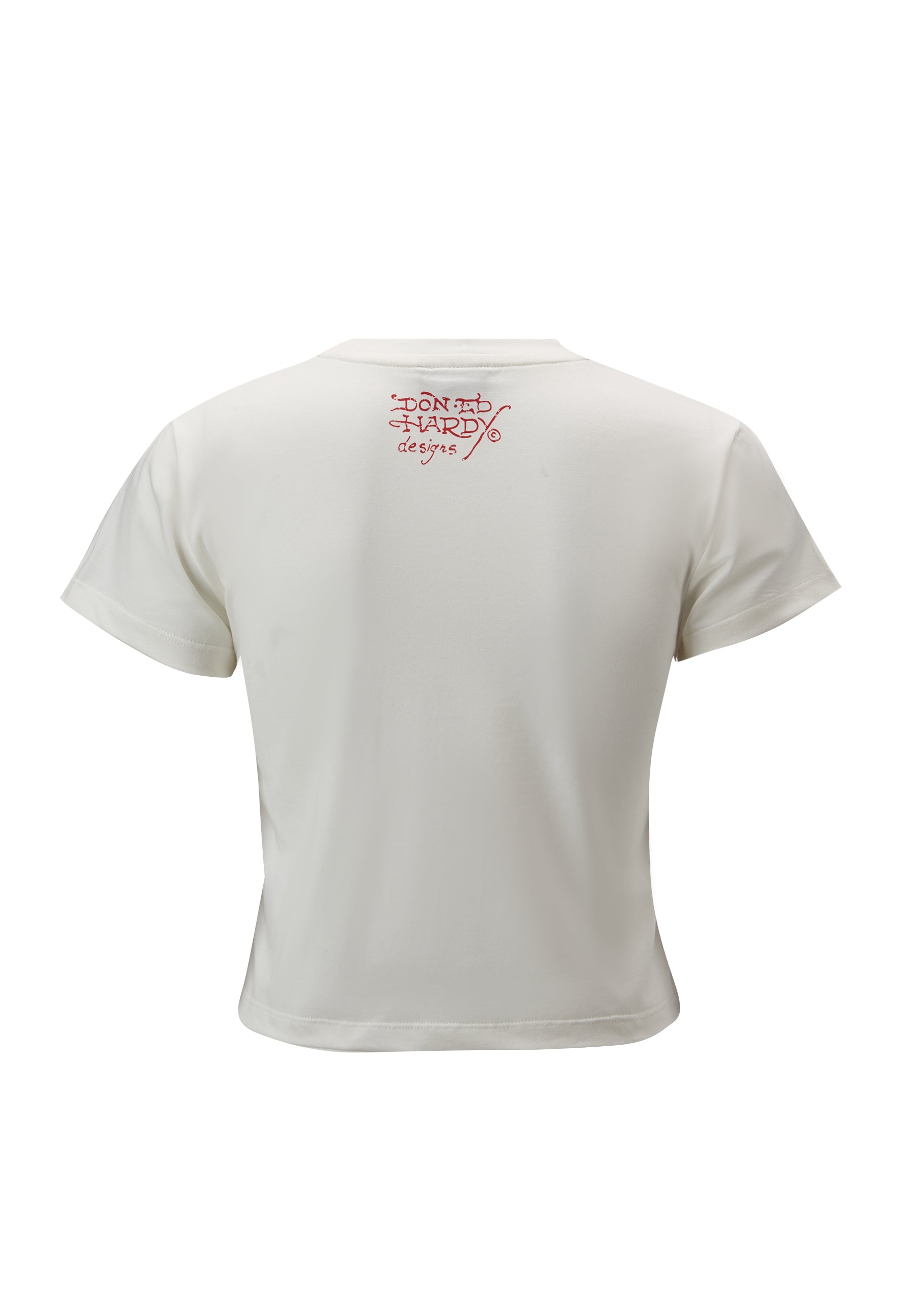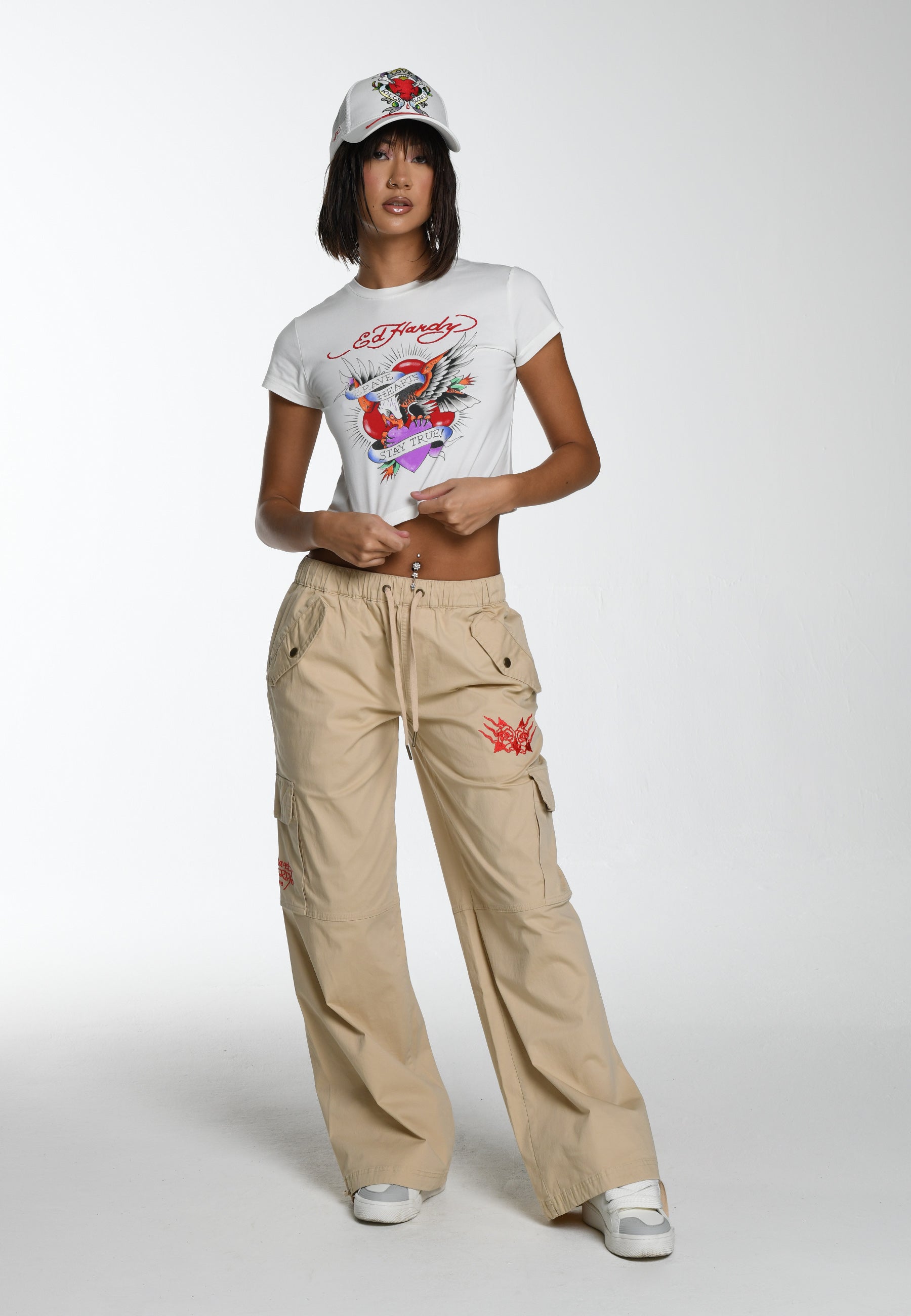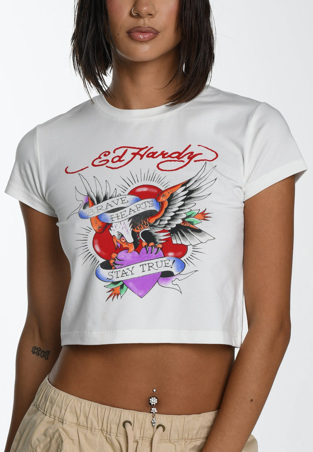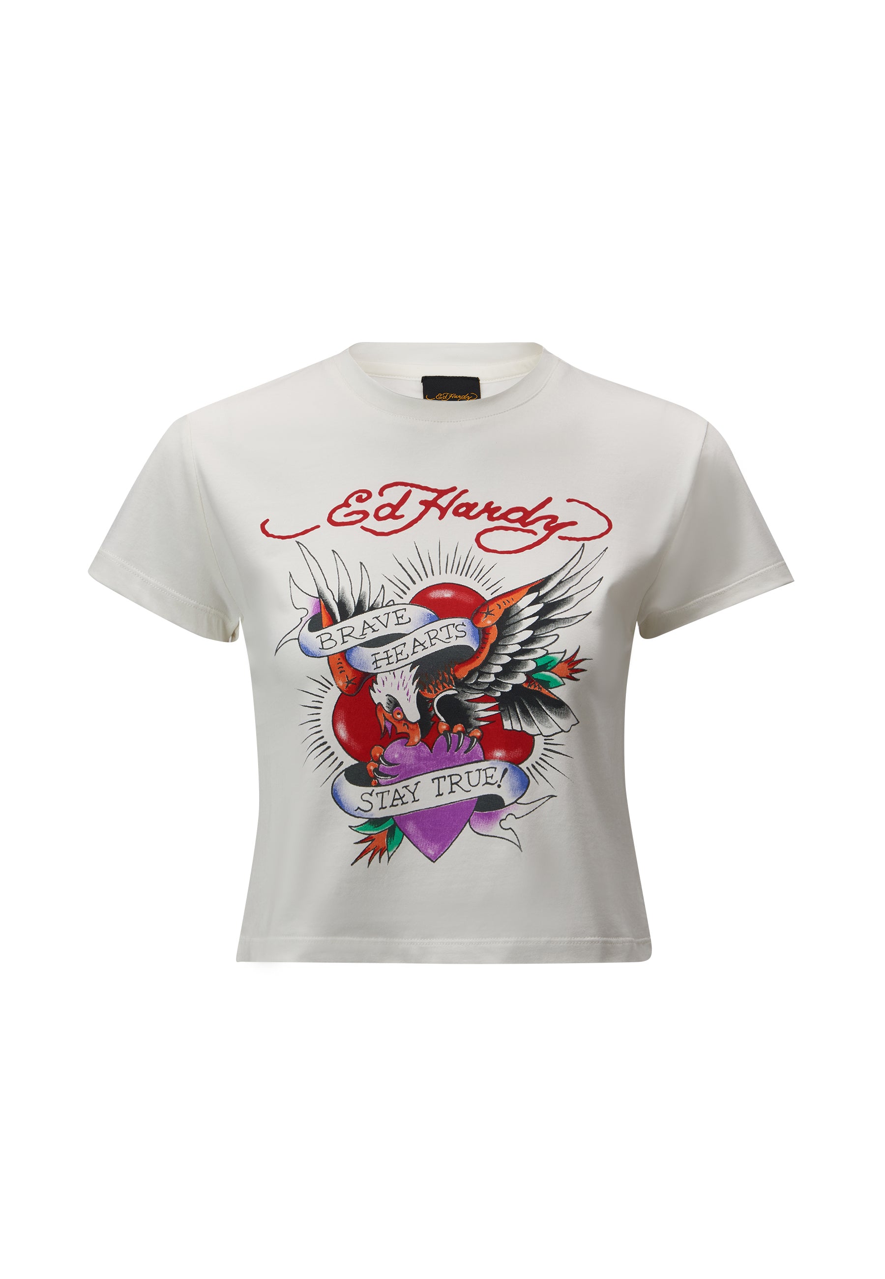 A camiseta cropped para bebê Brave Hearts apresenta a icônica estampa "Brave Hearts Stay True" com uma vibrante estampa colorida da águia de Ed e o design do coração .