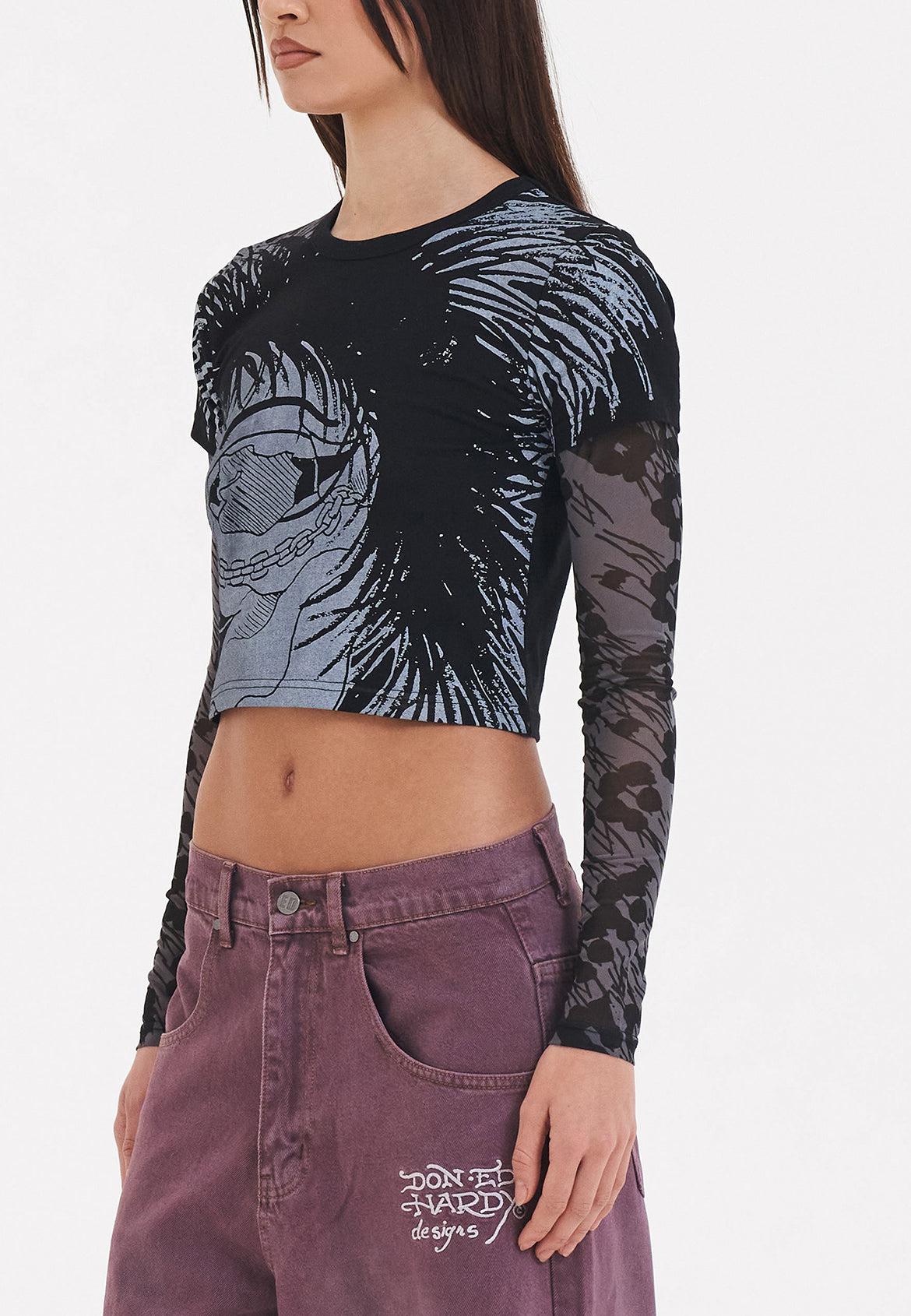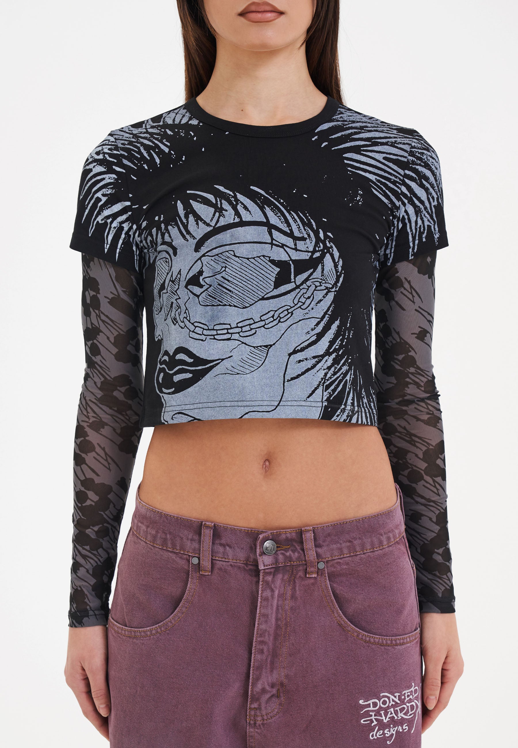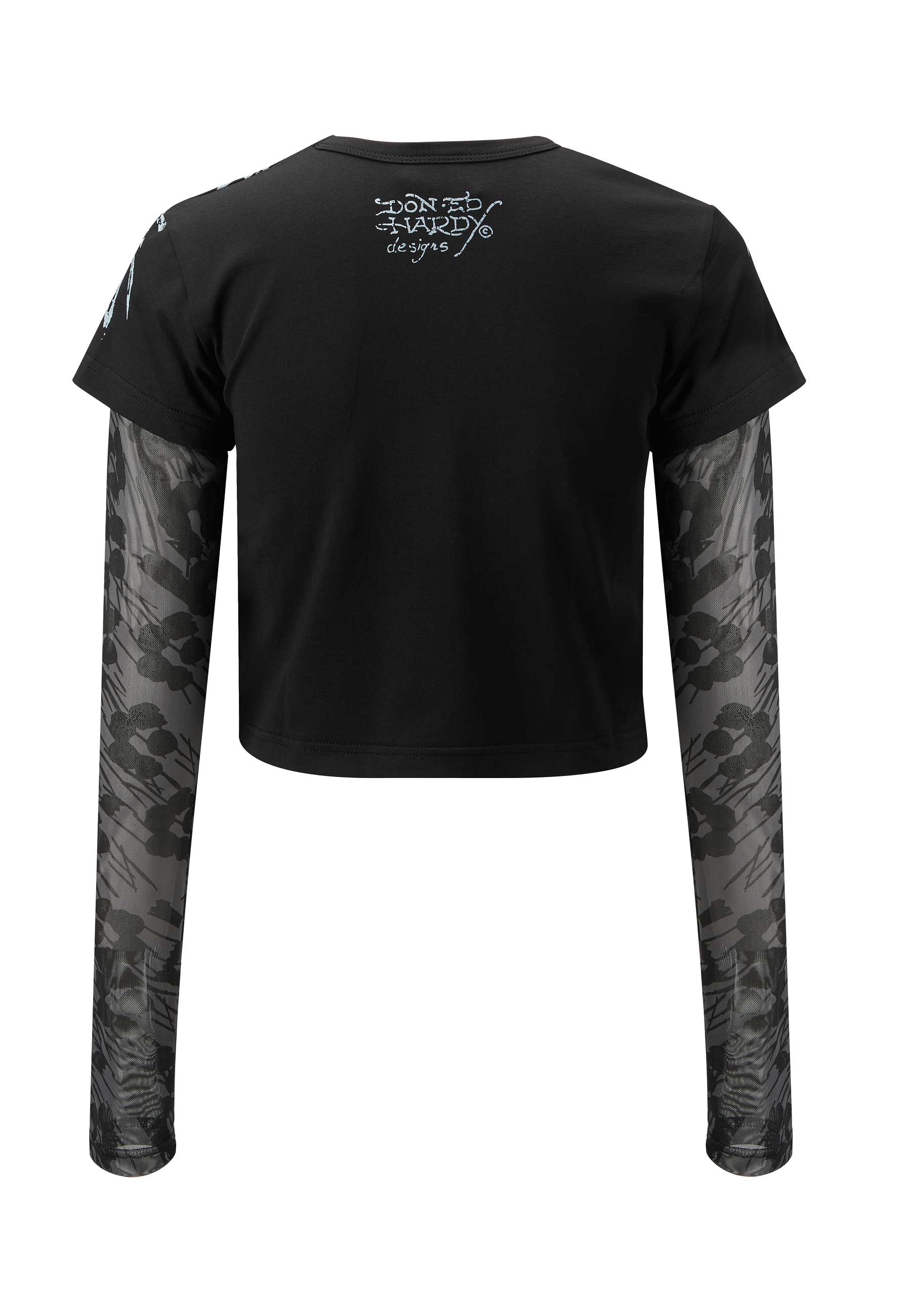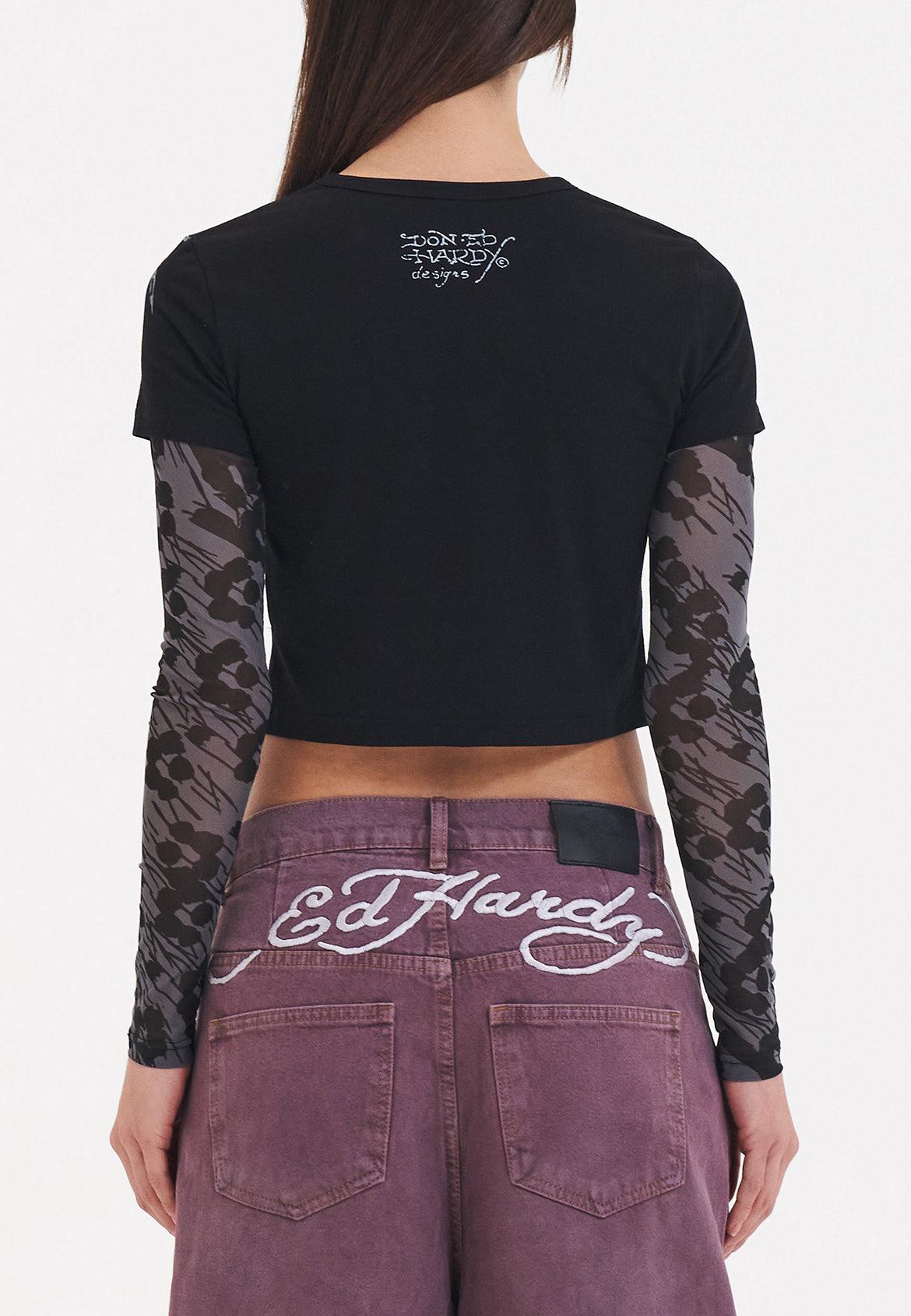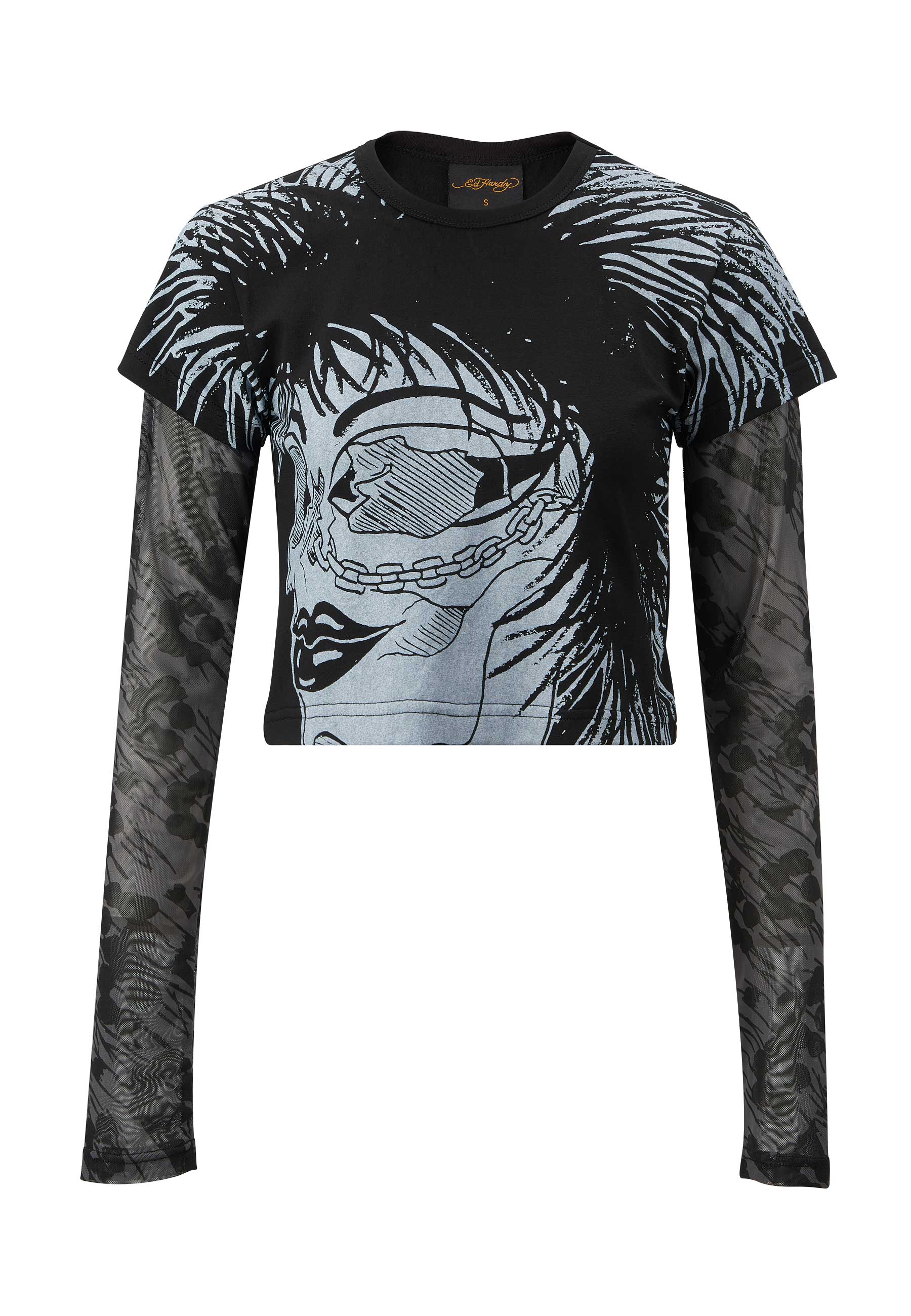A camiseta de manga dupla Pretty in Punk é uma homenagem direta à inspiração punk desta temporada e representa uma nova era distinta de Ed Hardy.