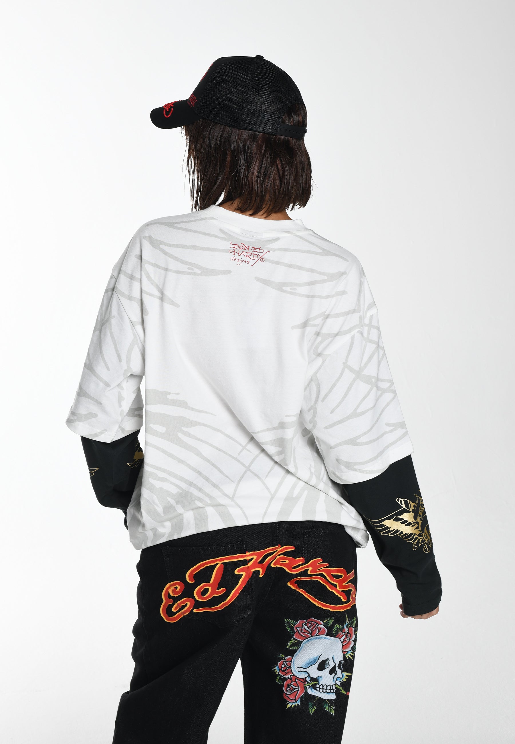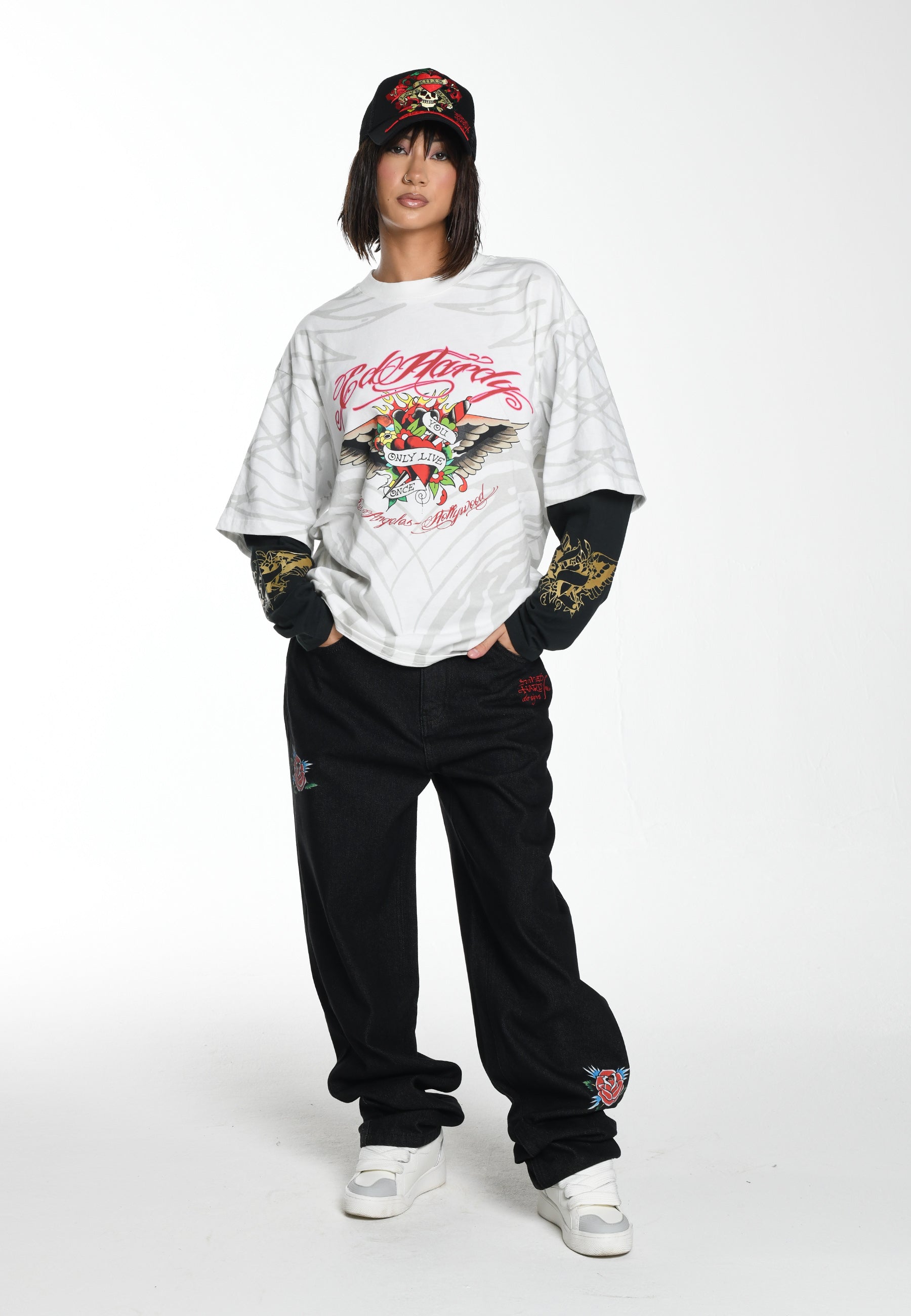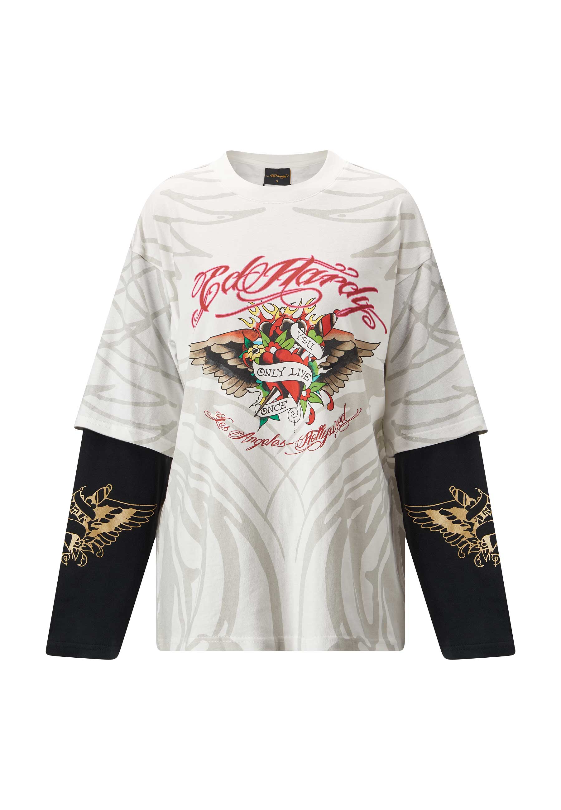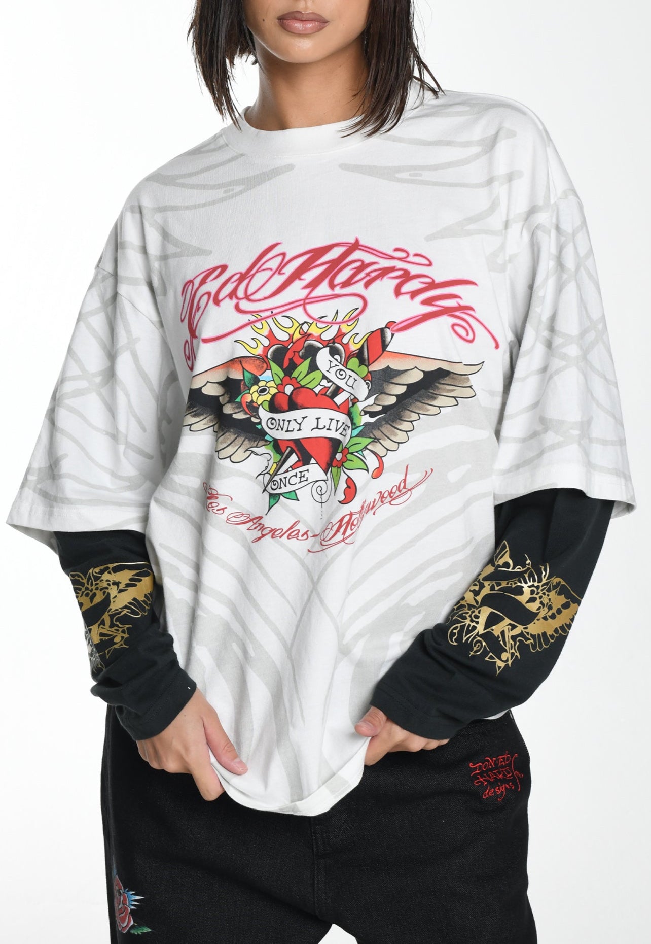 Preste homenagem à silhueta clássica de Ed Hardy com a camiseta Live Once de manga dupla. O design 'Winged Heart' no peito e o par gráfico de manga completa em contraste com a camisa de algodão lavado preto e branco, para um visual refinado, mas desfeito, para você remodelar infinitamente.
