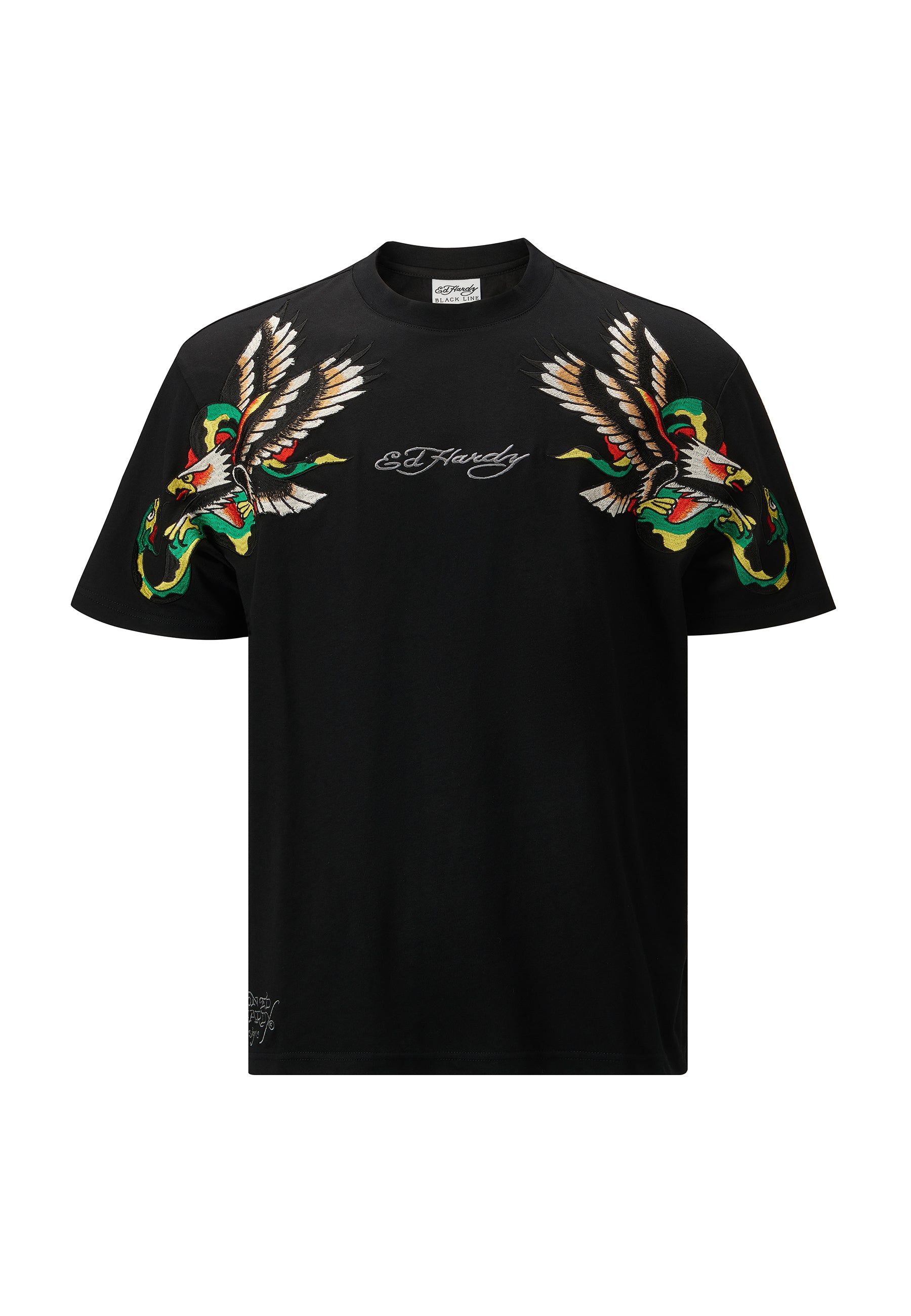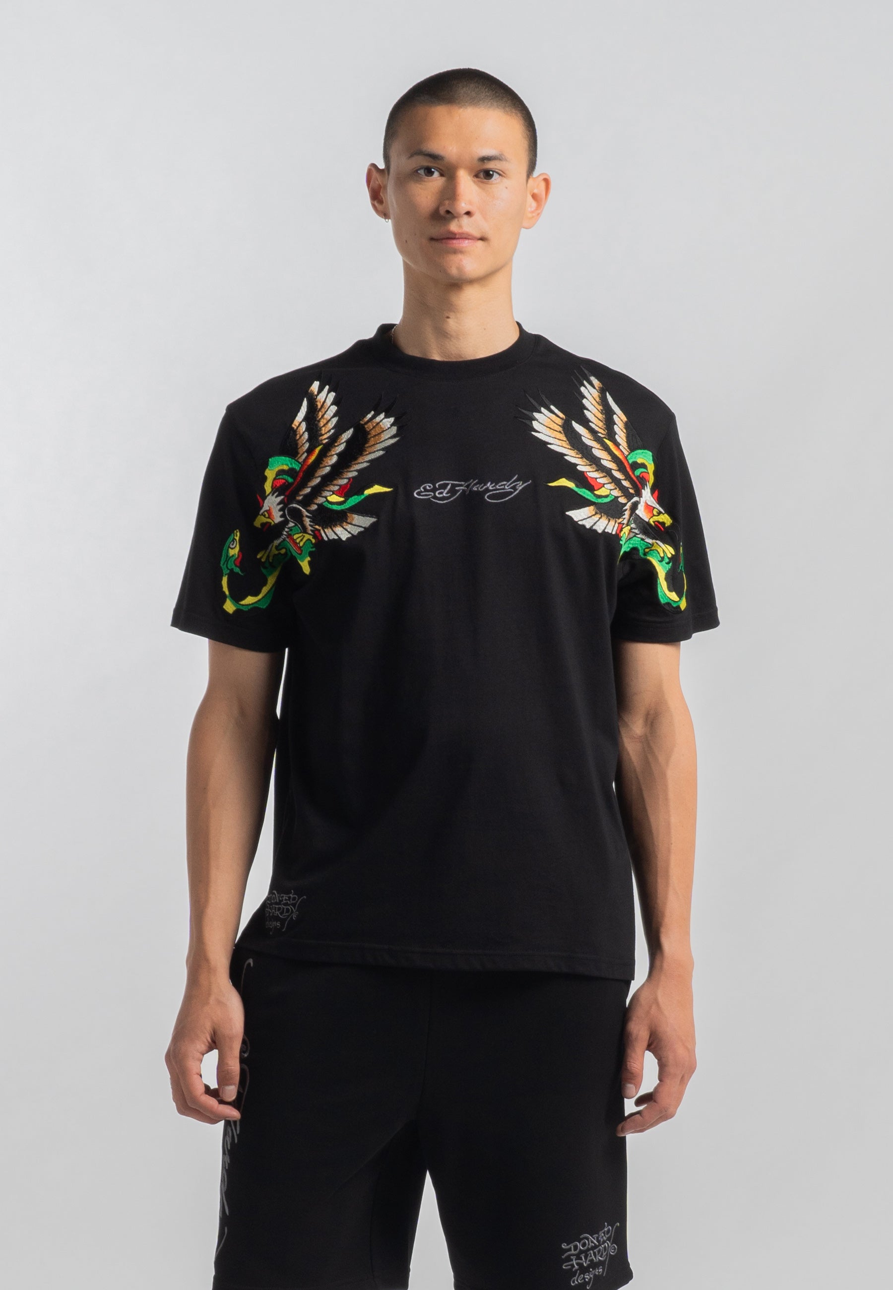 O verdadeiro estilo perdura! A camiseta Double Eagle Snake apresenta impressionantes gráficos coloridos abrangendo ambos os ombros, feita como uma peça marcante que incorpora a dedicação incomparável de Ed em transformar a moda em arte vestível.