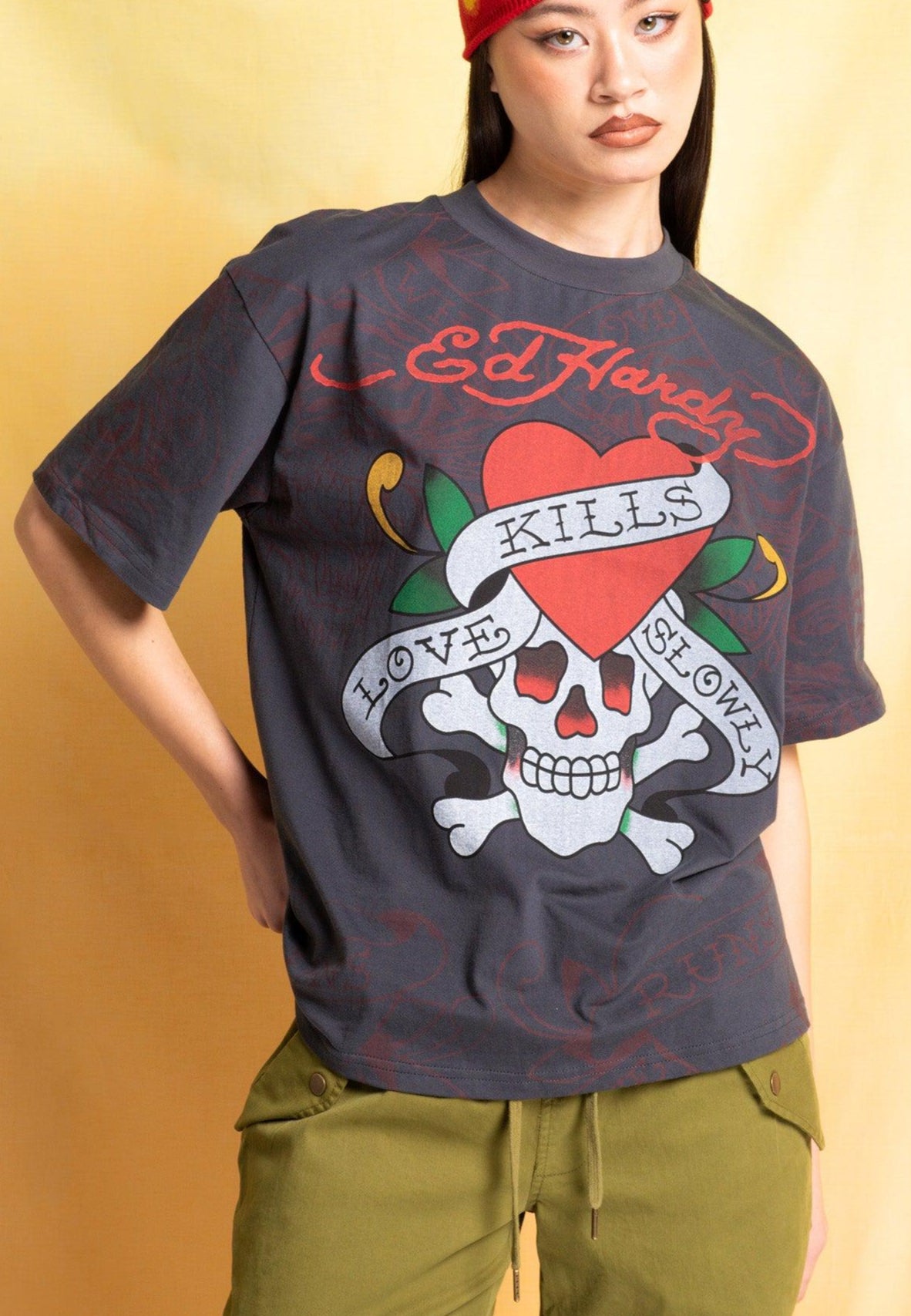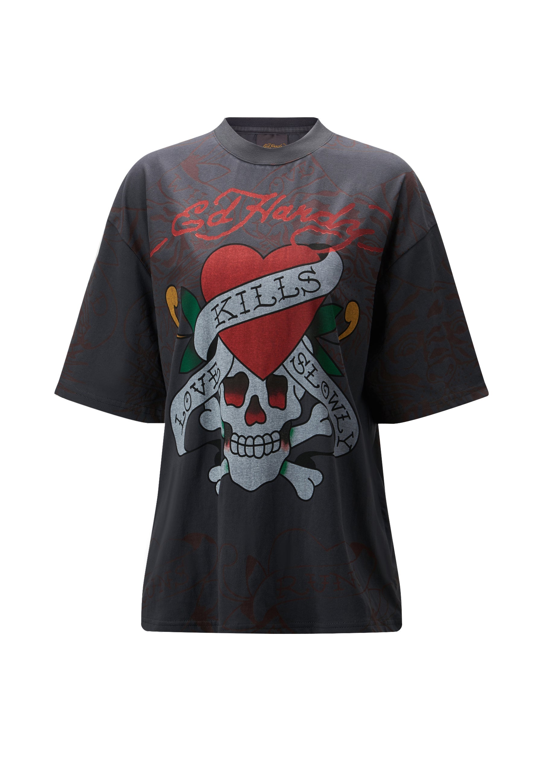 Camiseta feminina Love Kills lentamente relaxada - preta