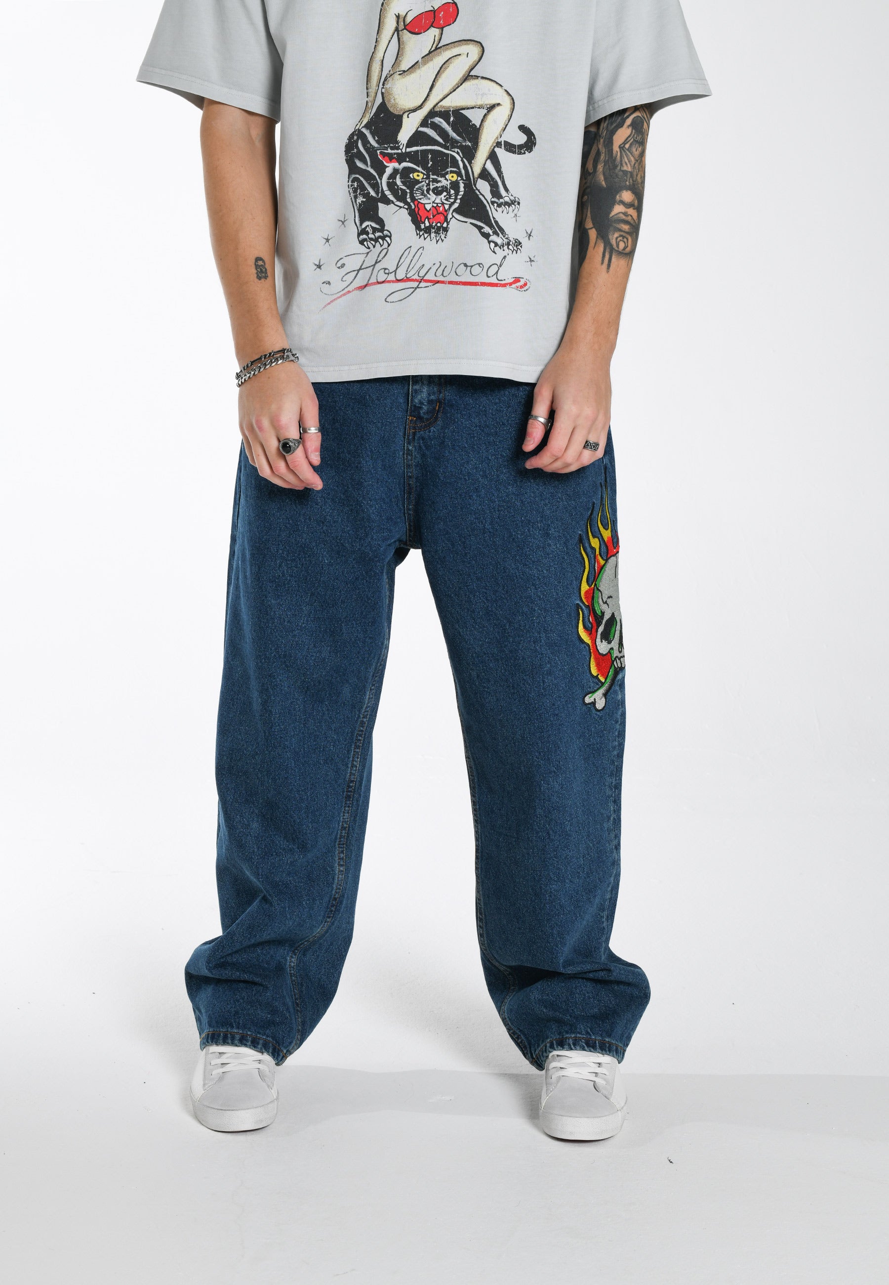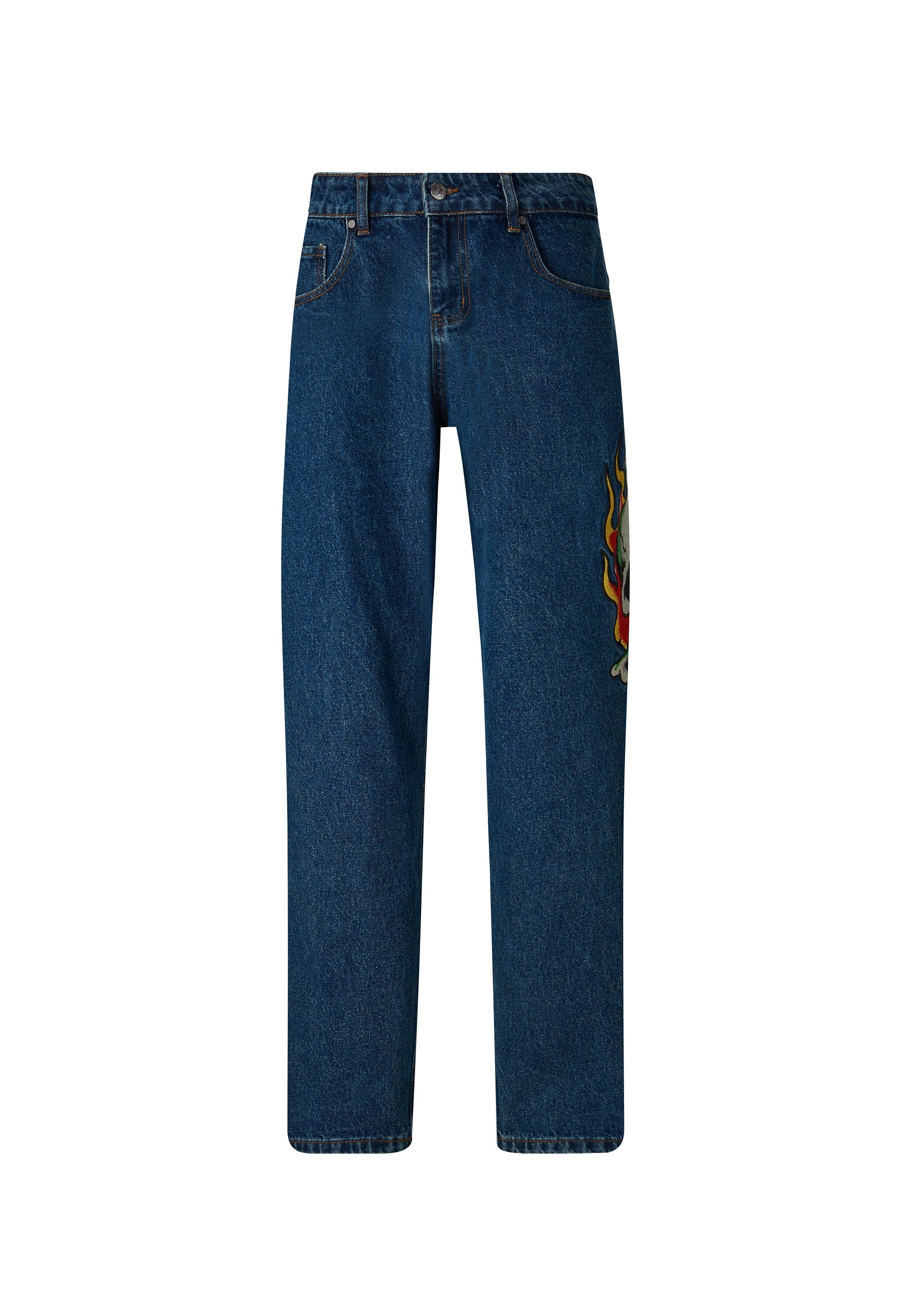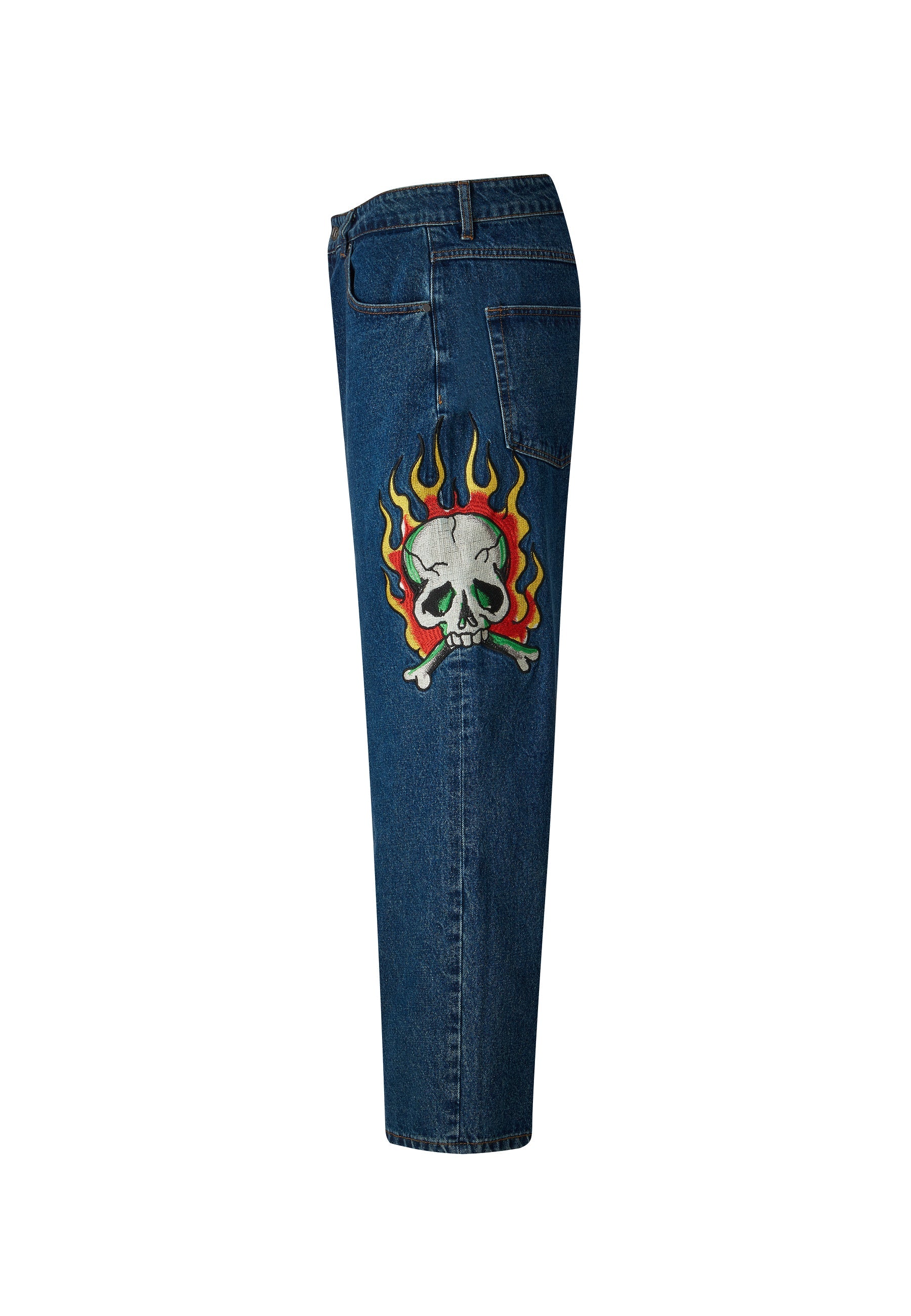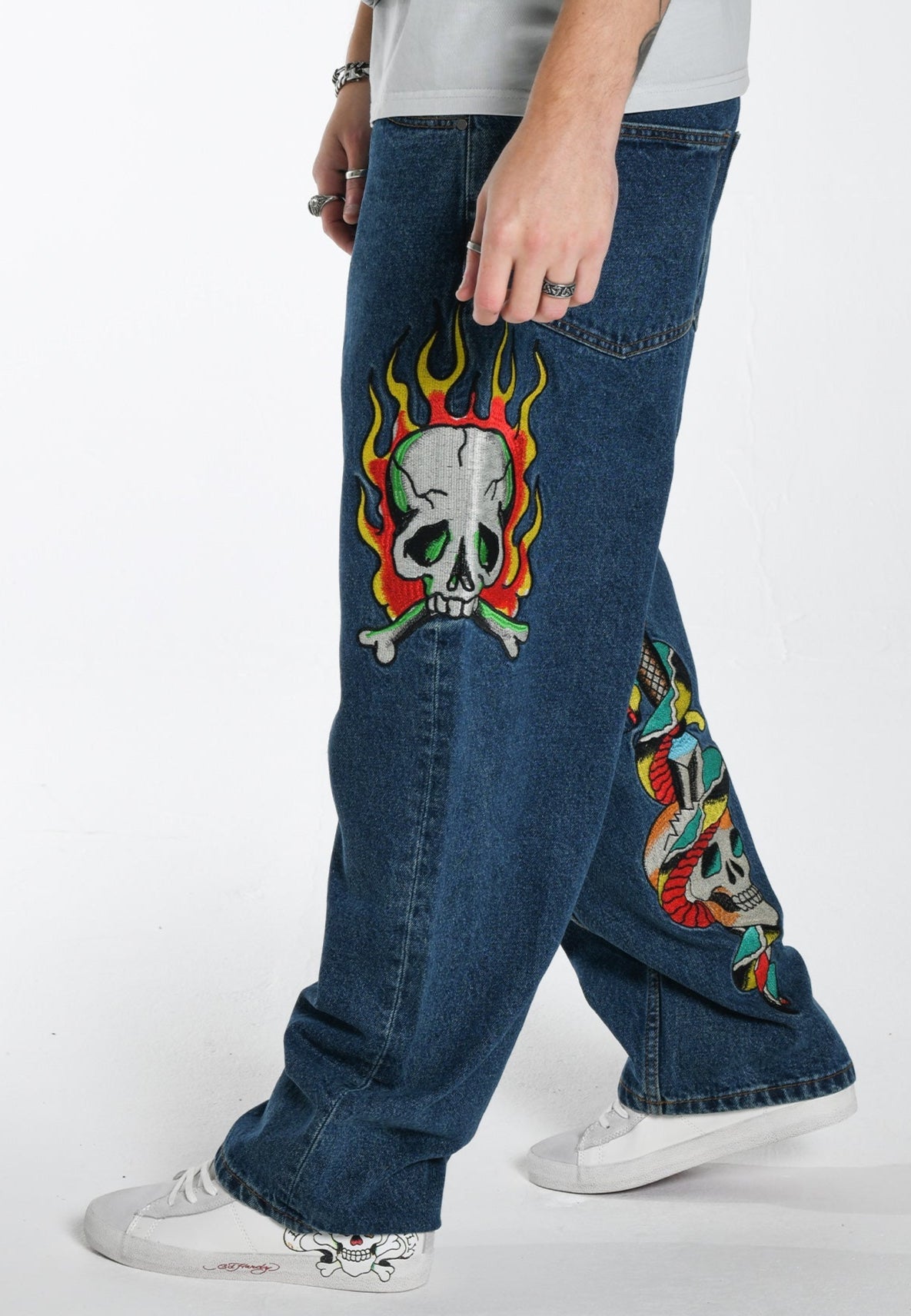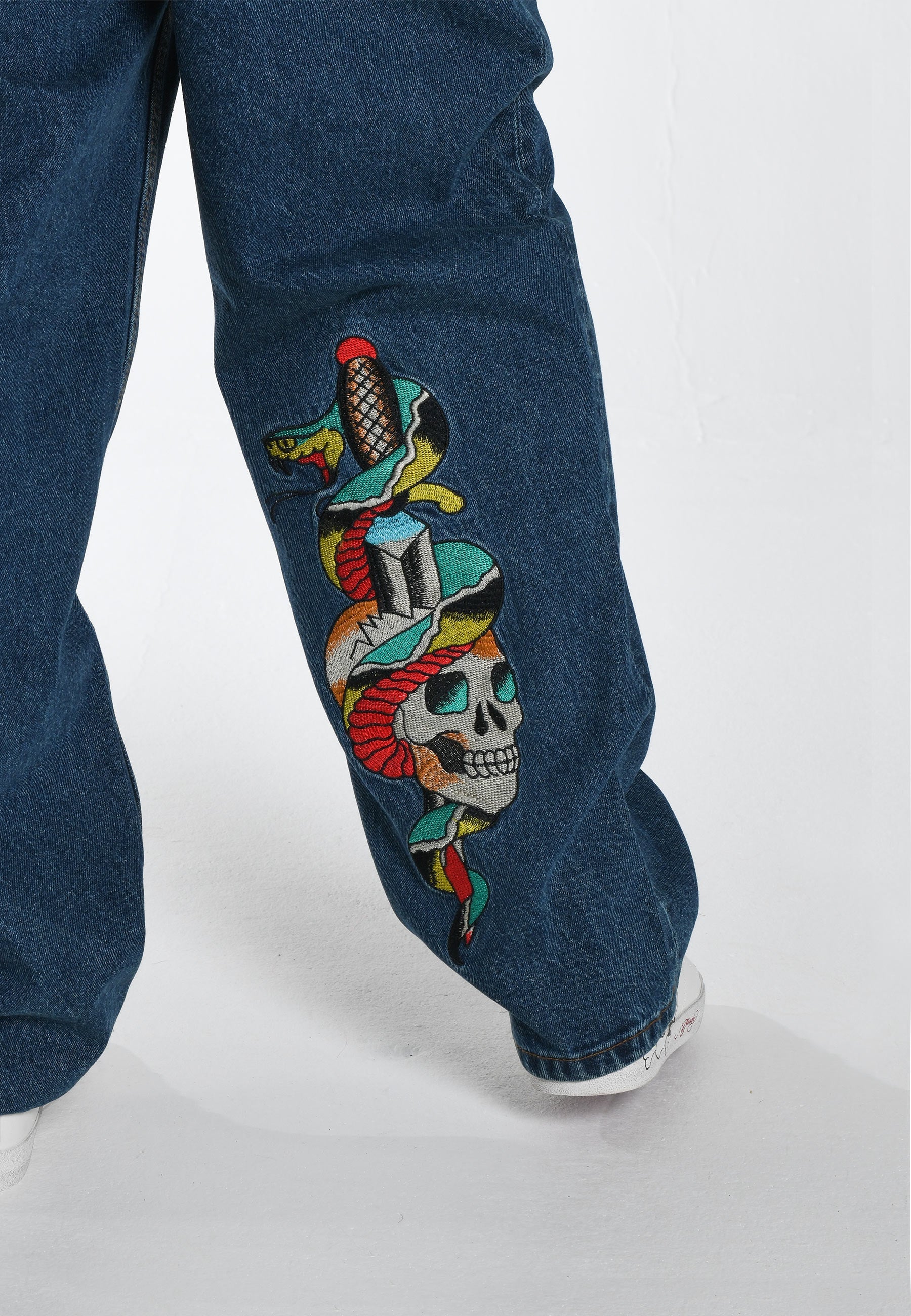 Calça jeans masculina com estampa de tatuagem Skull-Snake-Dagger - Indigo