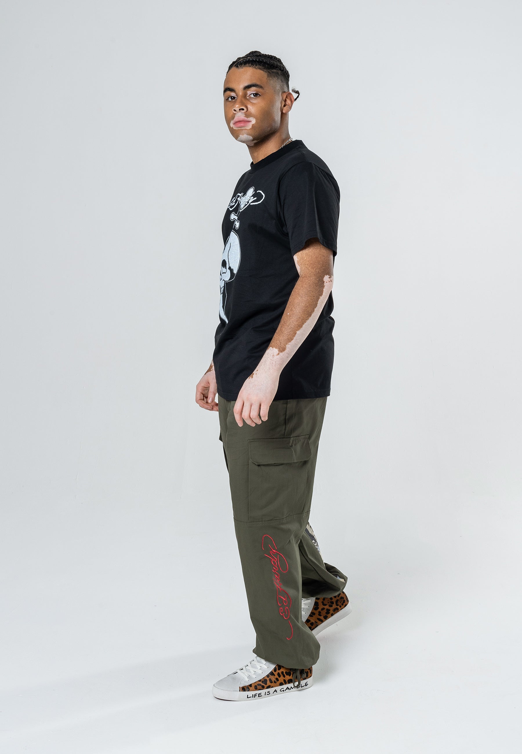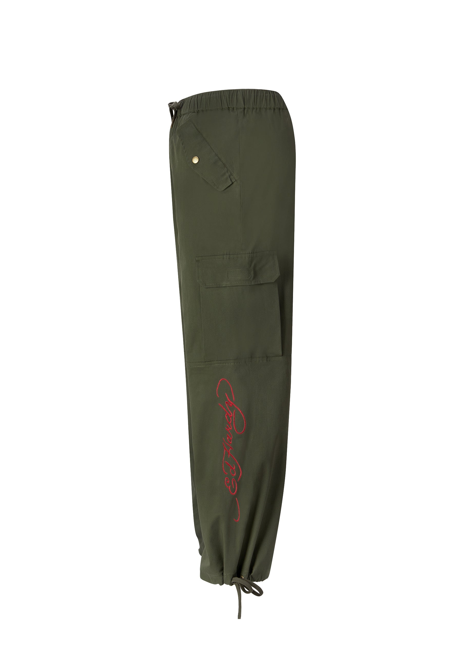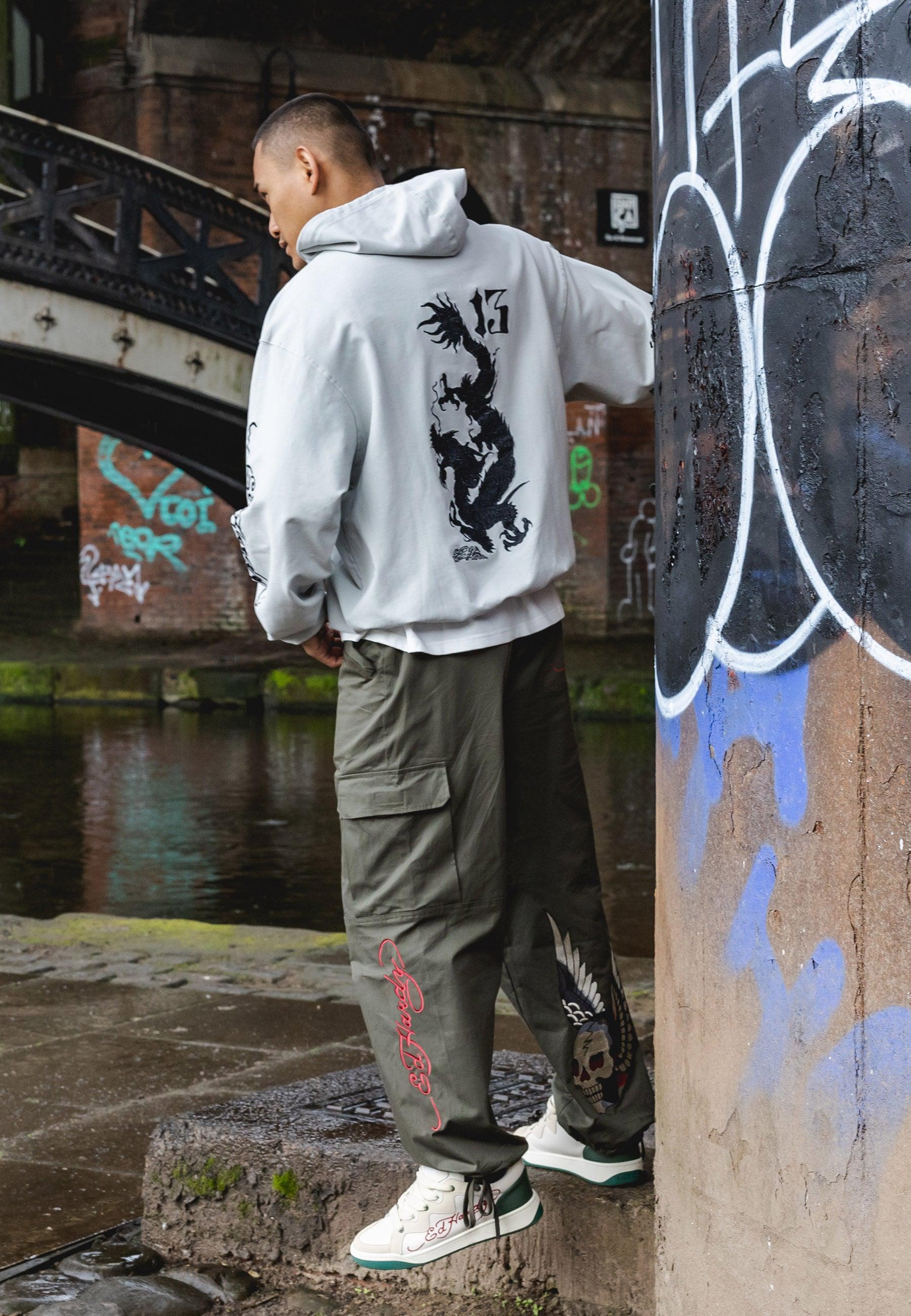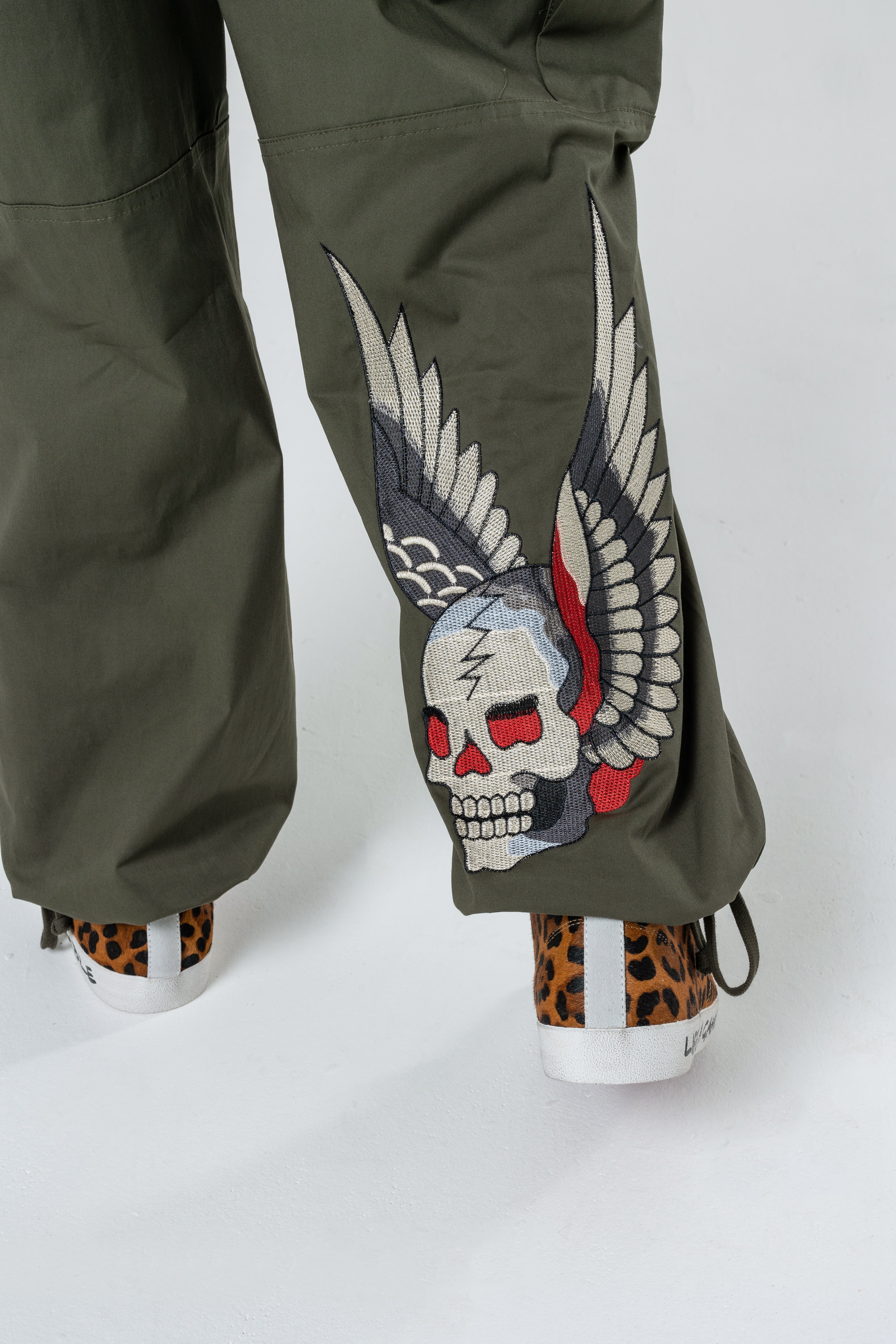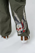 Estas calças cargo Destiny Skull Wings - Dusty Olive apresentam o infame arquivo Eds de Skull & Asas no canto inferior direito, perna traseira e logotipo Ed Hardy bordado no bolso traseiro com zíper. Essas confortáveis calças de popeline são perfeitas para climas frios, diurnos e noturnos.
