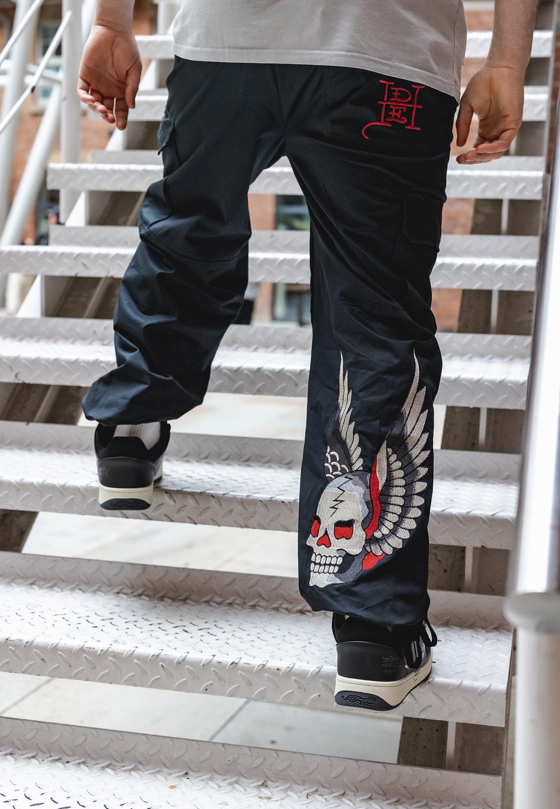Estas calças cargo Destiny Skull Wings - Washed Black apresentam o infame arquivo Eds de Skull & Asas no canto inferior direito, perna traseira e logotipo Ed Hardy bordado no bolso traseiro com zíper. Essas confortáveis calças de popeline são perfeitas para climas frios, diurnos e noturnos.