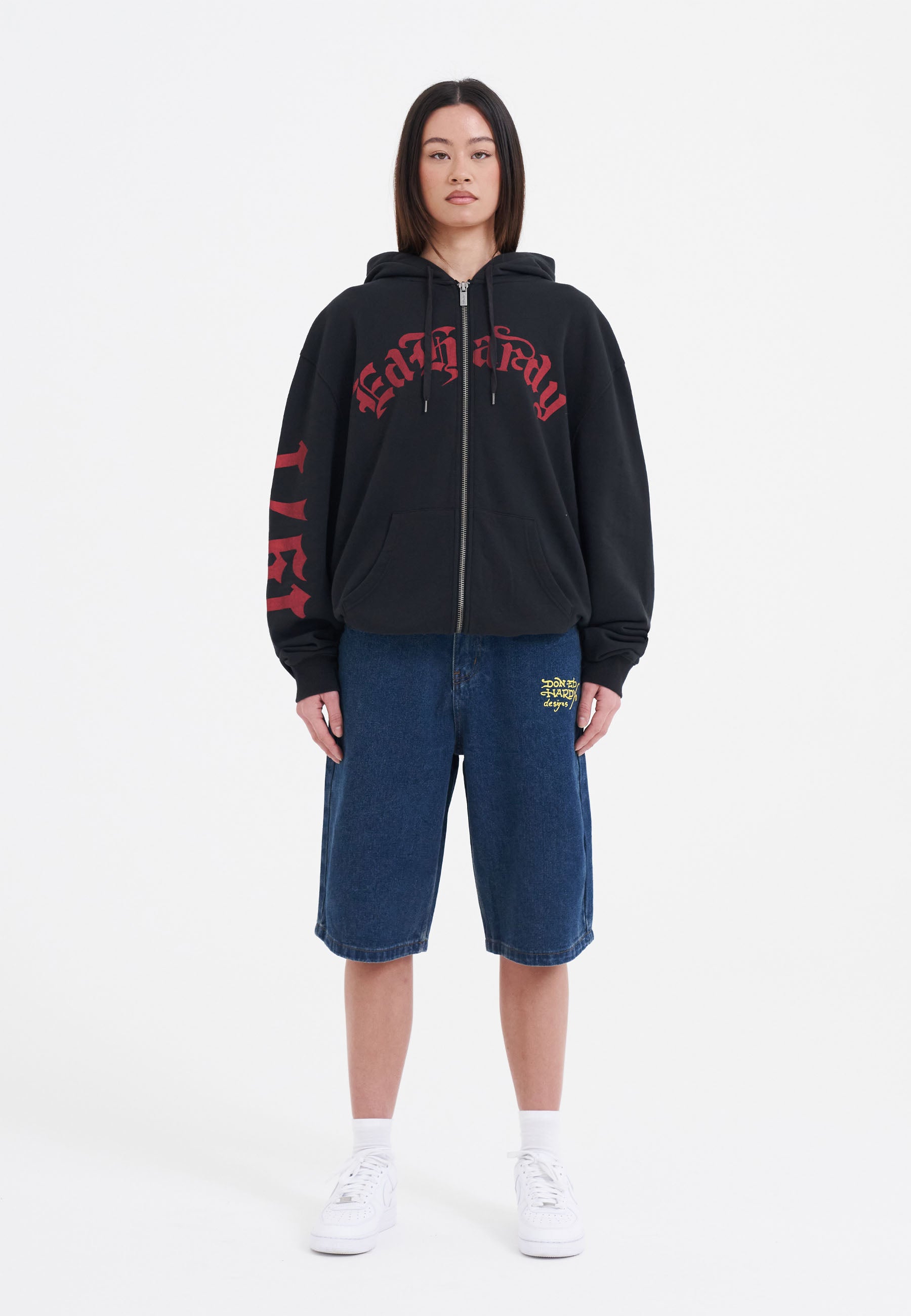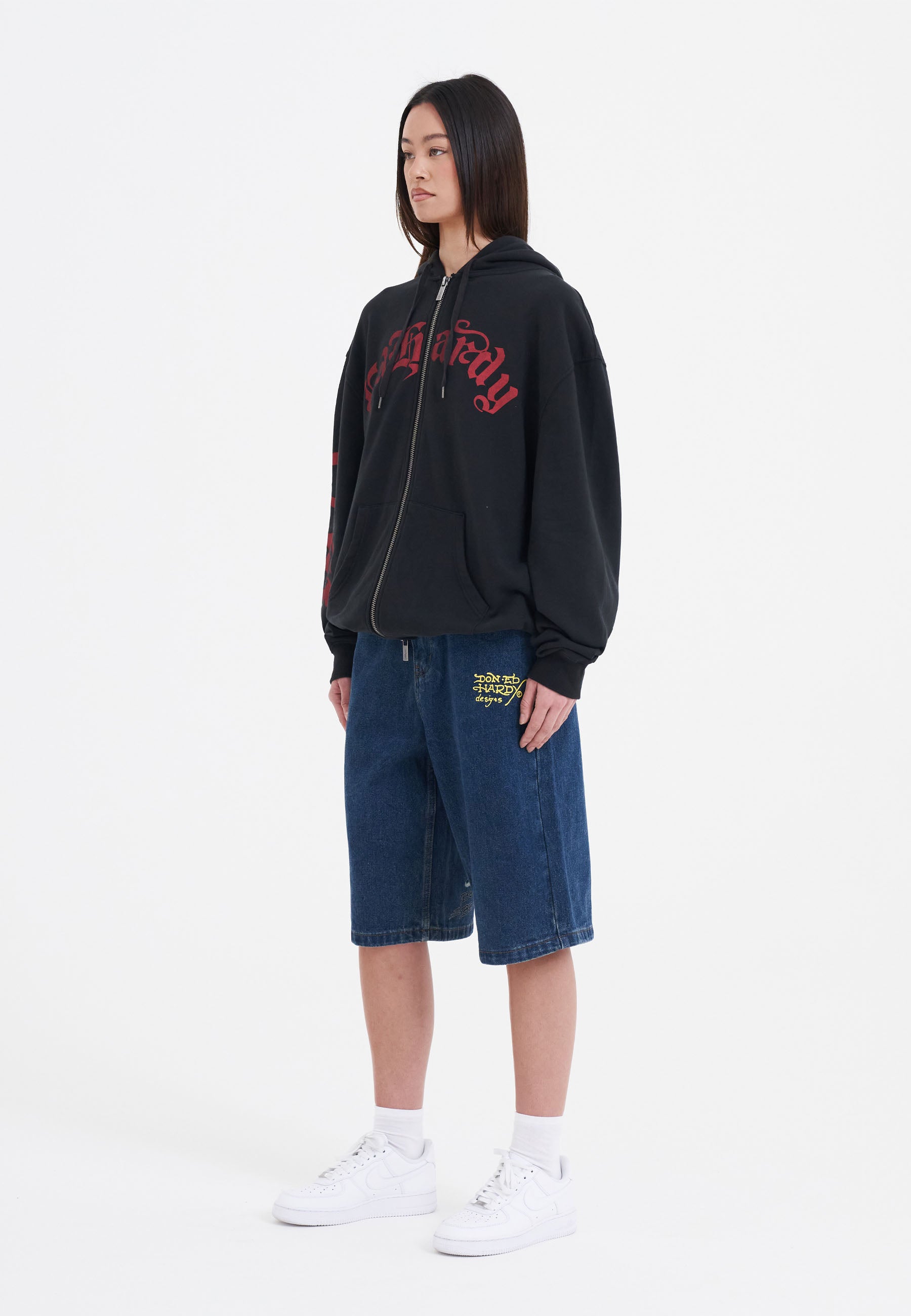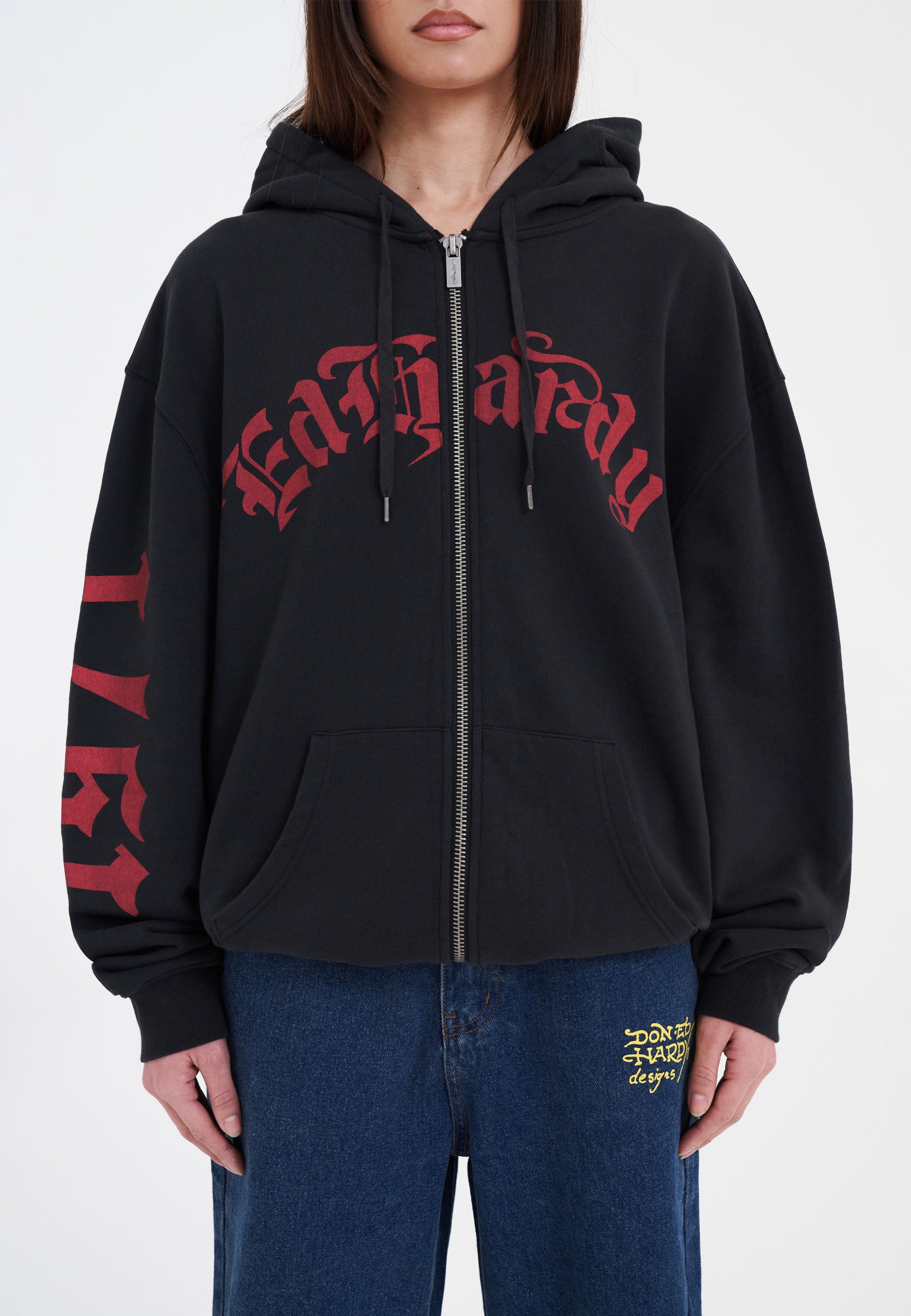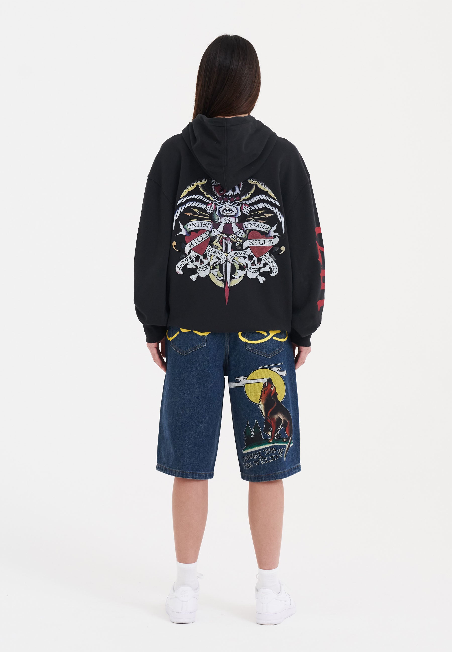 Esta peça premium resume o talento de Ed Hardy em reinventar estilos icônicos, combinando bordados em tons complexos e artesanato premium, inspirando-se nas influências punk desta temporada.