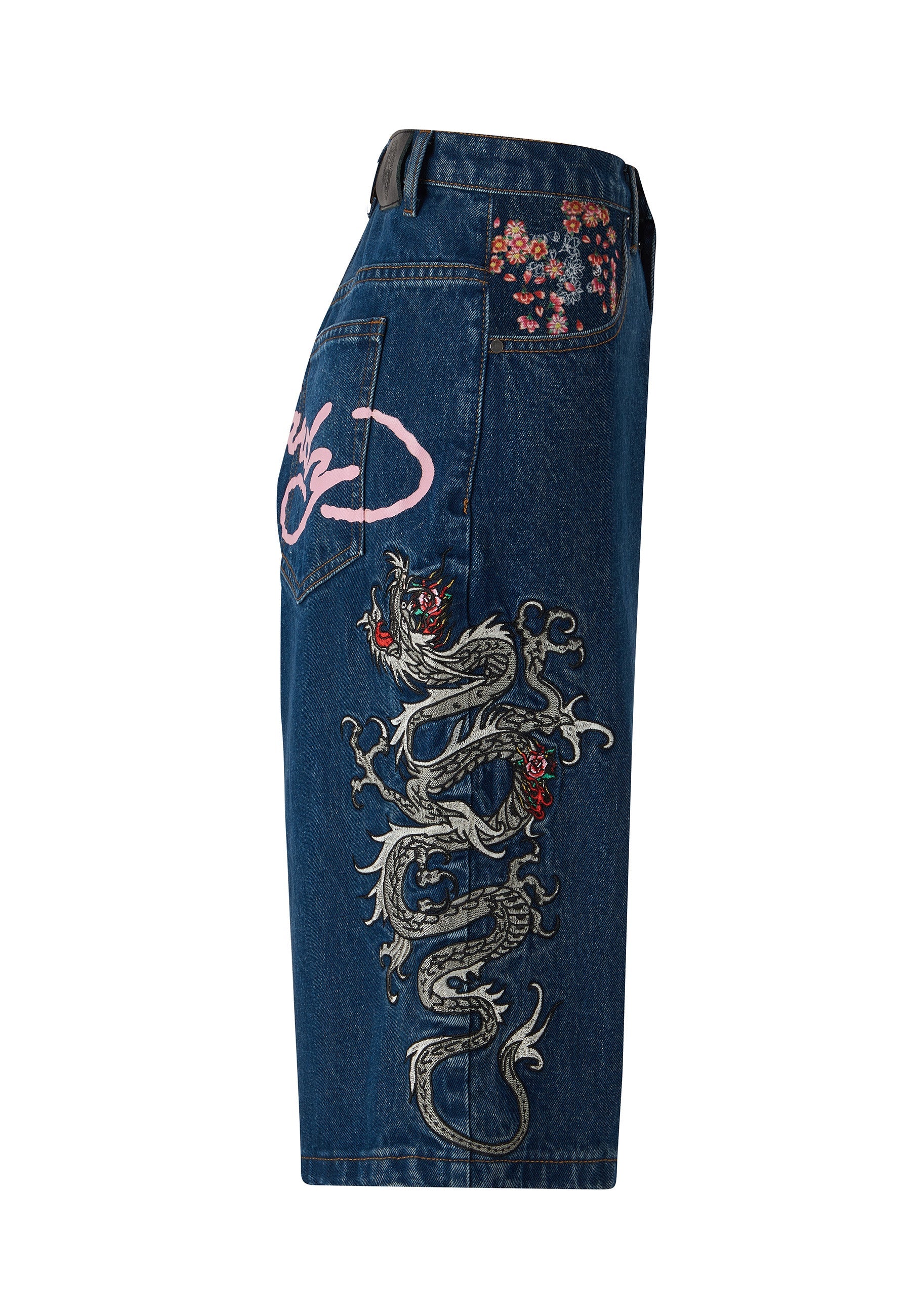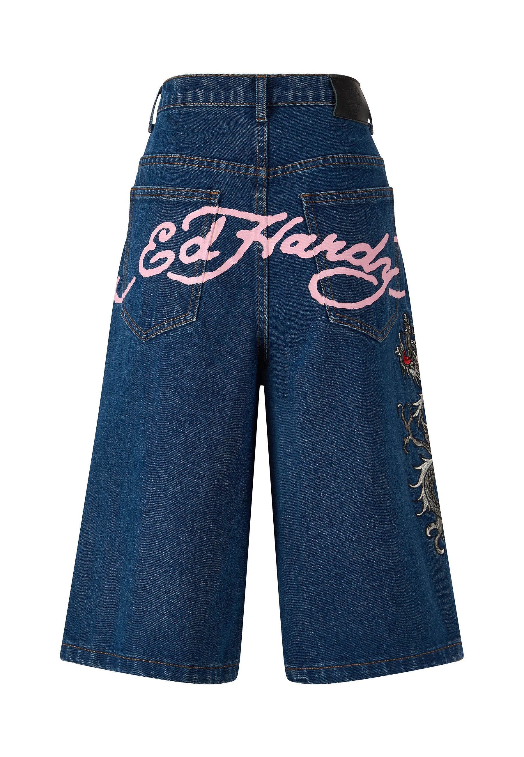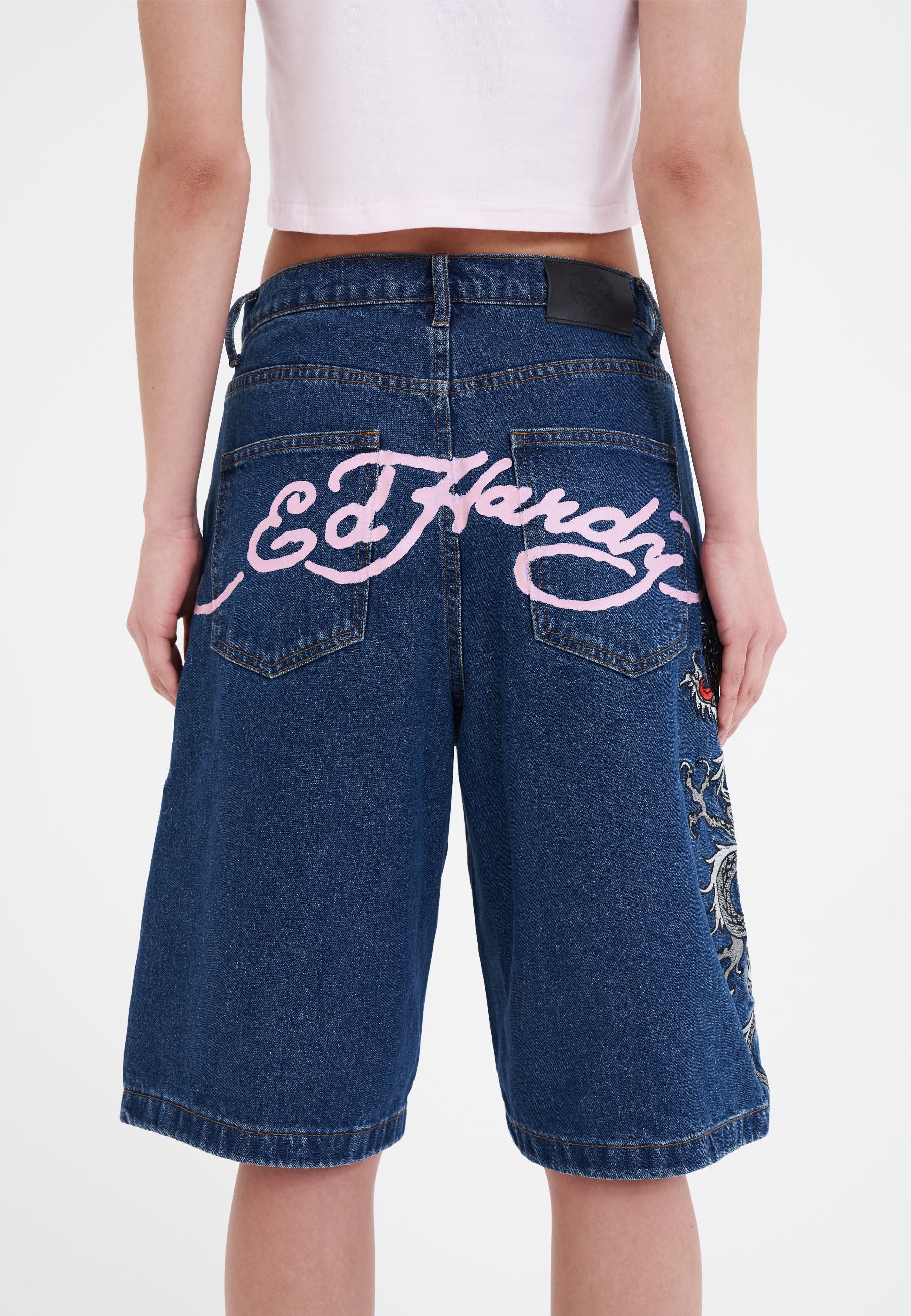 Os shorts jeans oversized para mulheres estão de volta e são um destaque graças ao dragão bordado em cores de alta definição e à icônica assinatura de Ed Hardy estampada nos bolsos traseiros.