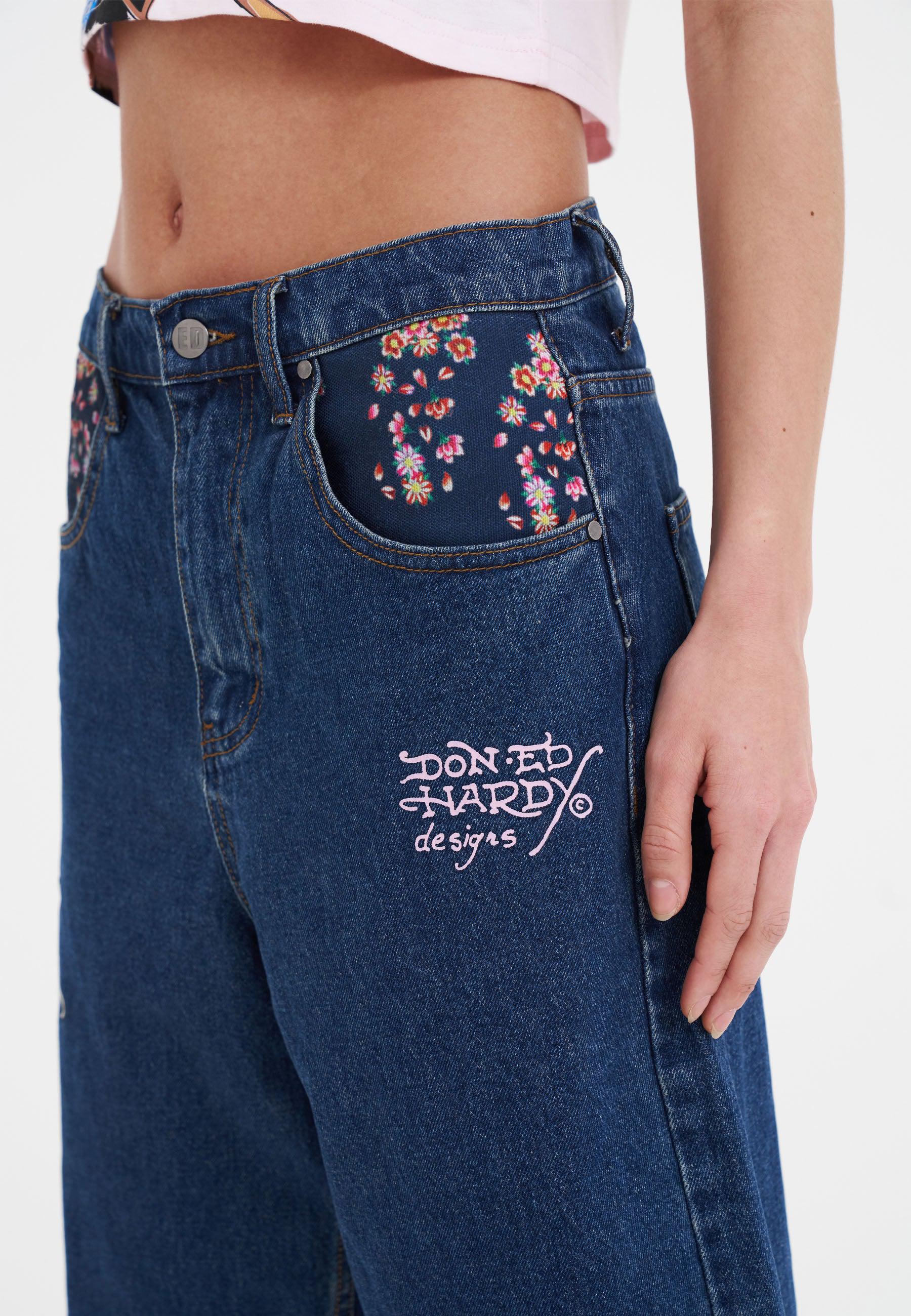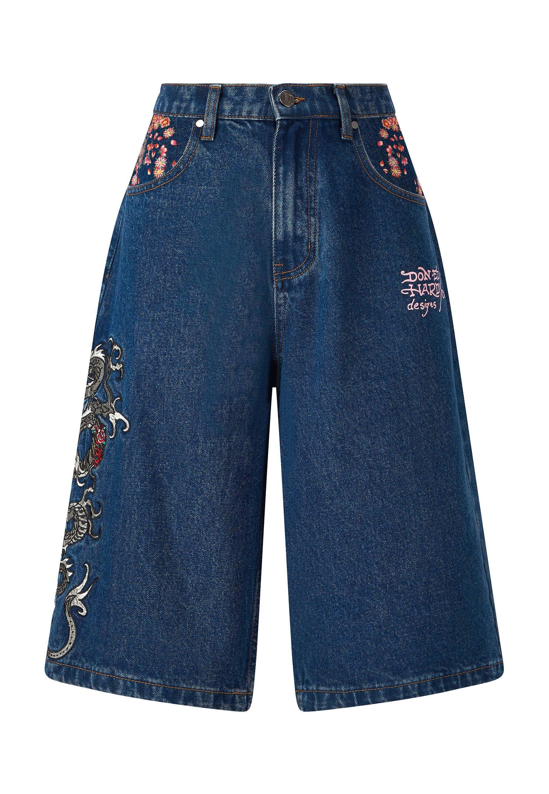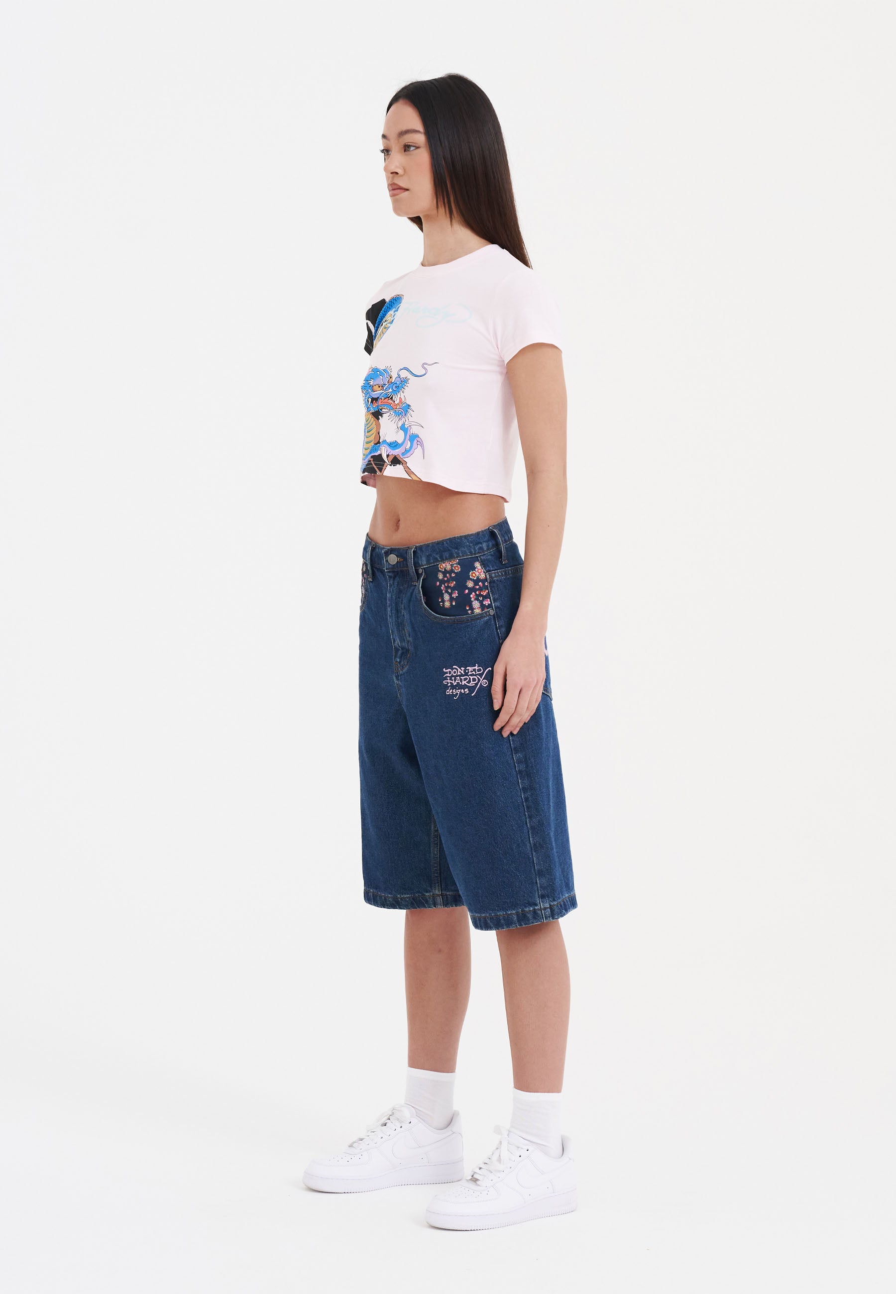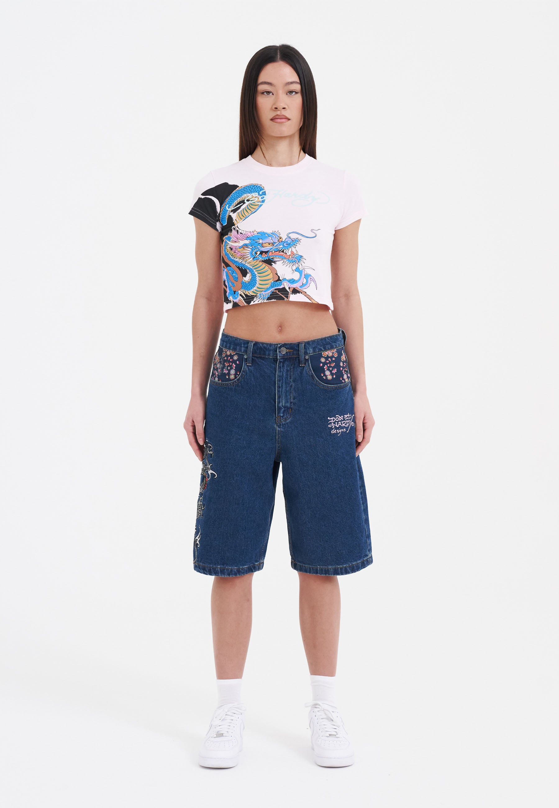 Os shorts jeans oversized para mulheres estão de volta e são um destaque graças ao dragão bordado em cores de alta definição e à icônica assinatura de Ed Hardy estampada nos bolsos traseiros.