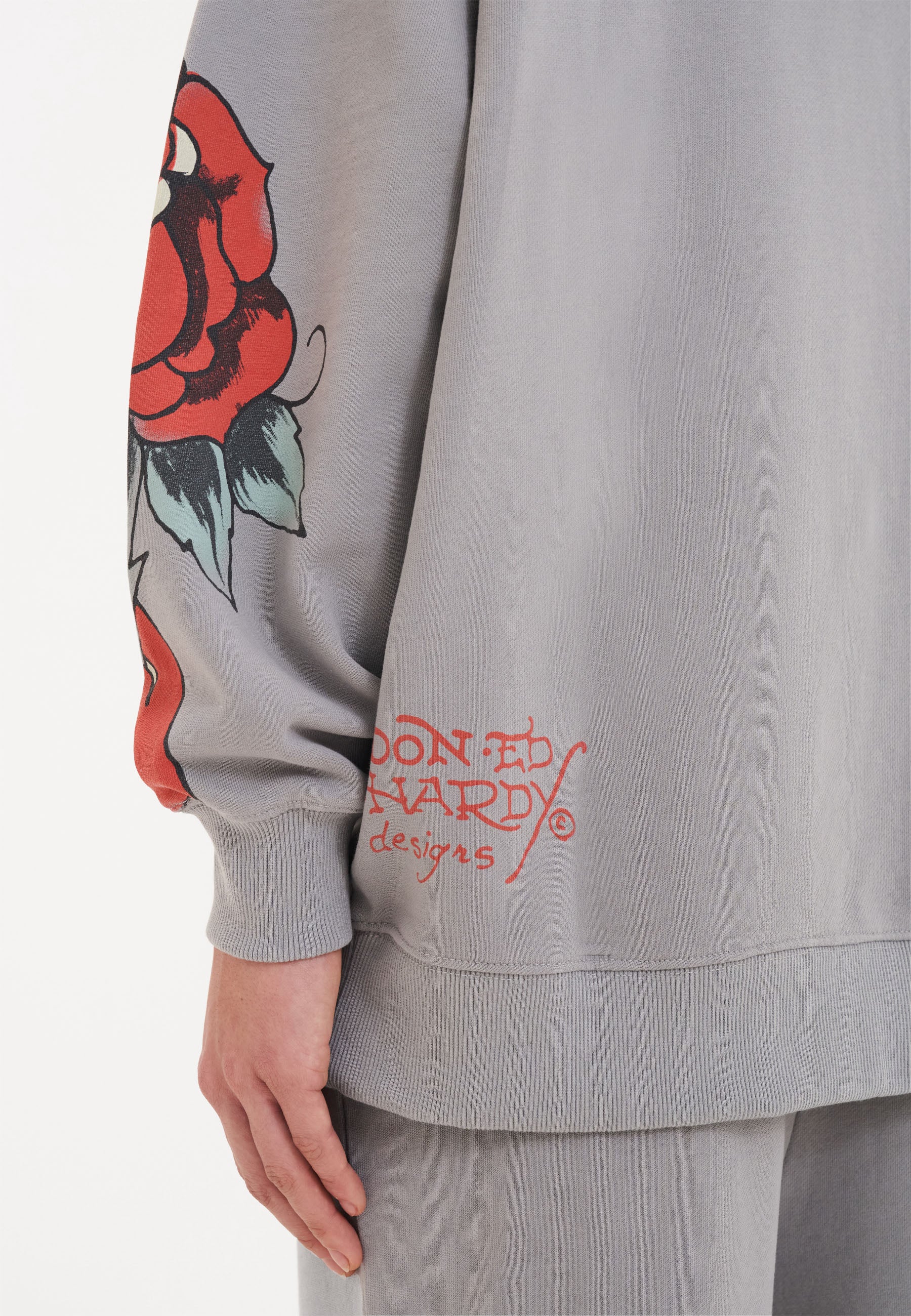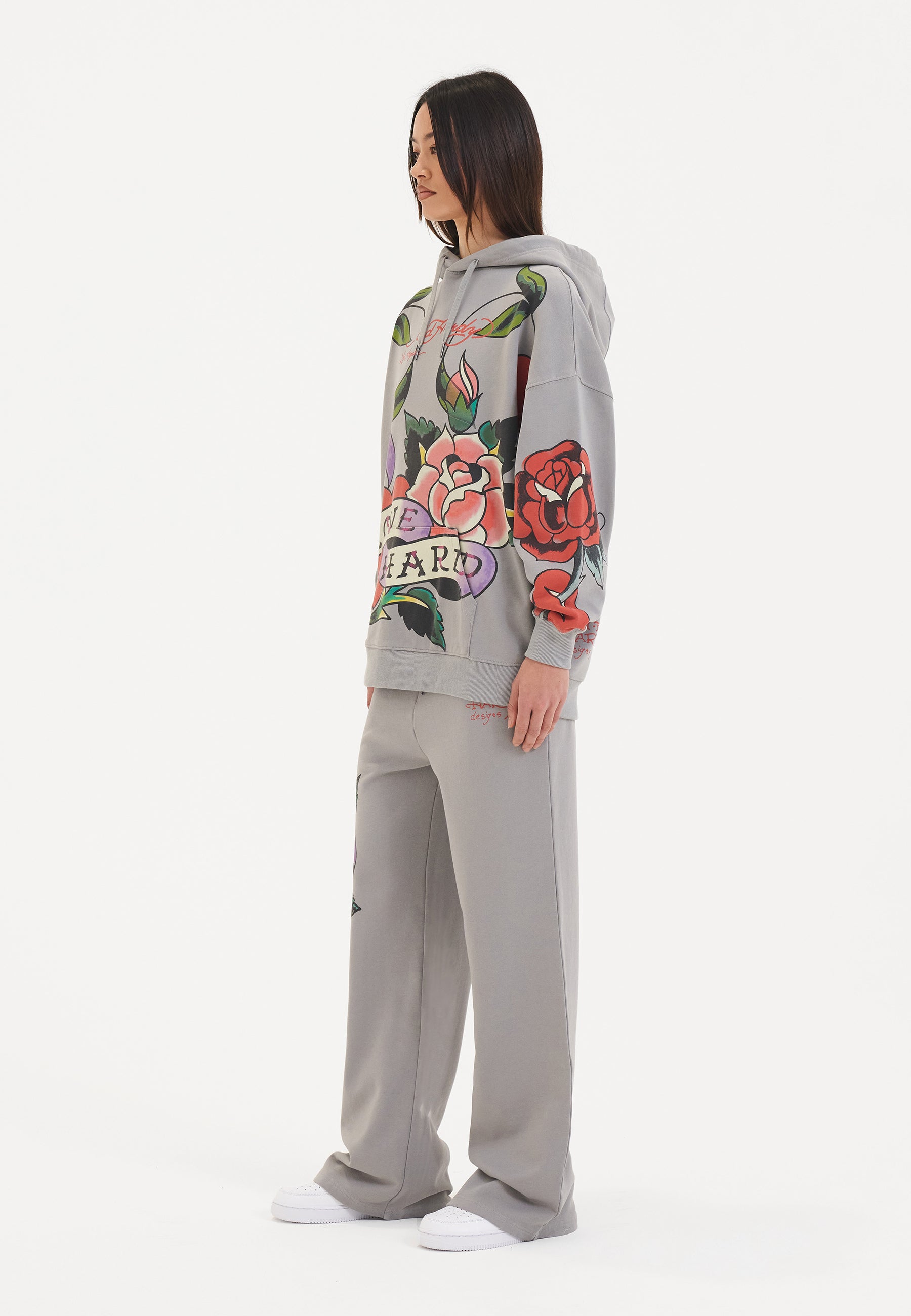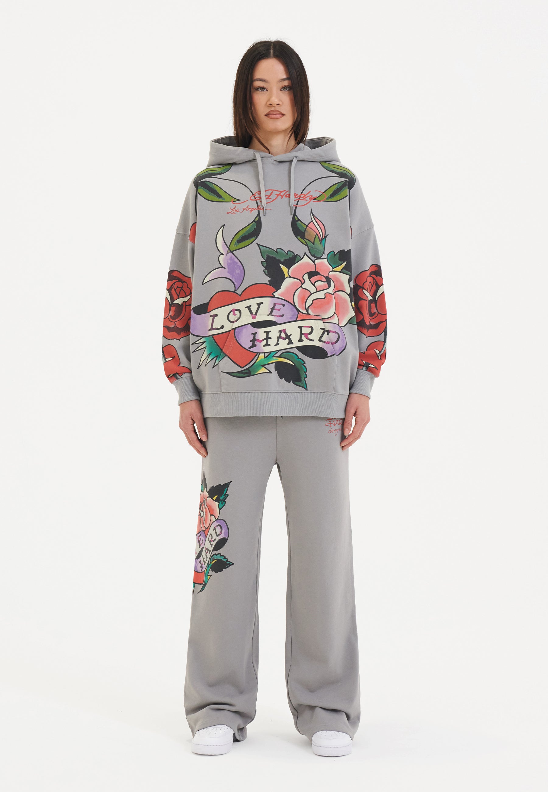 Moletom feminino Love Hard Graphic com bolsa relaxada - cinza