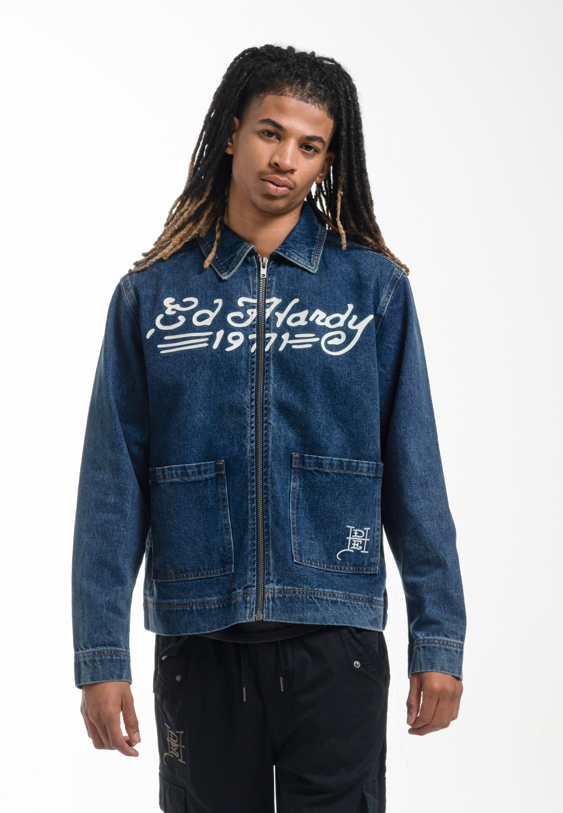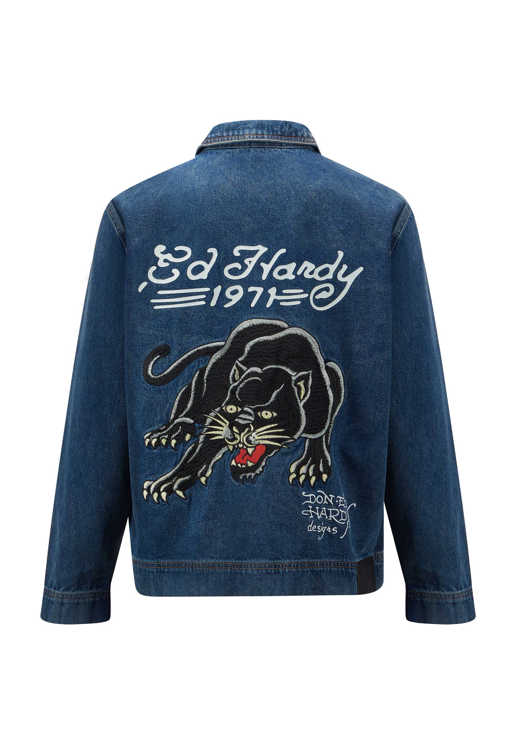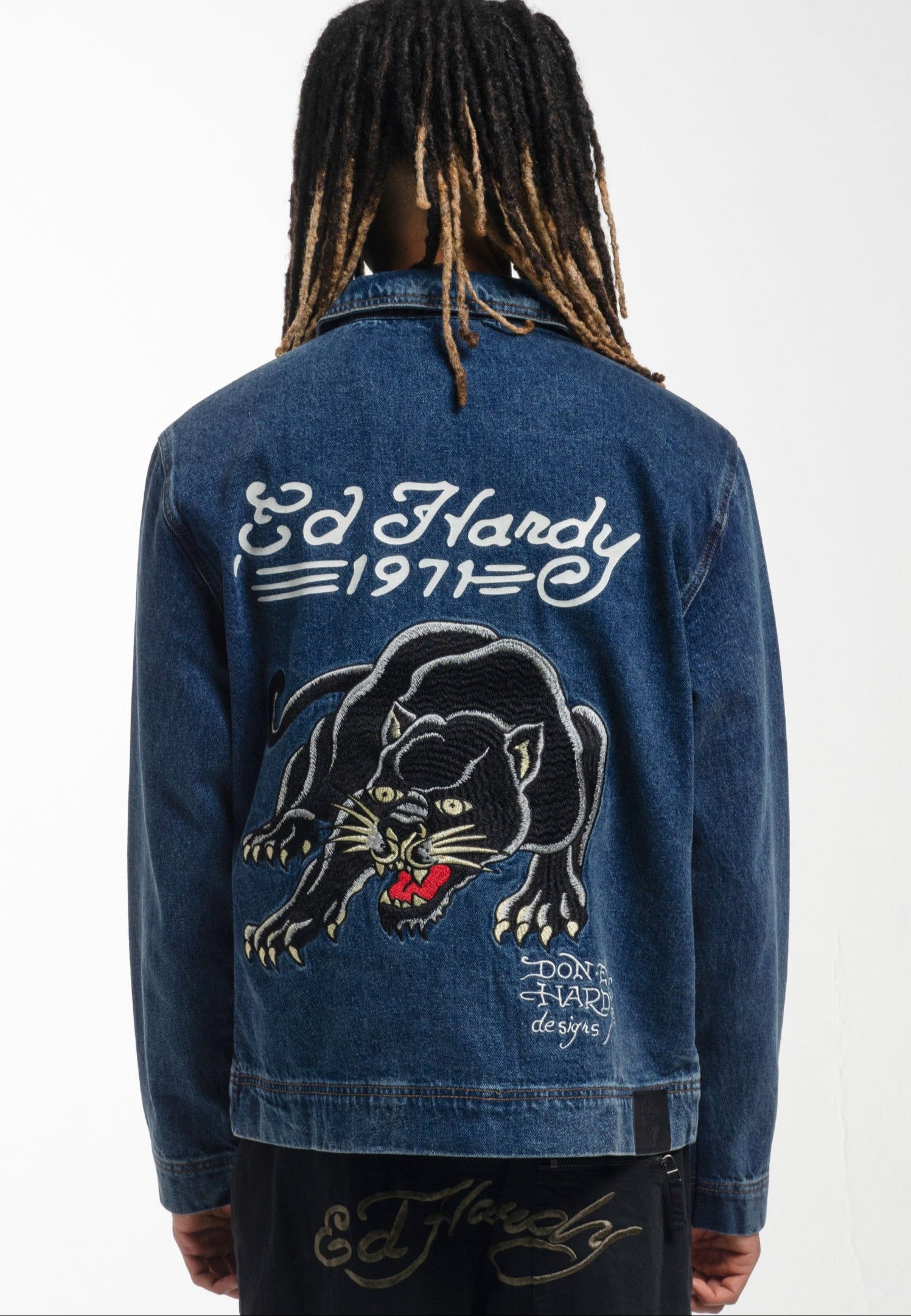 Confeccionada em jeans índigo premium de corte regular, esta jaqueta apresenta um gráfico de pantera bordado em cores, logotipos inconfundíveis de Ed Hardy de 1971 na frente e nas costas e um logotipo de monograma no bolso frontal.