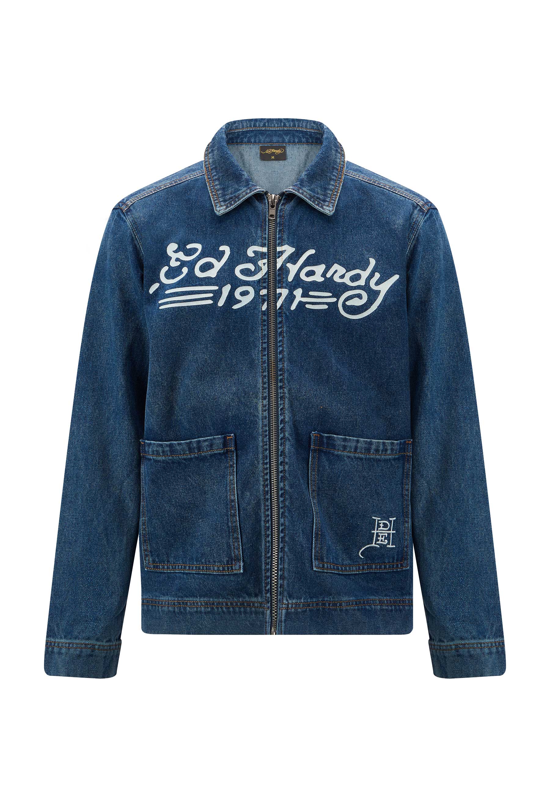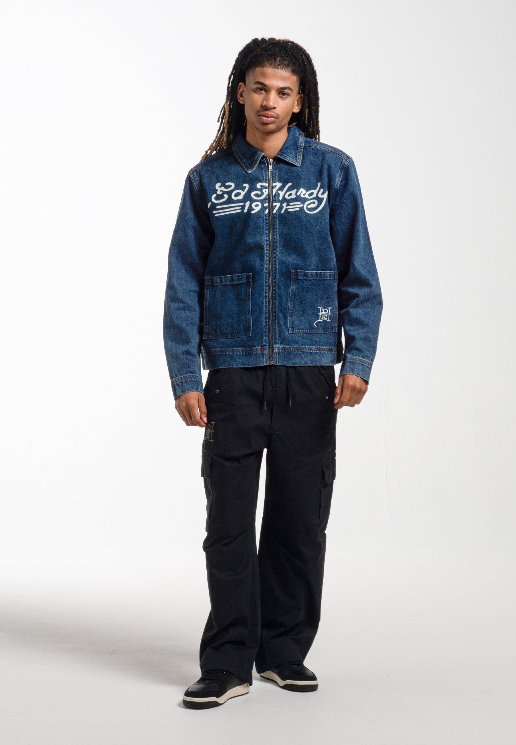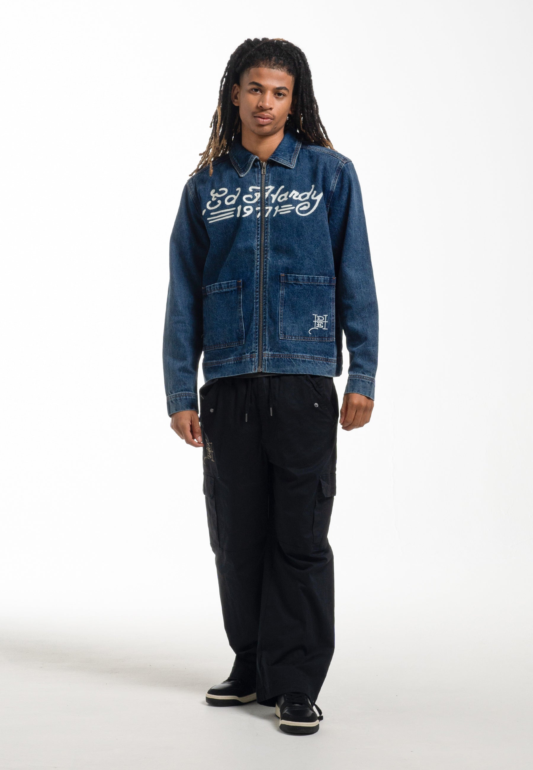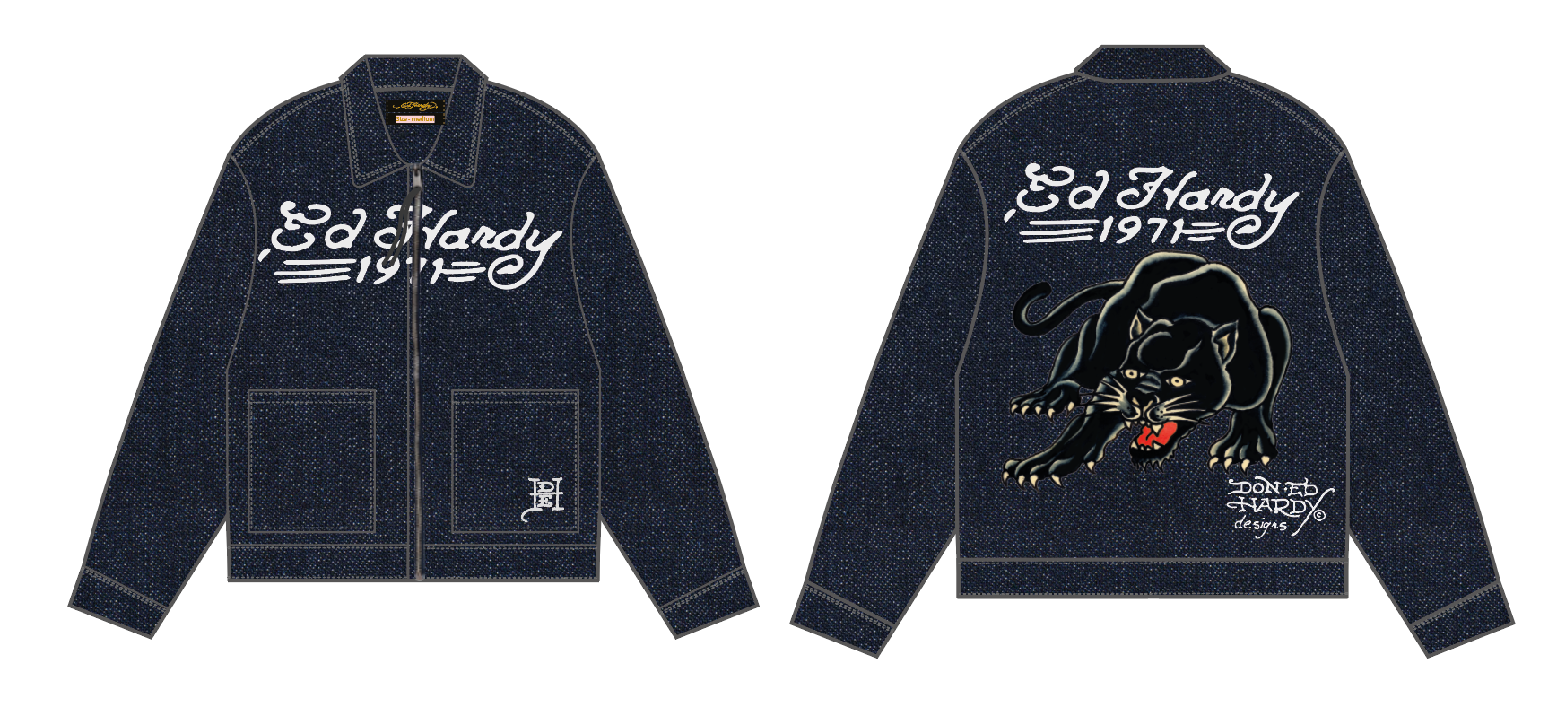 Confeccionada em jeans índigo premium de corte regular, esta jaqueta apresenta um gráfico de pantera bordado em cores, logotipos inconfundíveis de Ed Hardy de 1971 na frente e nas costas e um logotipo de monograma no bolso frontal.
