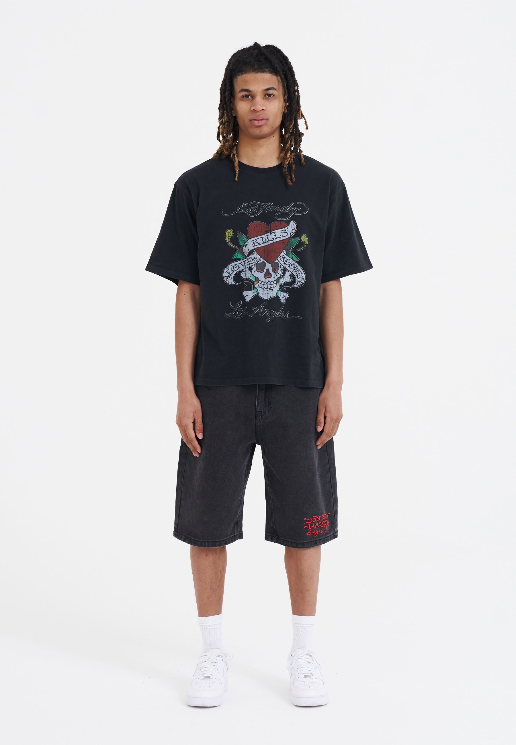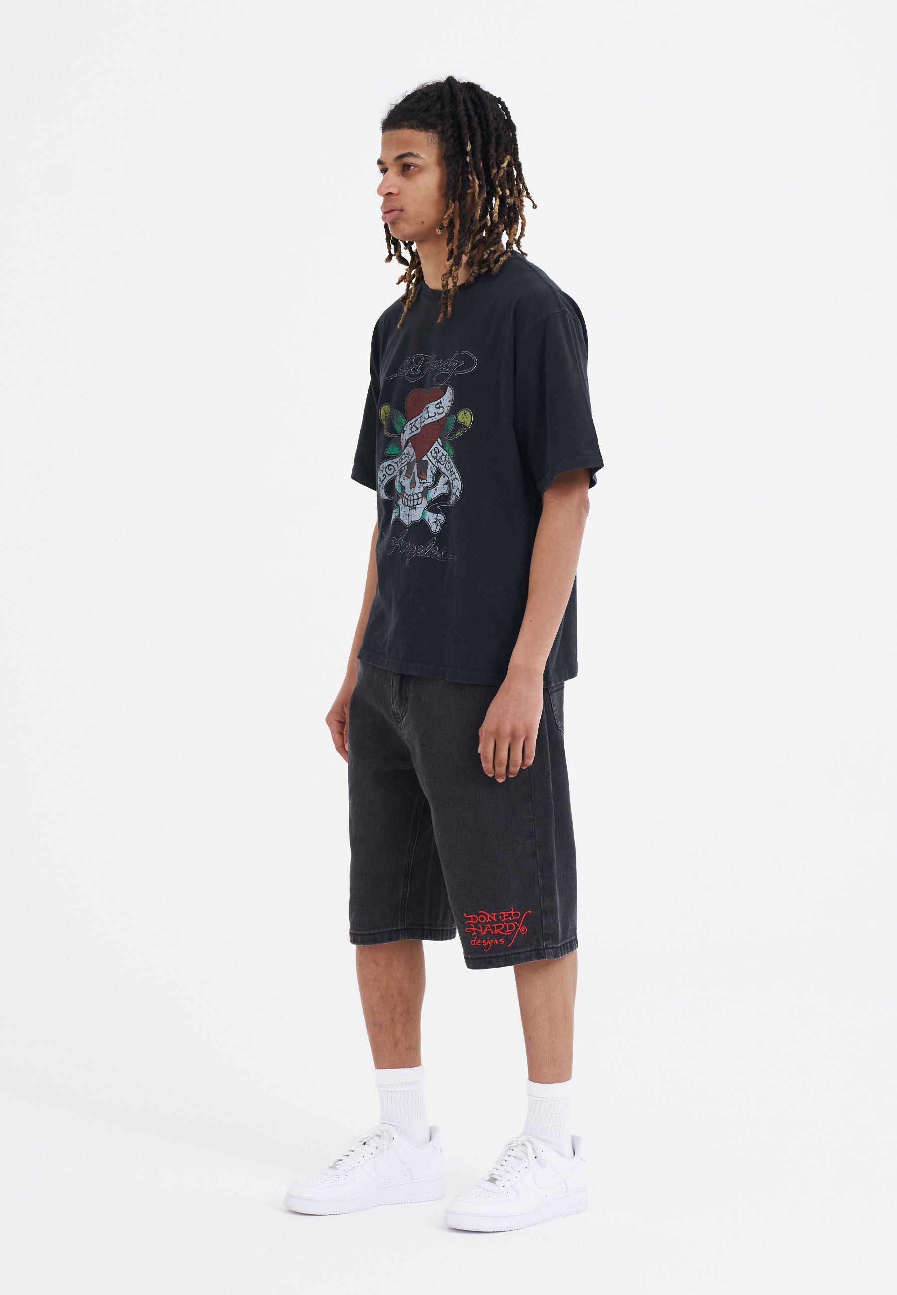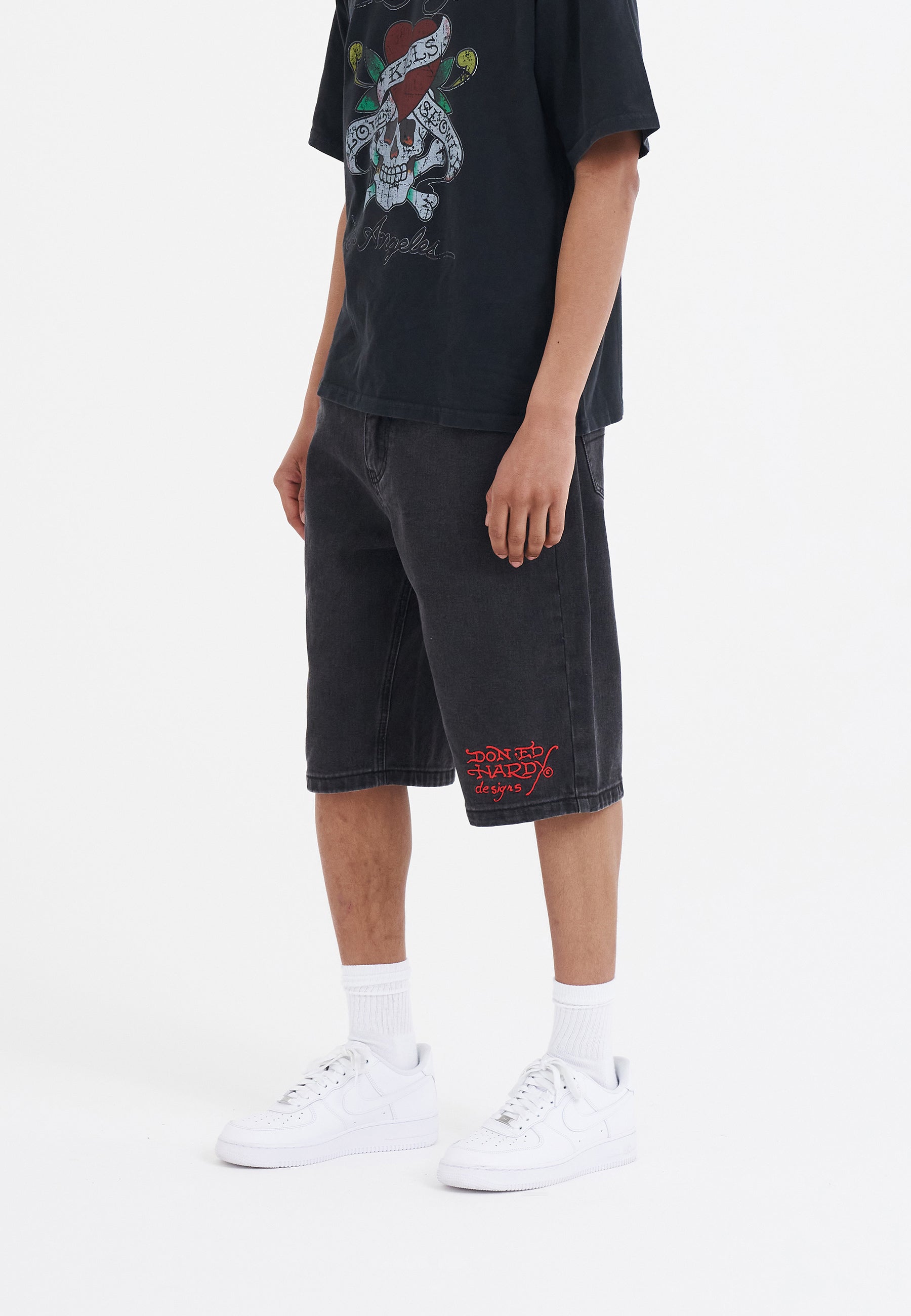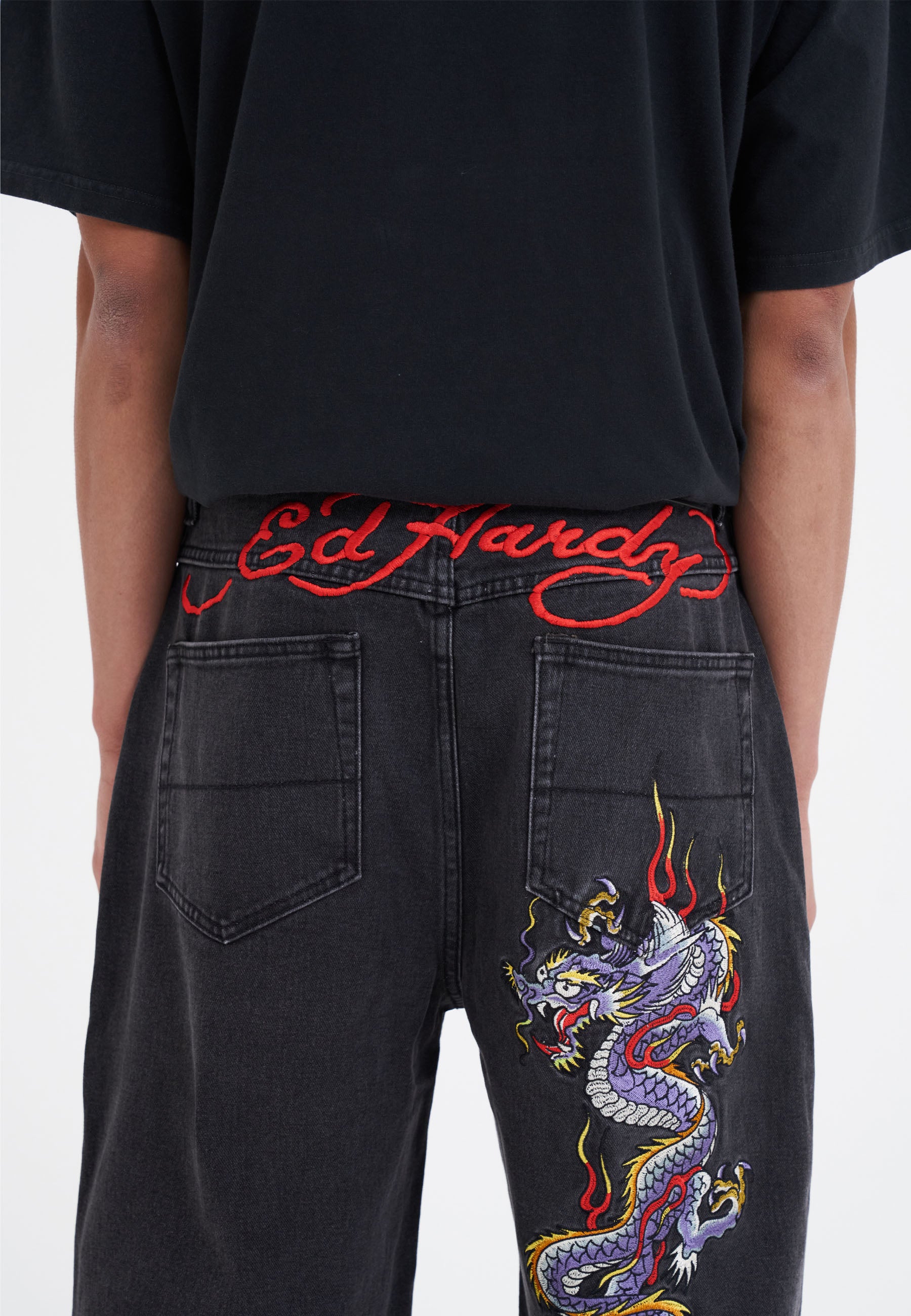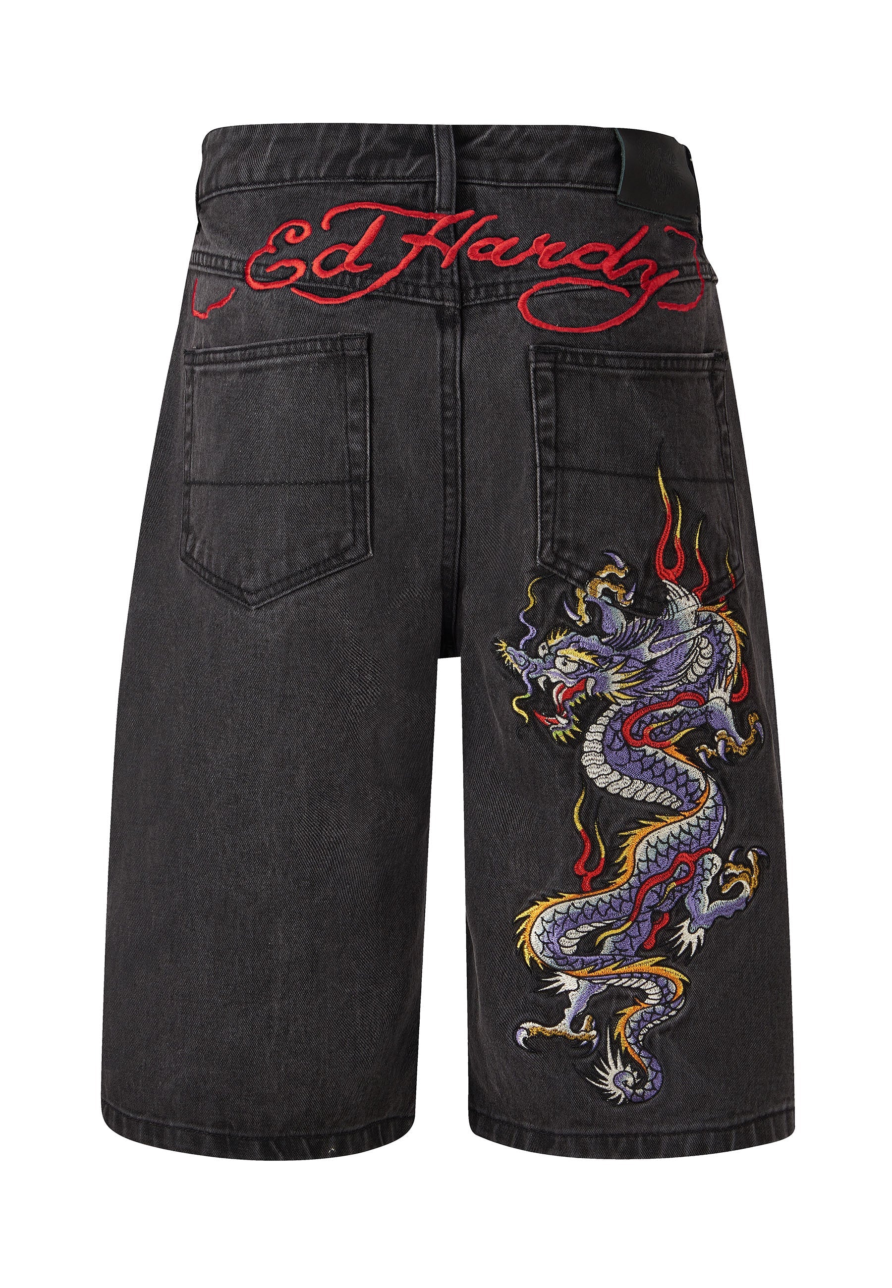 O desenho vívido e bordado da tatuagem de dragão de batalha na parte de trás da perna esquerda deste short jeans realmente se destaca em sua coloração mais escura, lavagem cinza e logotipos vermelhos de Ed Hardy na frente e na parte superior das costas. peça de verão de Ed Hardy.