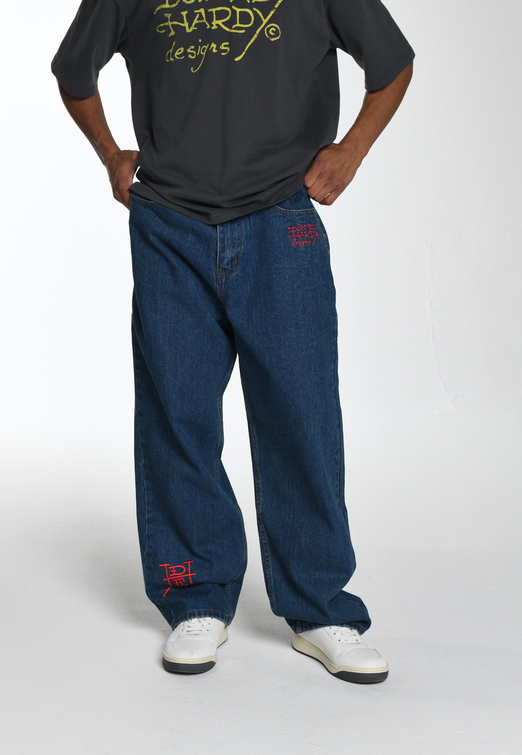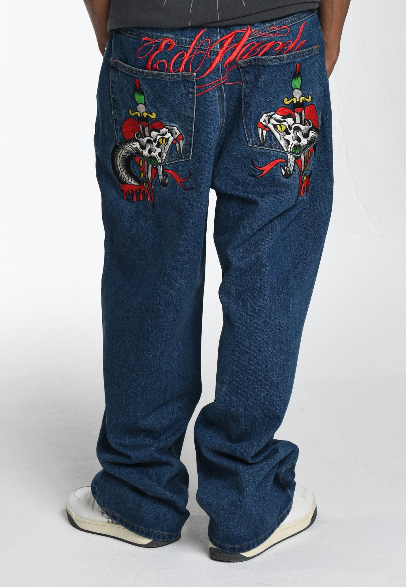 Estes jeans apresentam impressionantes bordados em cores carmesim em ambos os bolsos. Enquanto a inconfundível assinatura e monogramas de Ed Hardy adicionam um toque de assinatura. Confeccionado em jeans 100% algodão.