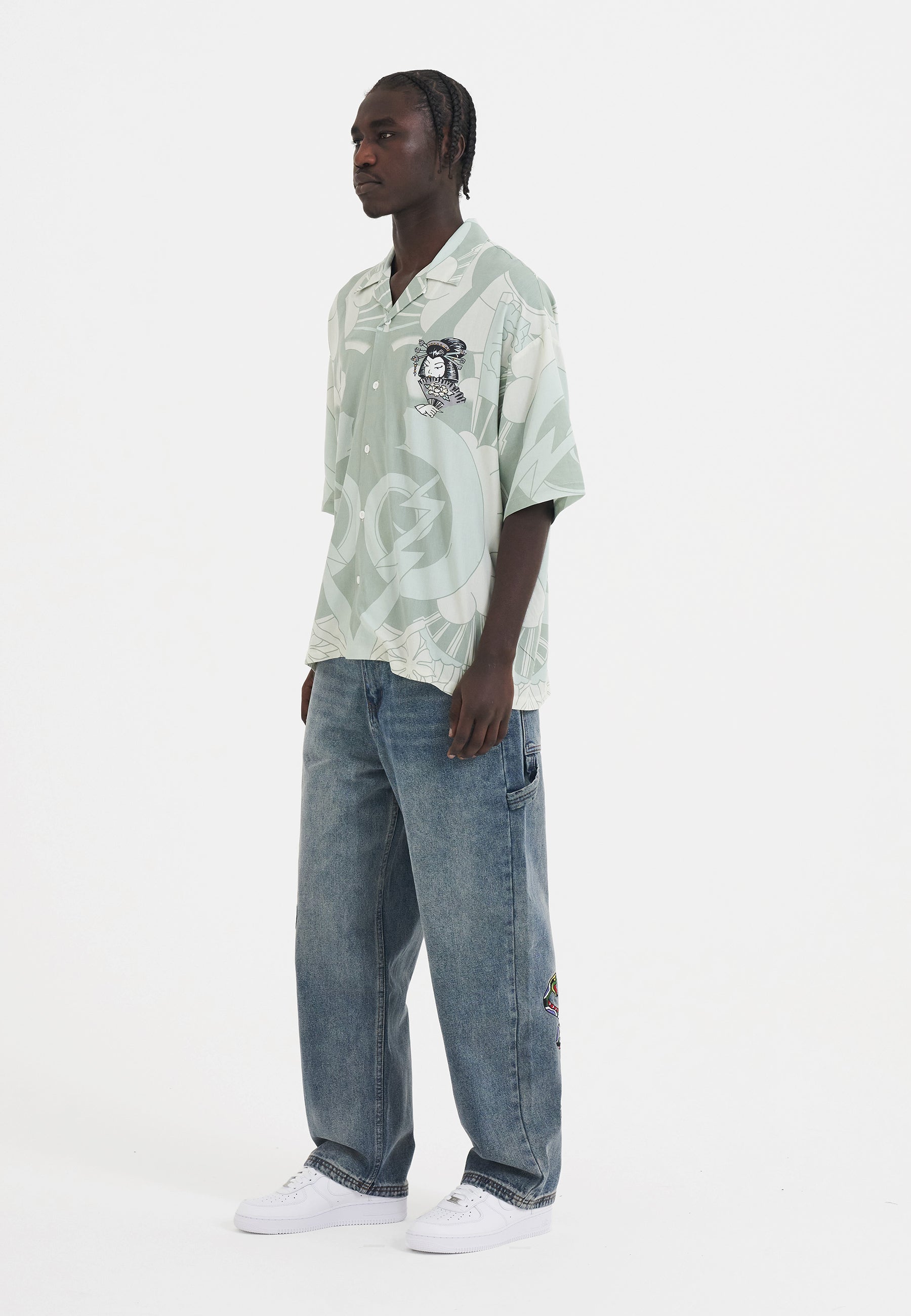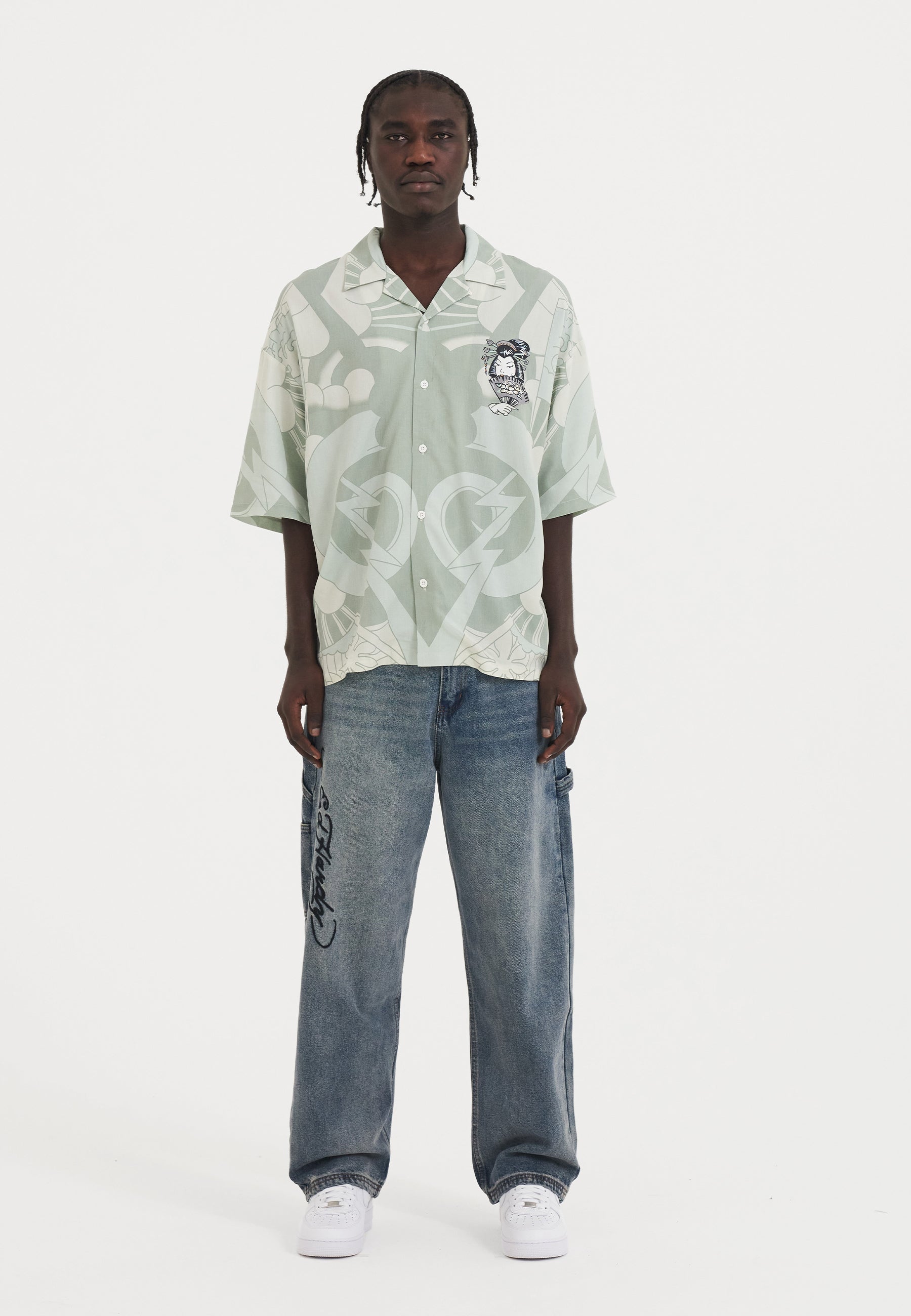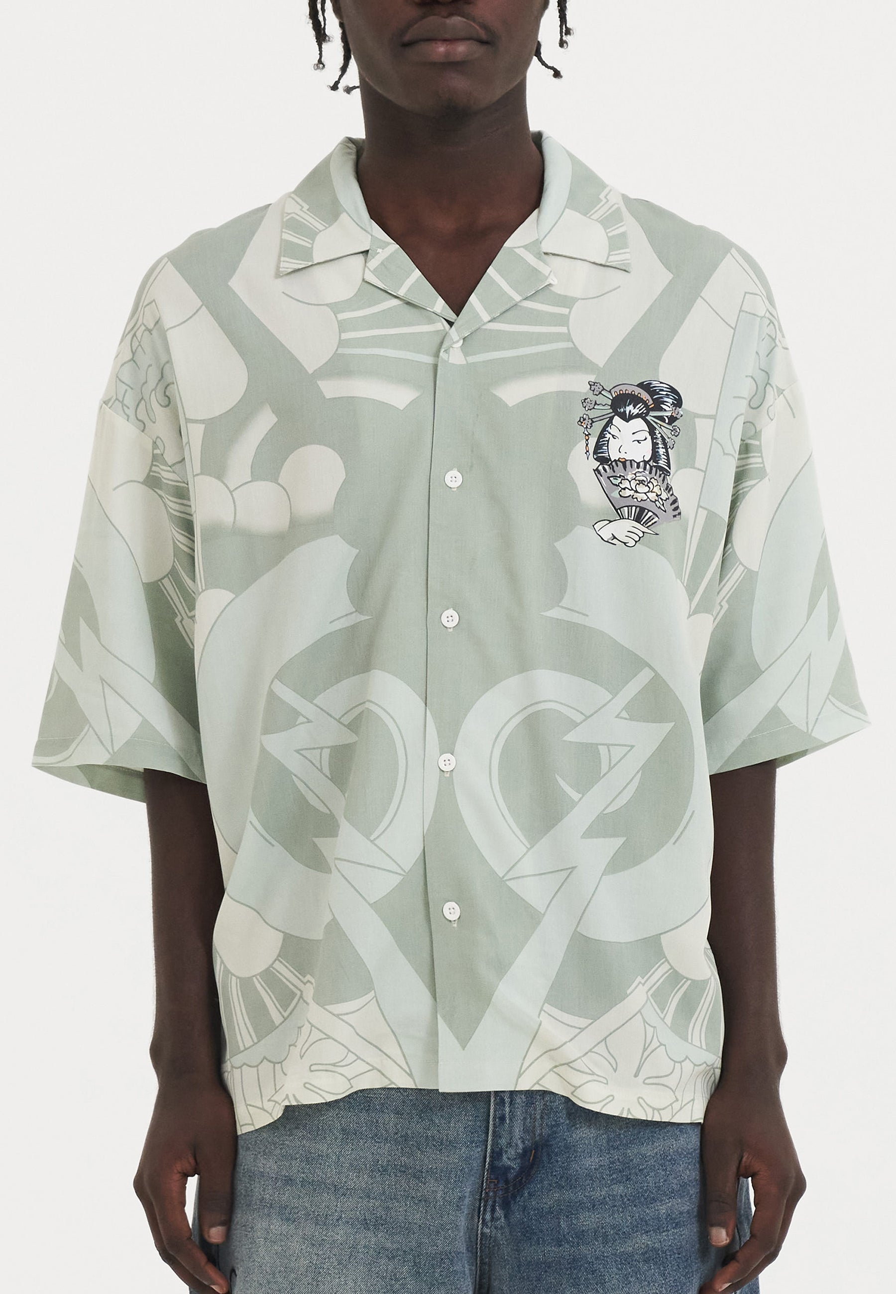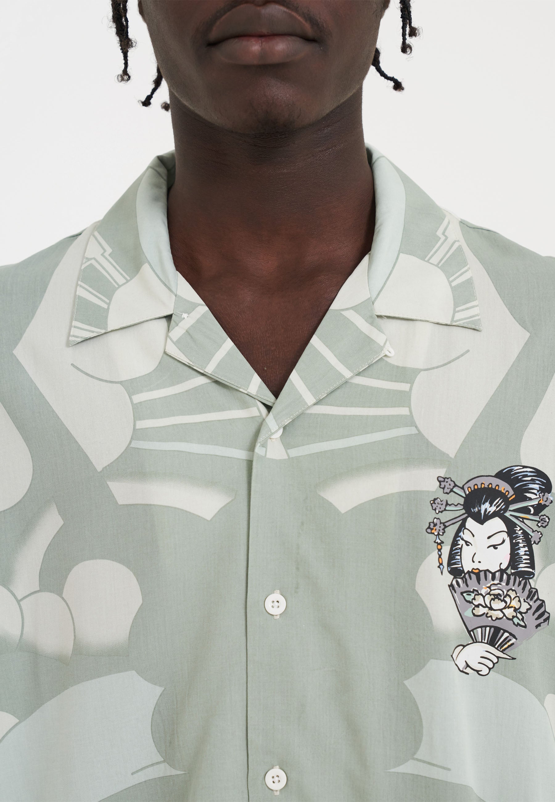 Camisa masculina de manga curta Geisha Fan Camp - verde claro/branco