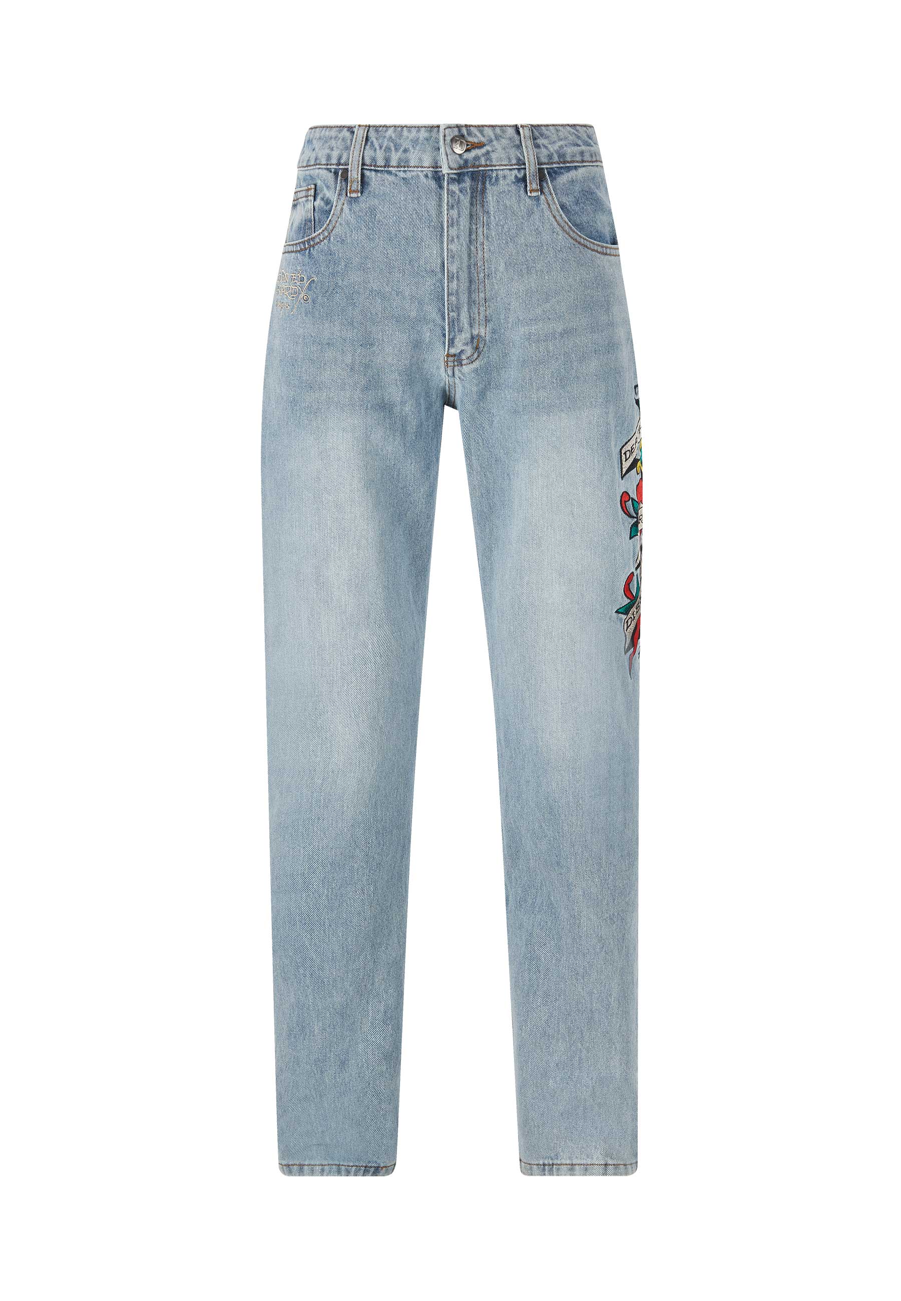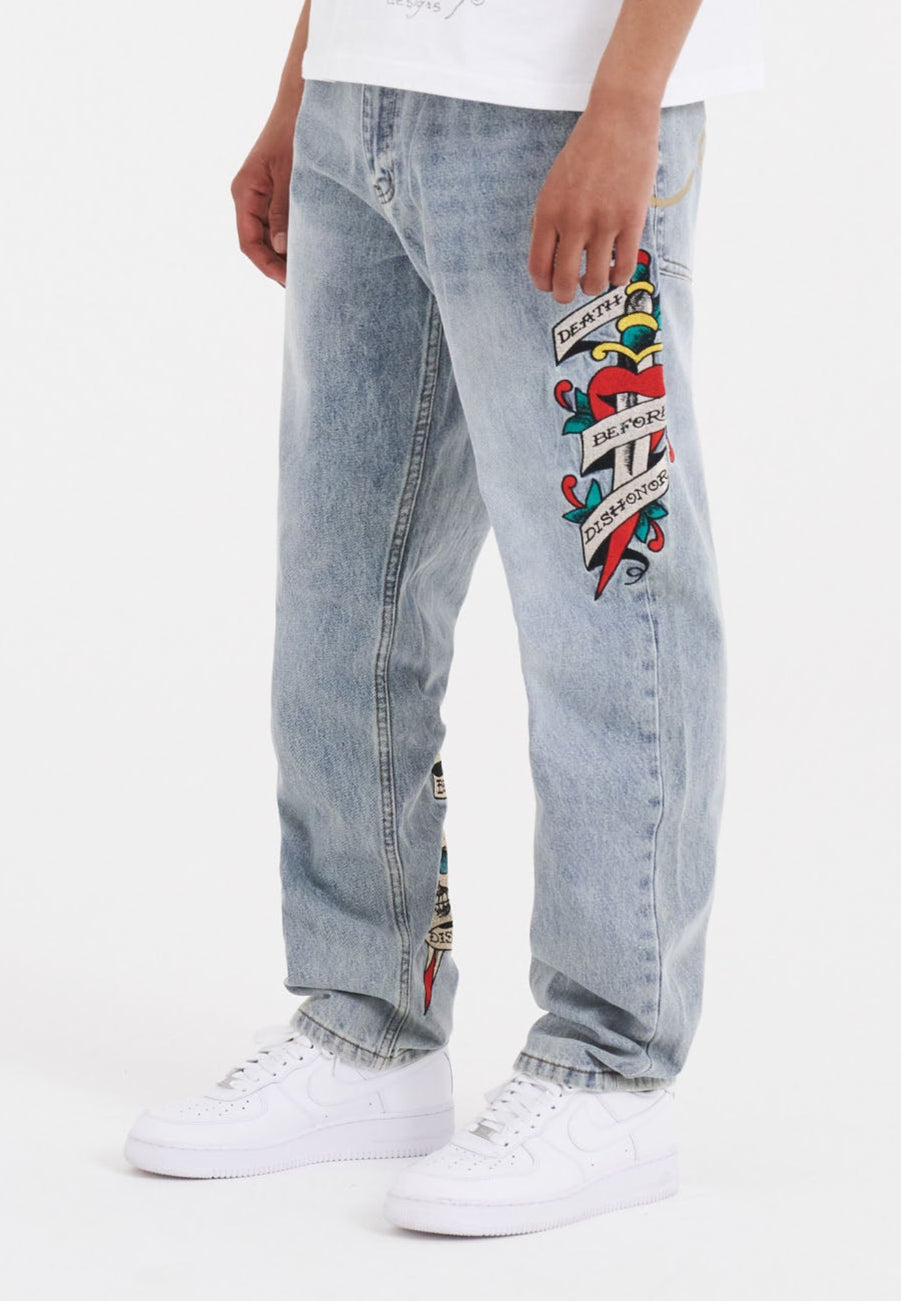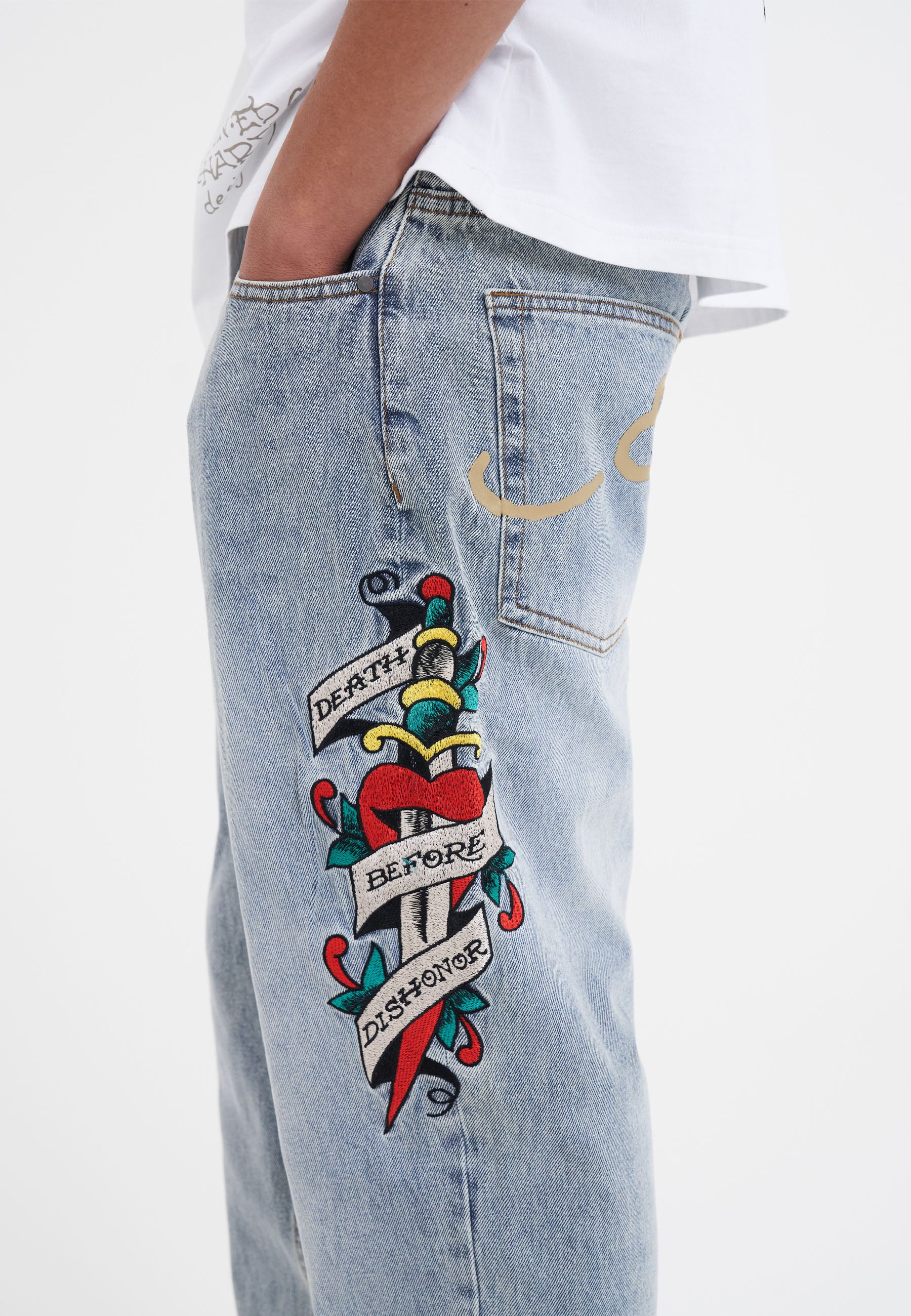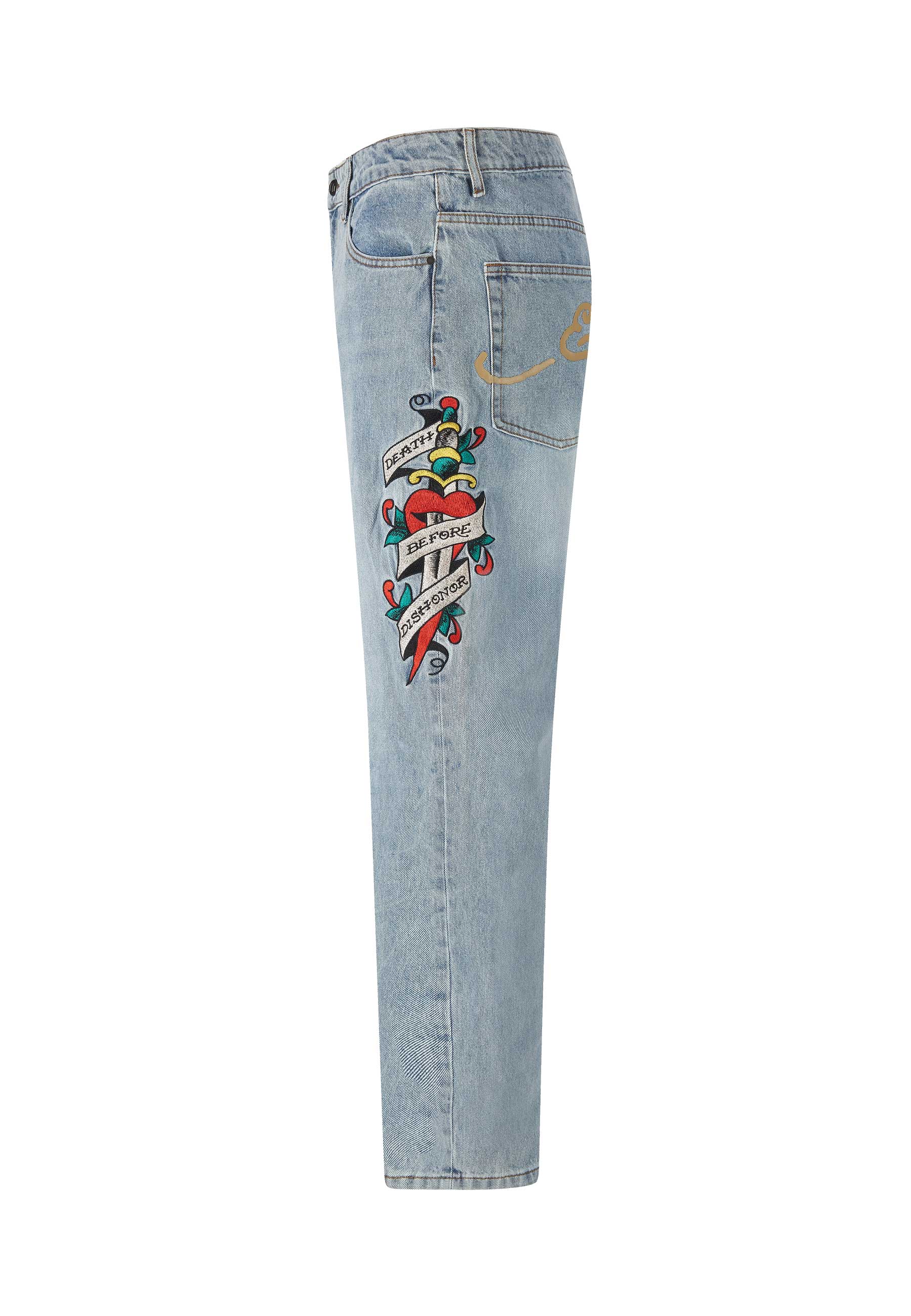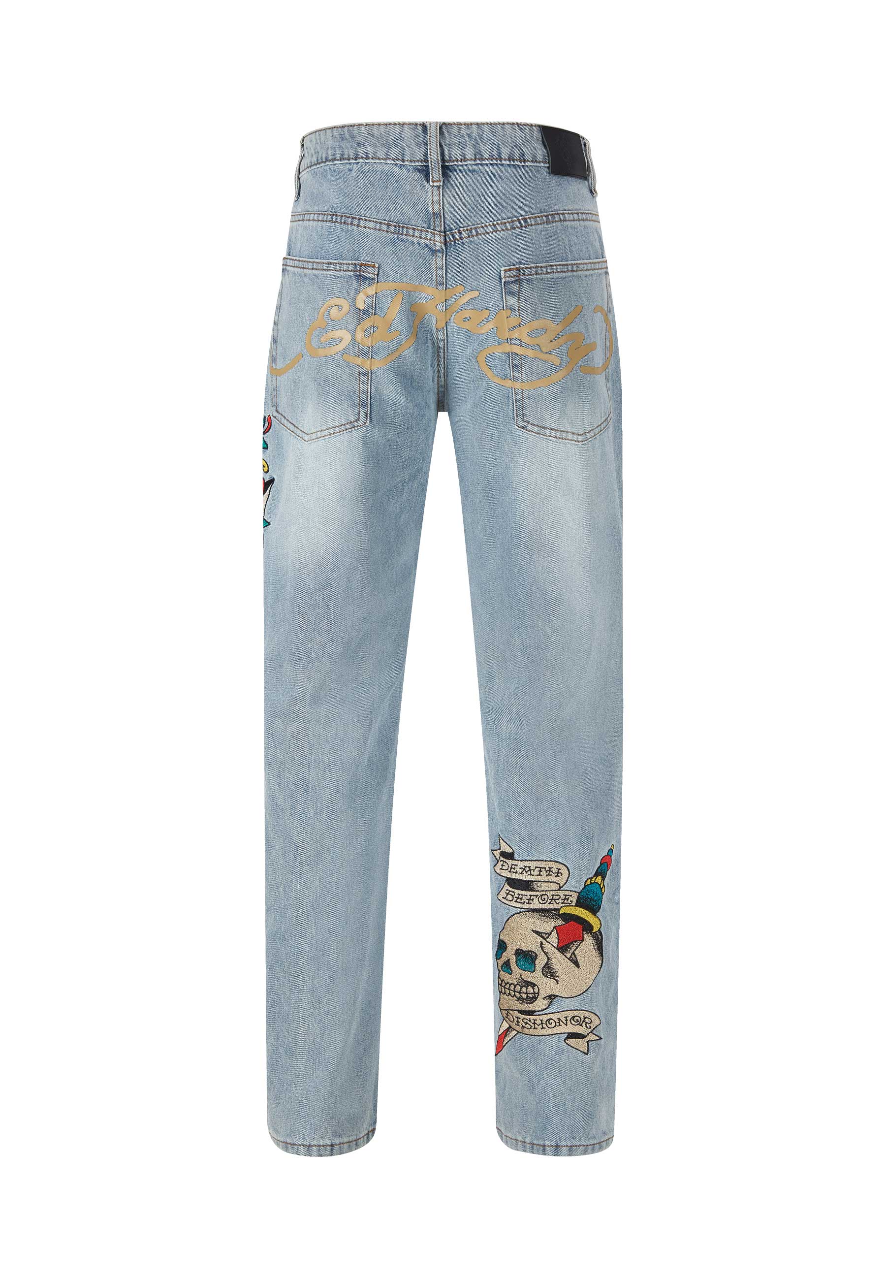 O clássico jeans azul com lavagem com água sanitária é a sua tela para autoexpressão; apresentando bordados coloridos intrincados mostrando os desenhos icônicos das tatuagens de Ed em ambas as pernas. Na parte de trás, uma assinatura proeminente de Ed Hardy ostenta os dois bolsos traseiros.