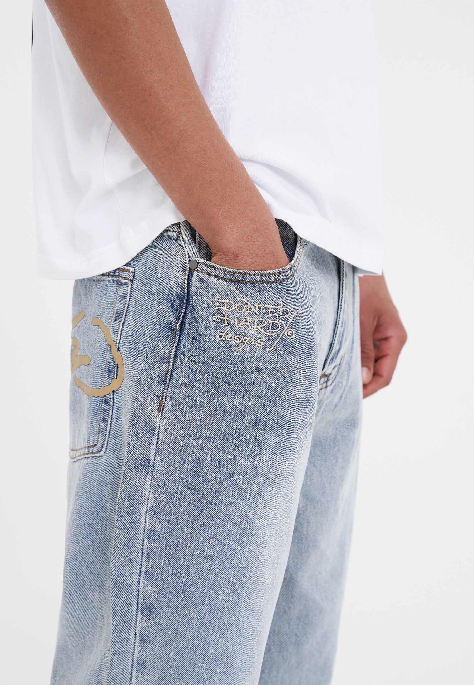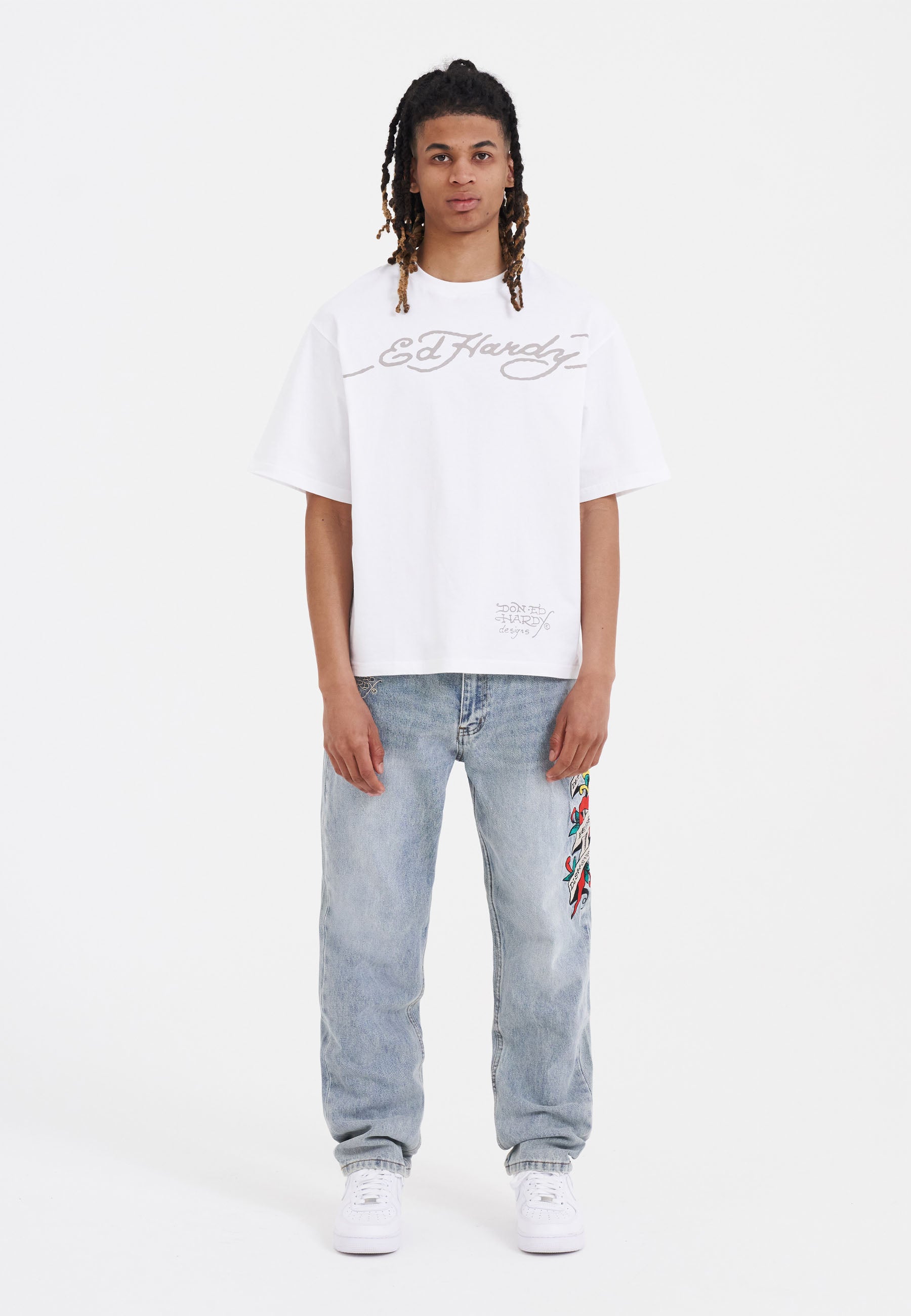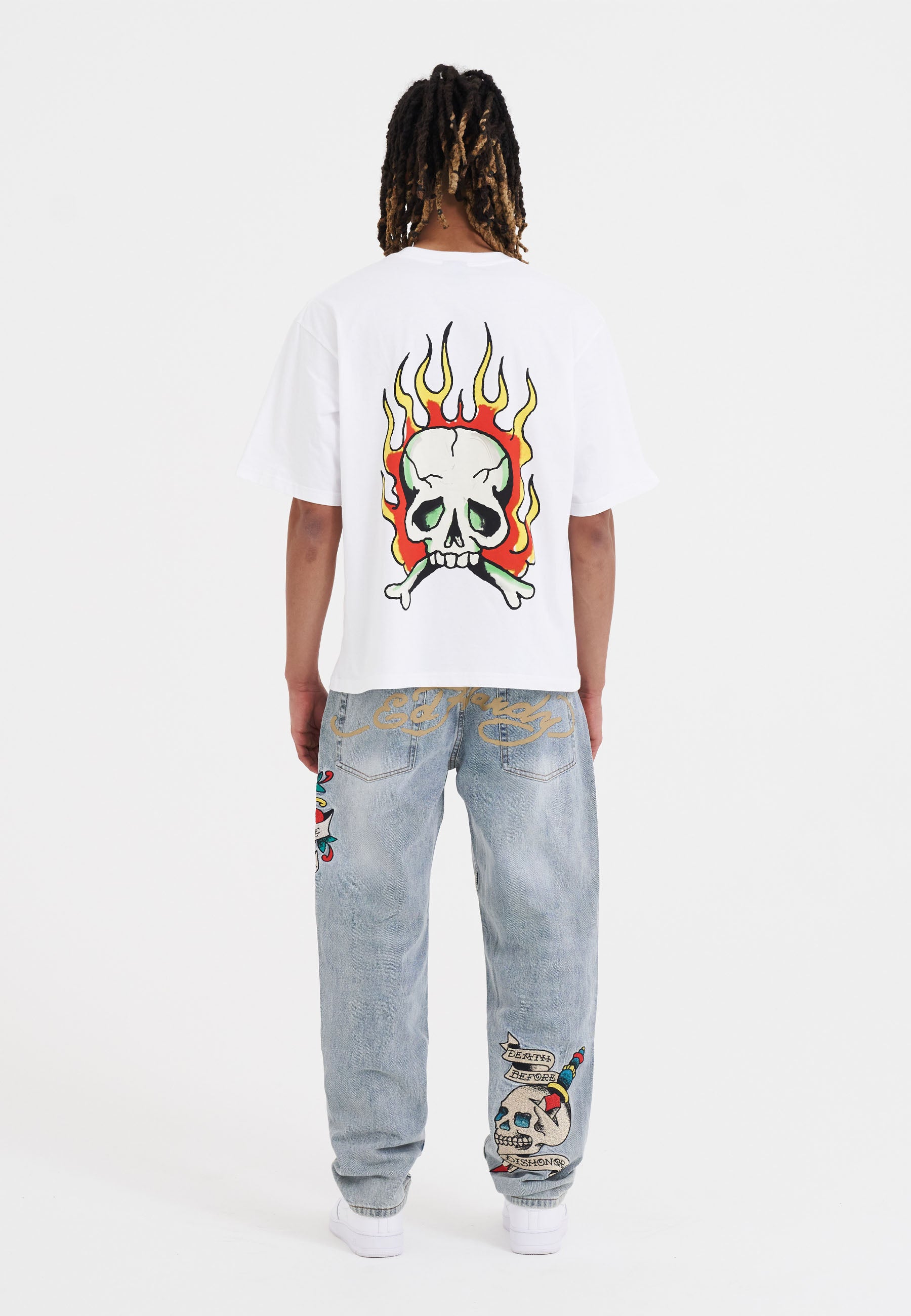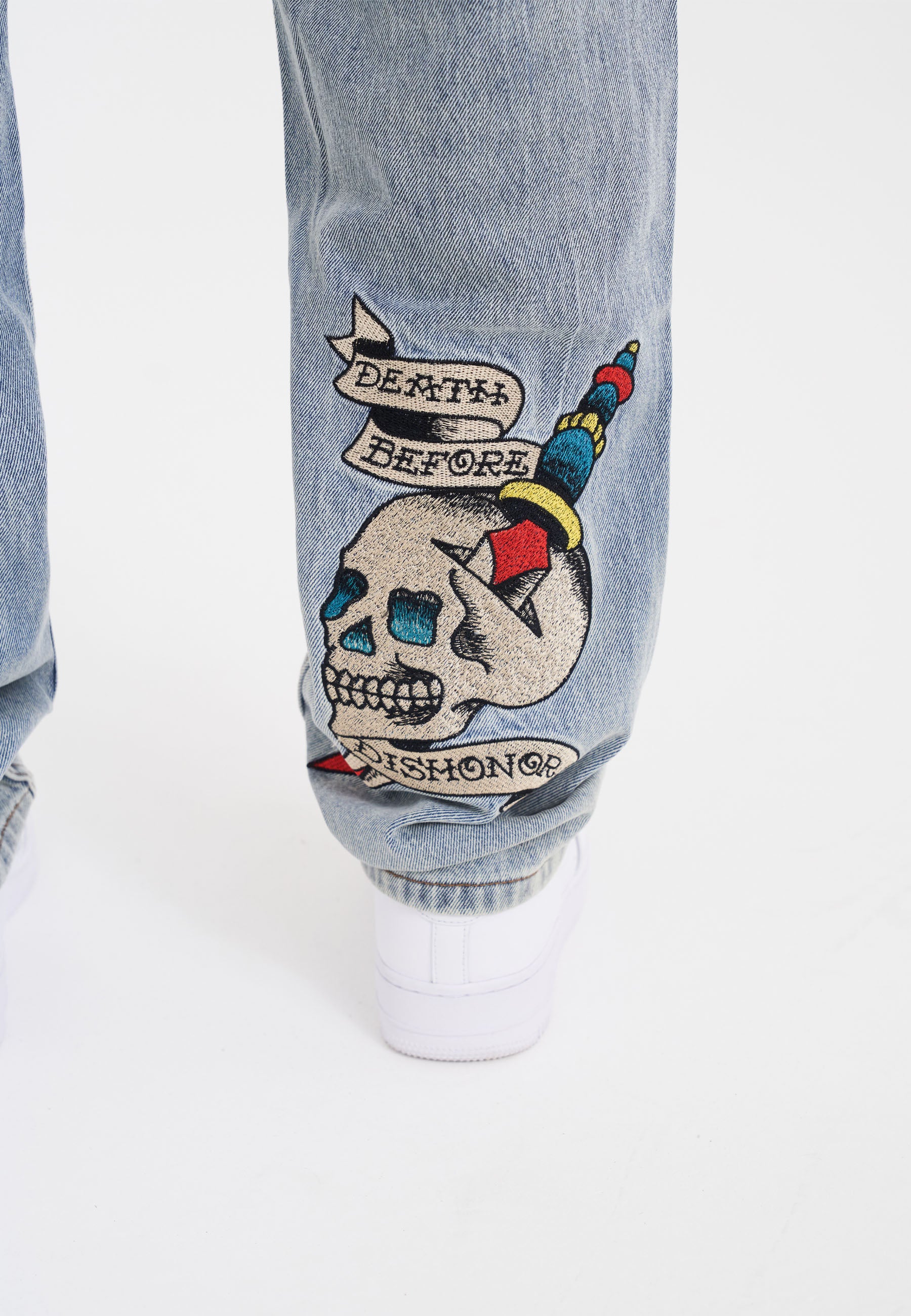 O clássico jeans azul com lavagem com água sanitária é a sua tela para autoexpressão; apresentando bordados coloridos intrincados mostrando os desenhos icônicos das tatuagens de Ed em ambas as pernas. Na parte de trás, uma assinatura proeminente de Ed Hardy ostenta os dois bolsos traseiros.