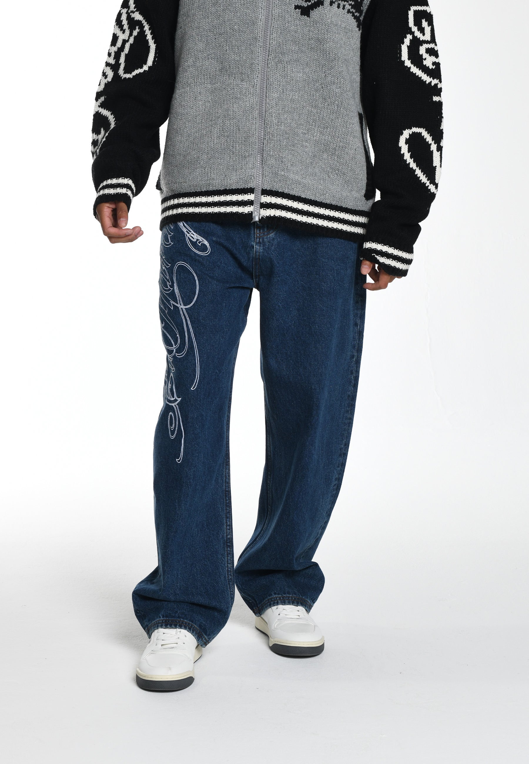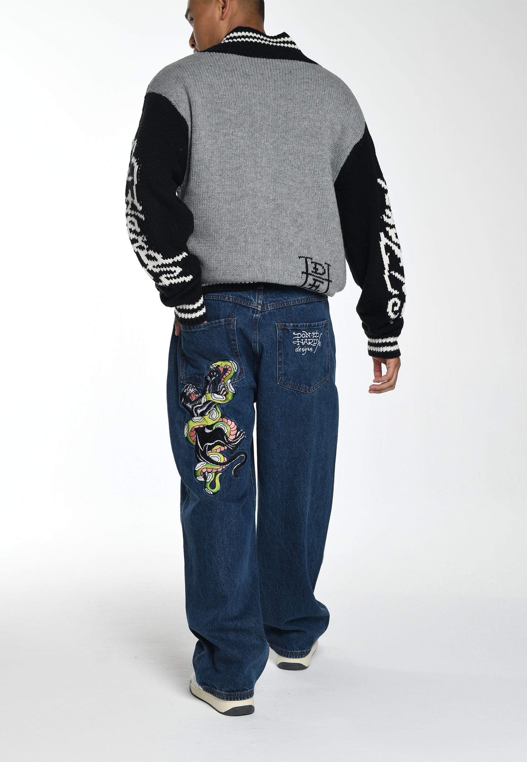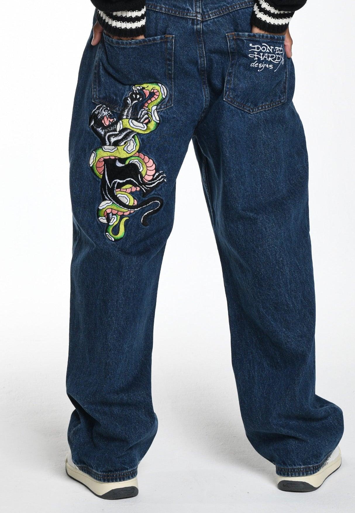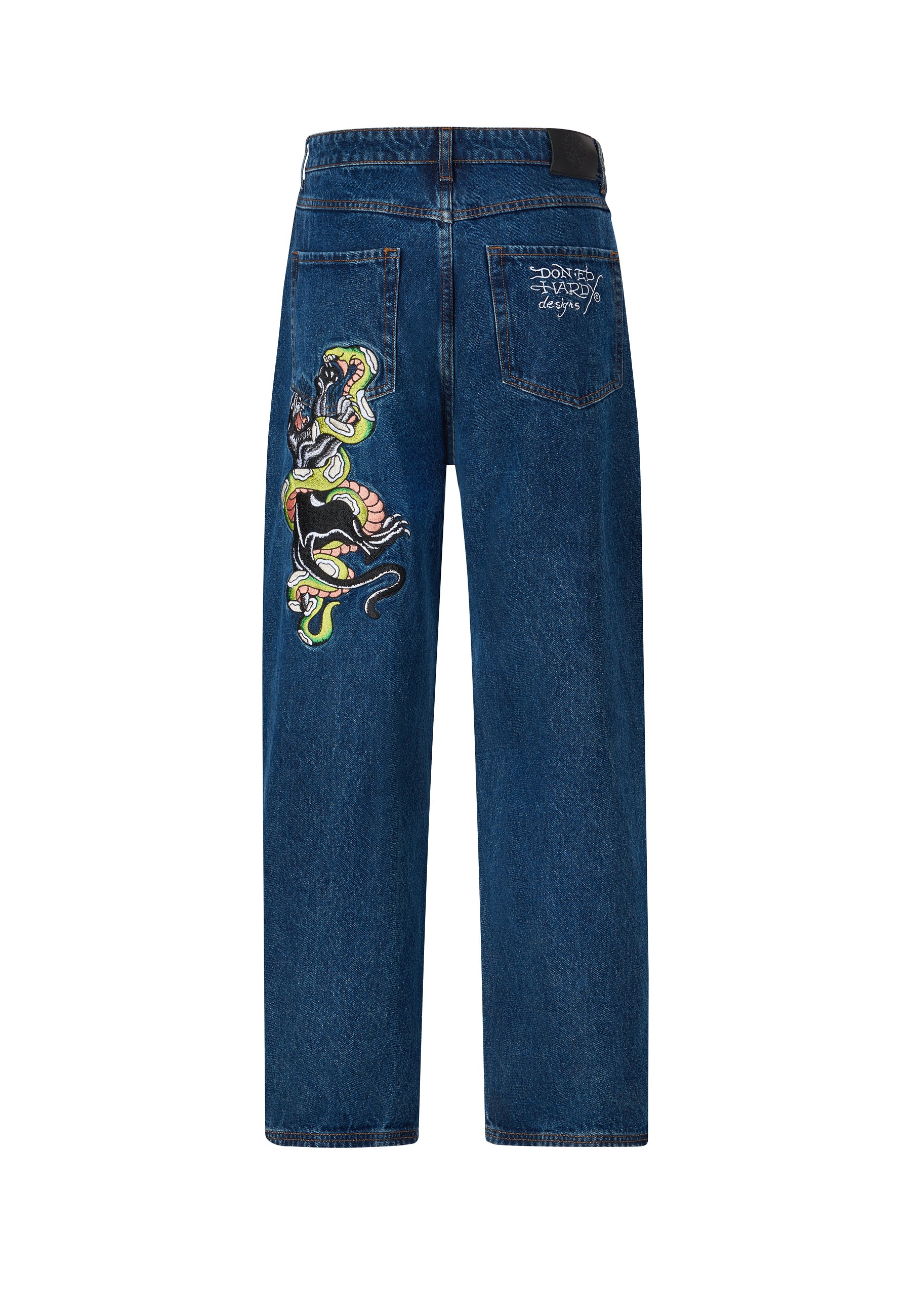 Canalize o espírito da cultura do skate e da arte clássica da tatuagem com nossos Jeans Panther Slither Relaxed. Esses jeans homenageiam a era da moda dos anos 90 , abraçando a estética descolada que influenciou o trabalho icônico de Ed Hardy.