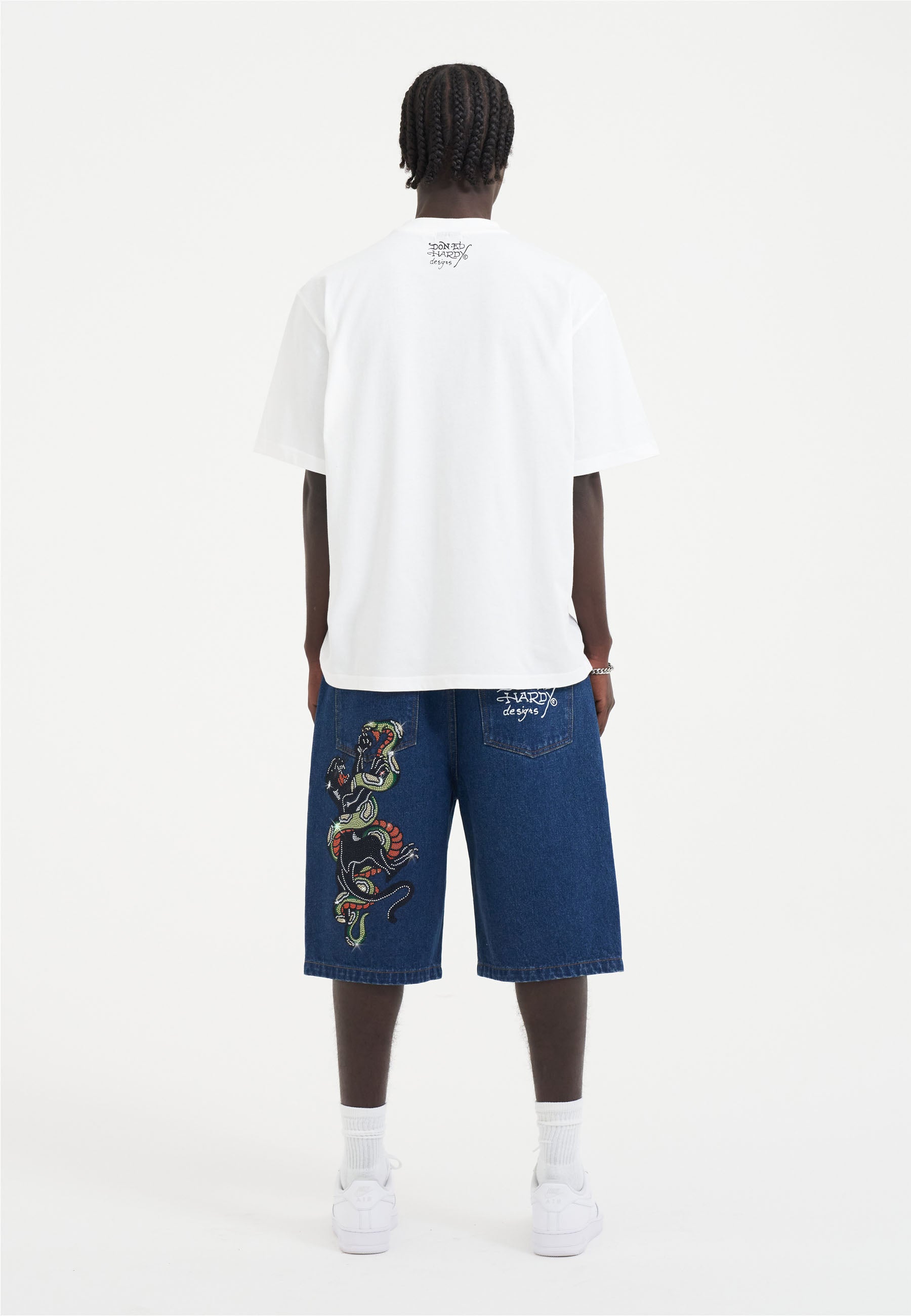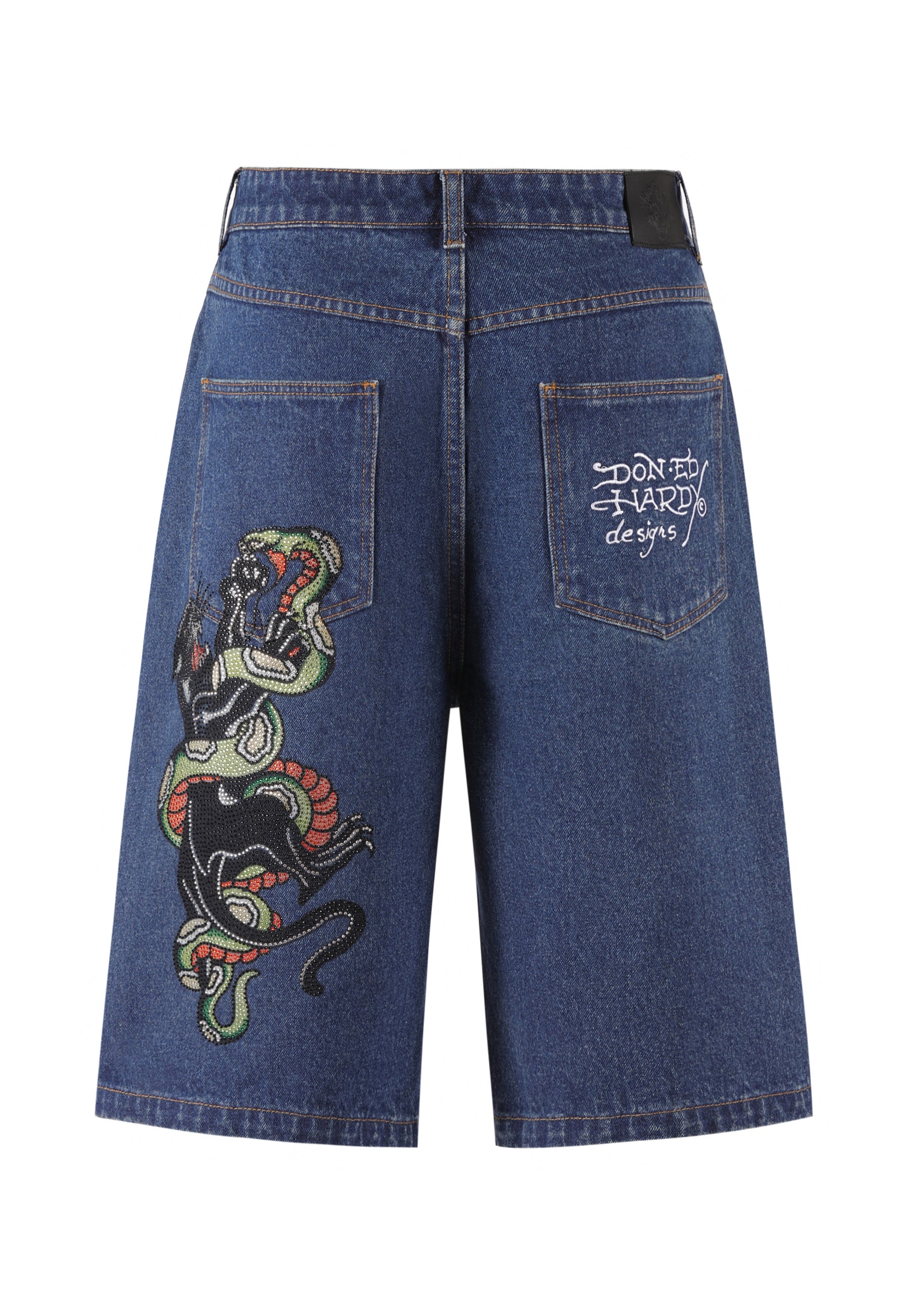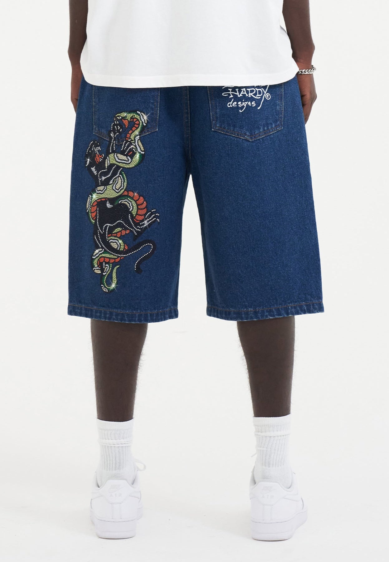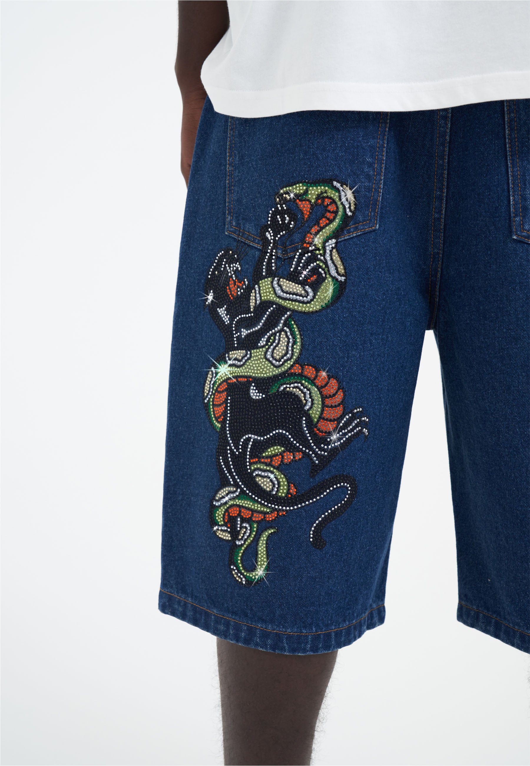 Mens Panther Snake Diamante Denim Jorts Shorts - Indigo