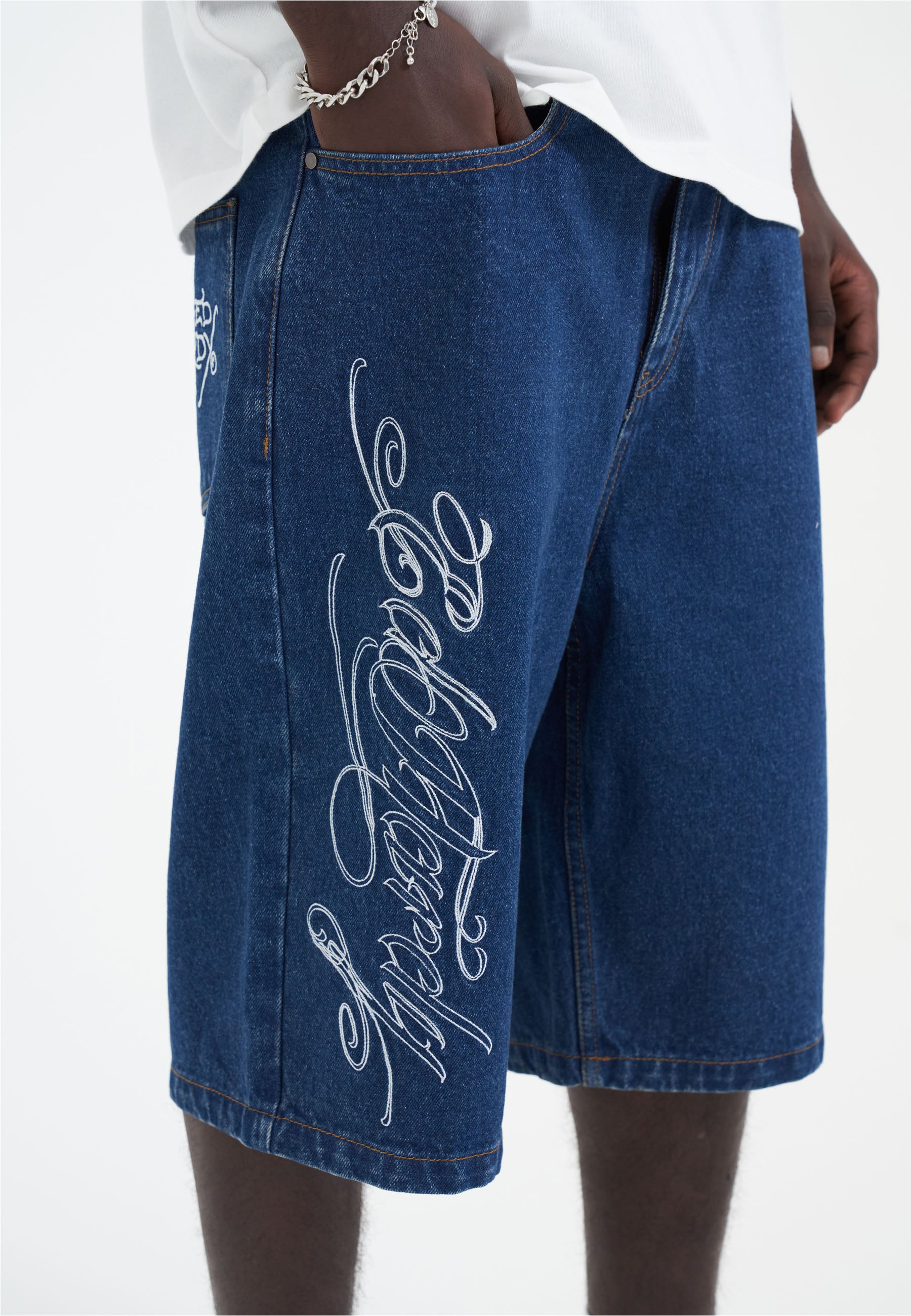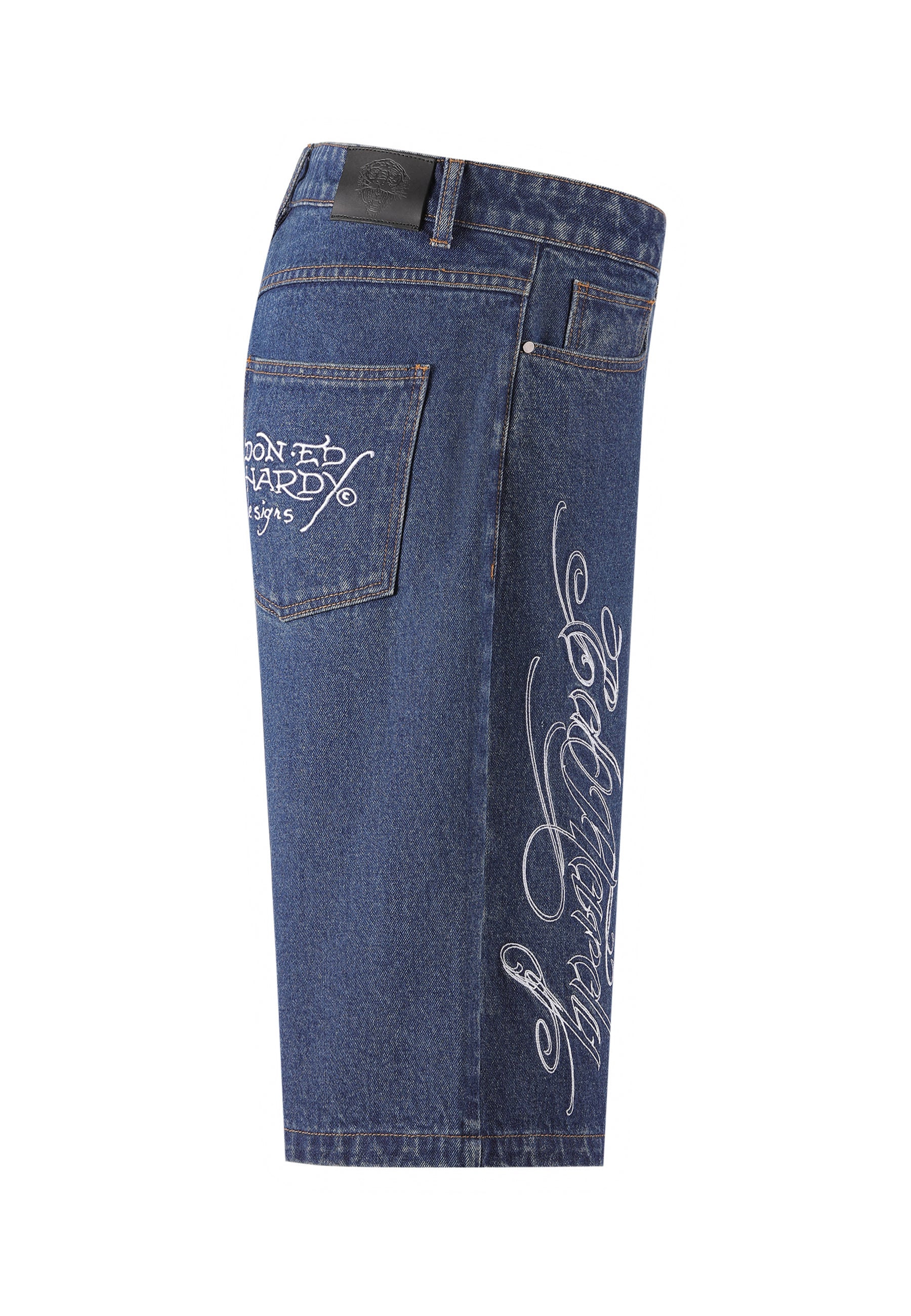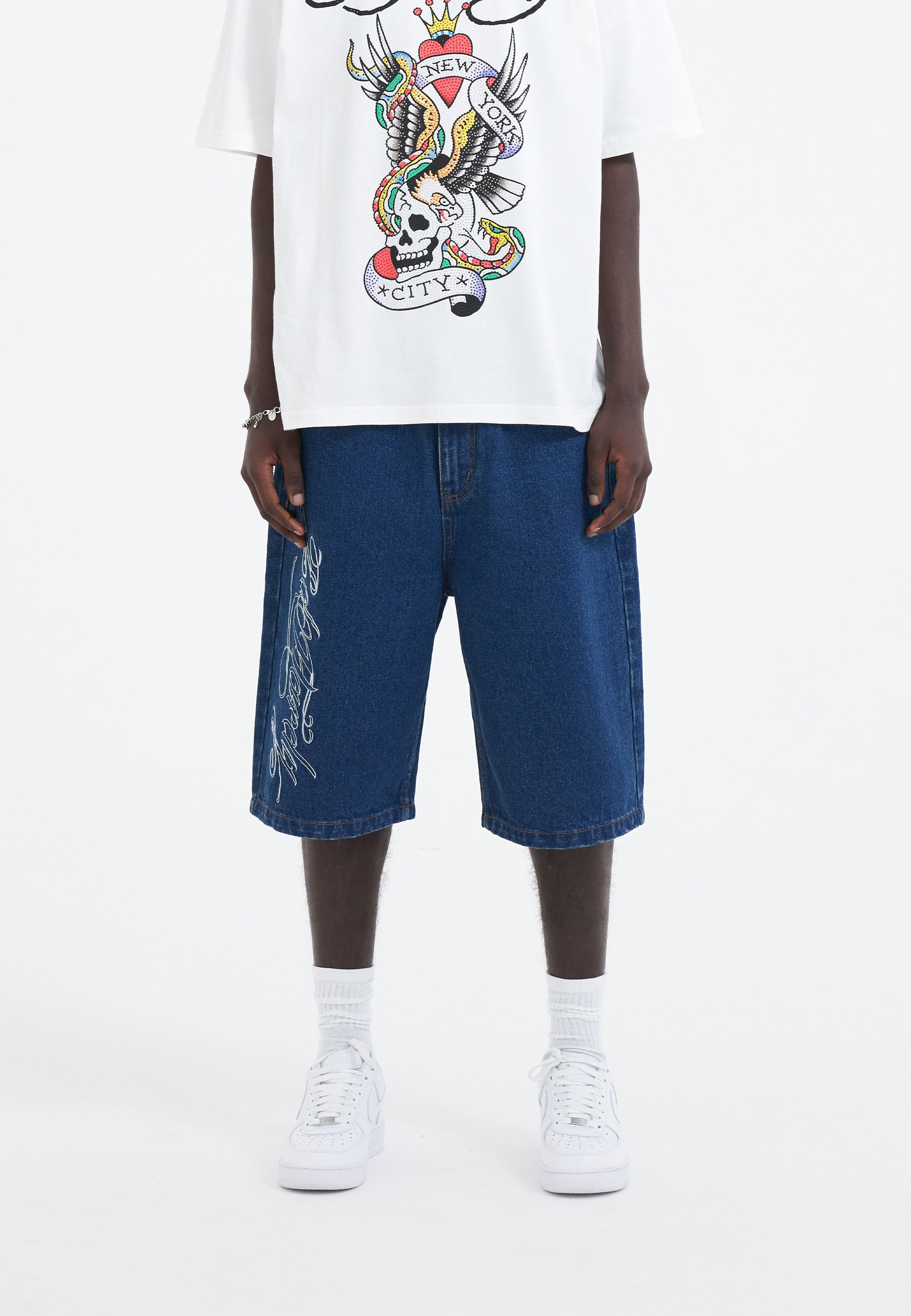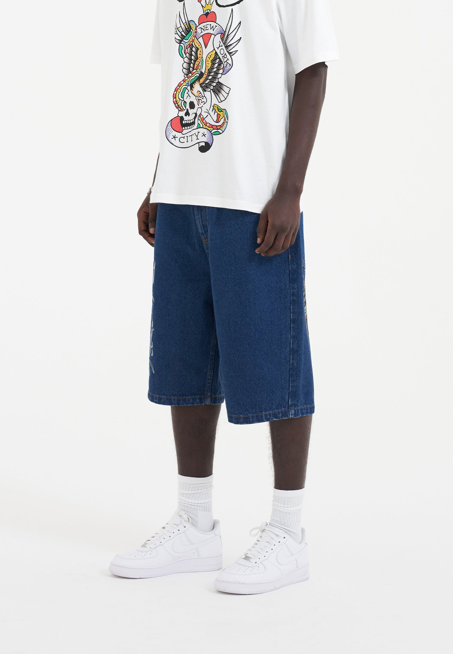Mens Panther Snake Diamante Denim Jorts Shorts - Indigo